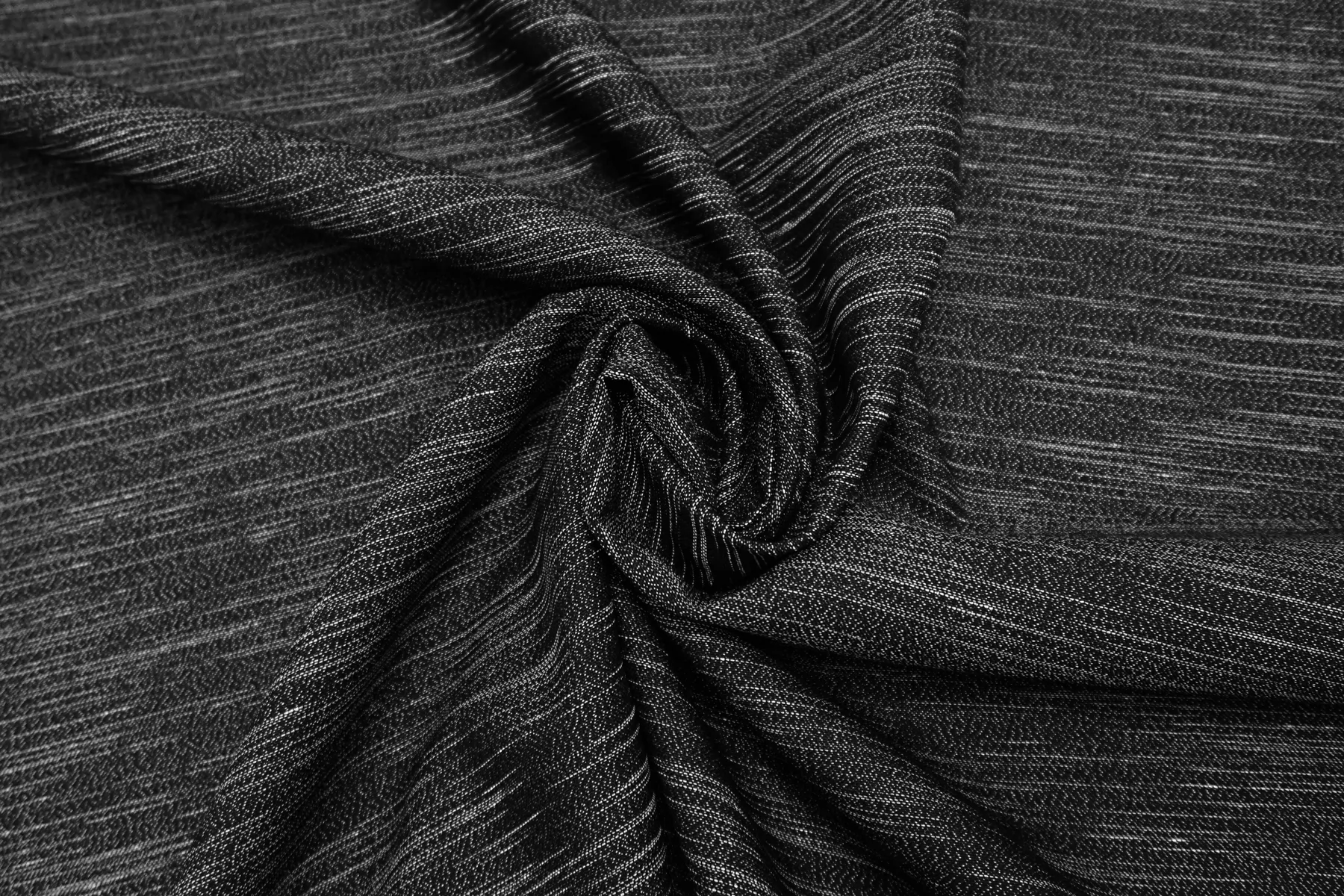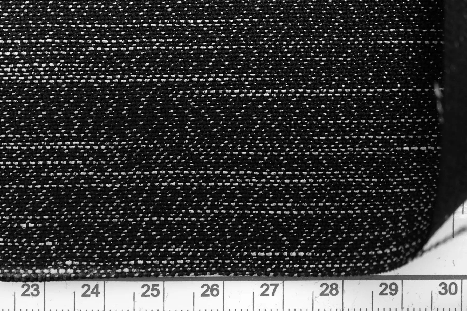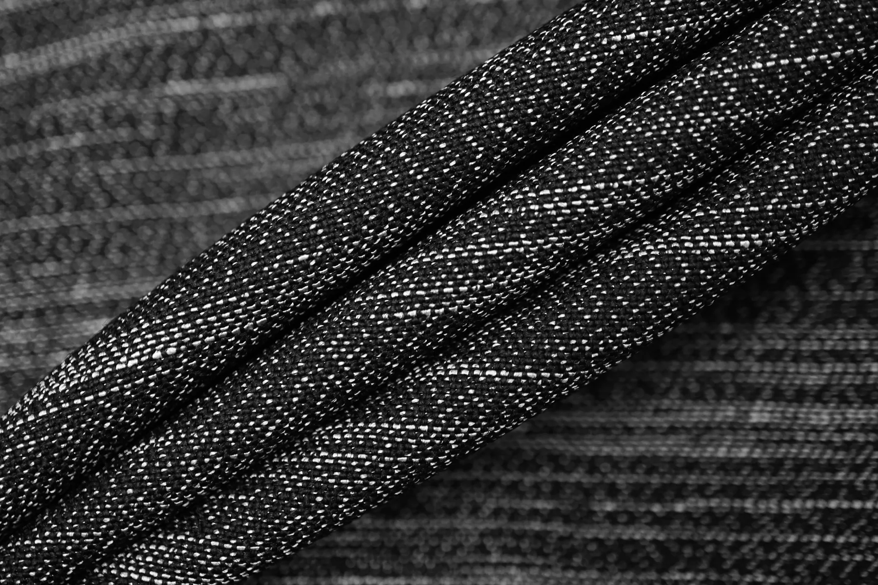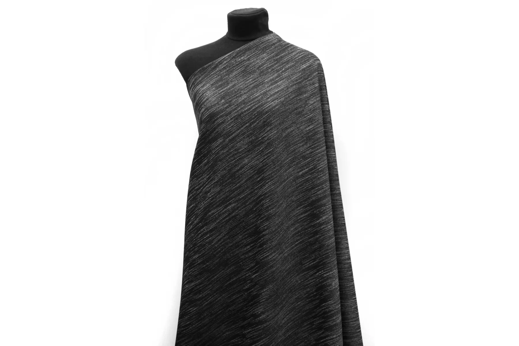 Очень интересная костюмная шерсть с добавлением льна из переплетения черных и светло-серых нитей образующих хаотичные поперечные полосы. Светло-серые нити - лен, черные - шерсть. Тактильно суховатая и шероховатая. Немного колется. Плотная, при этом достаточно пластичная. Держит складки. Не просвечивает. Не тянется. Не мнется. Идеальный осенний и зимний вариант на стильные костюмы, брюки, юбки или жакеты. Уход деликатный