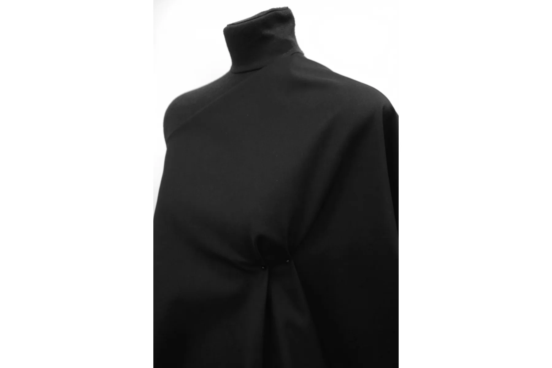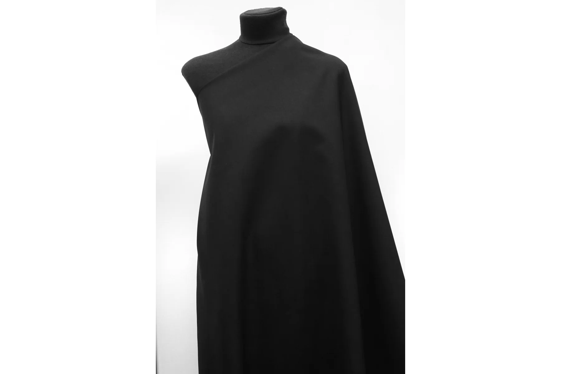 Костюмная шерсть диагонального плетения в классическом чёрном цвете с небольшой добавкой полиэстера. Тактильно сухая, покалывает. Плотная но не толстая. Упругая пластика, образовывает объемные складки. Не тянется, просвечивает минимально в один слой, практически не мнётся. Подойдет для пошива костюмов. Уход, как за шерстью - деликатный. Учитывайте усадку.