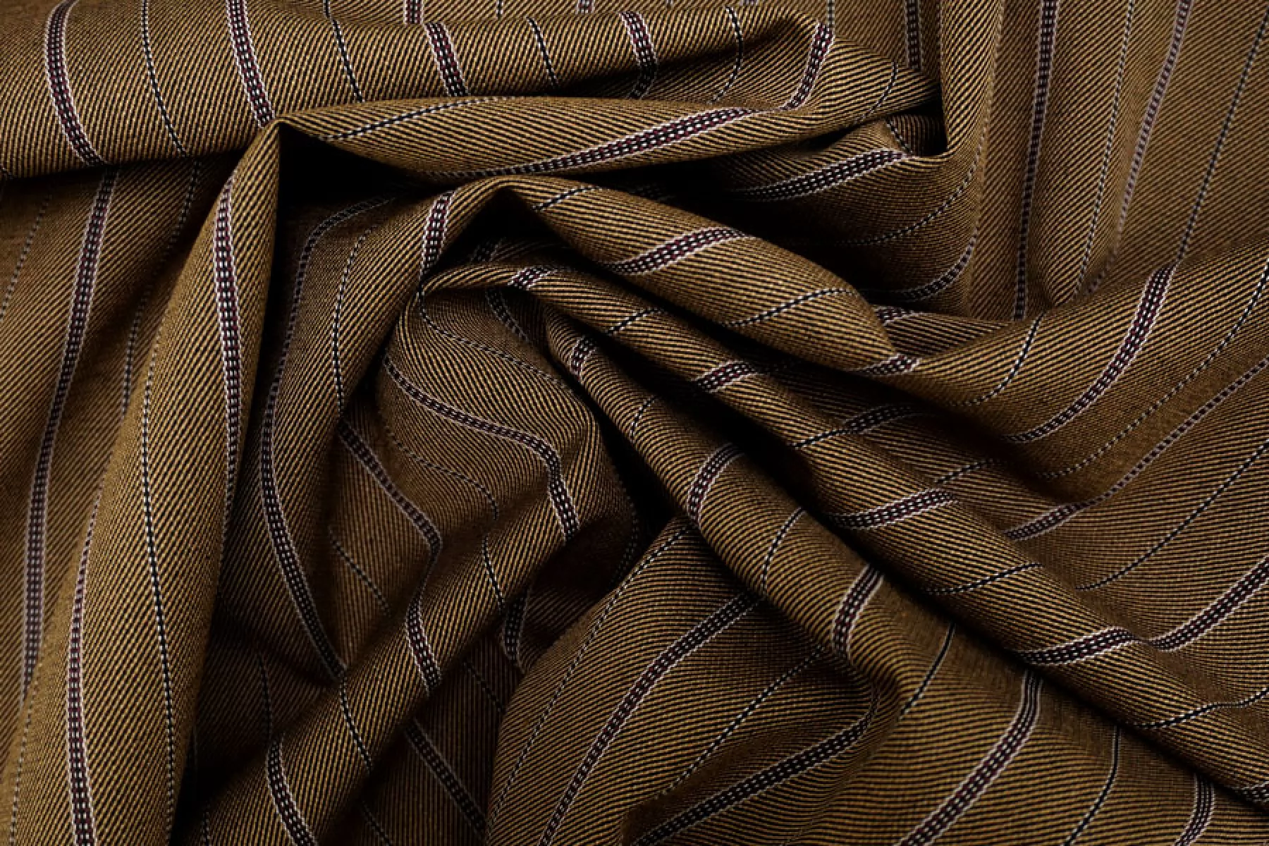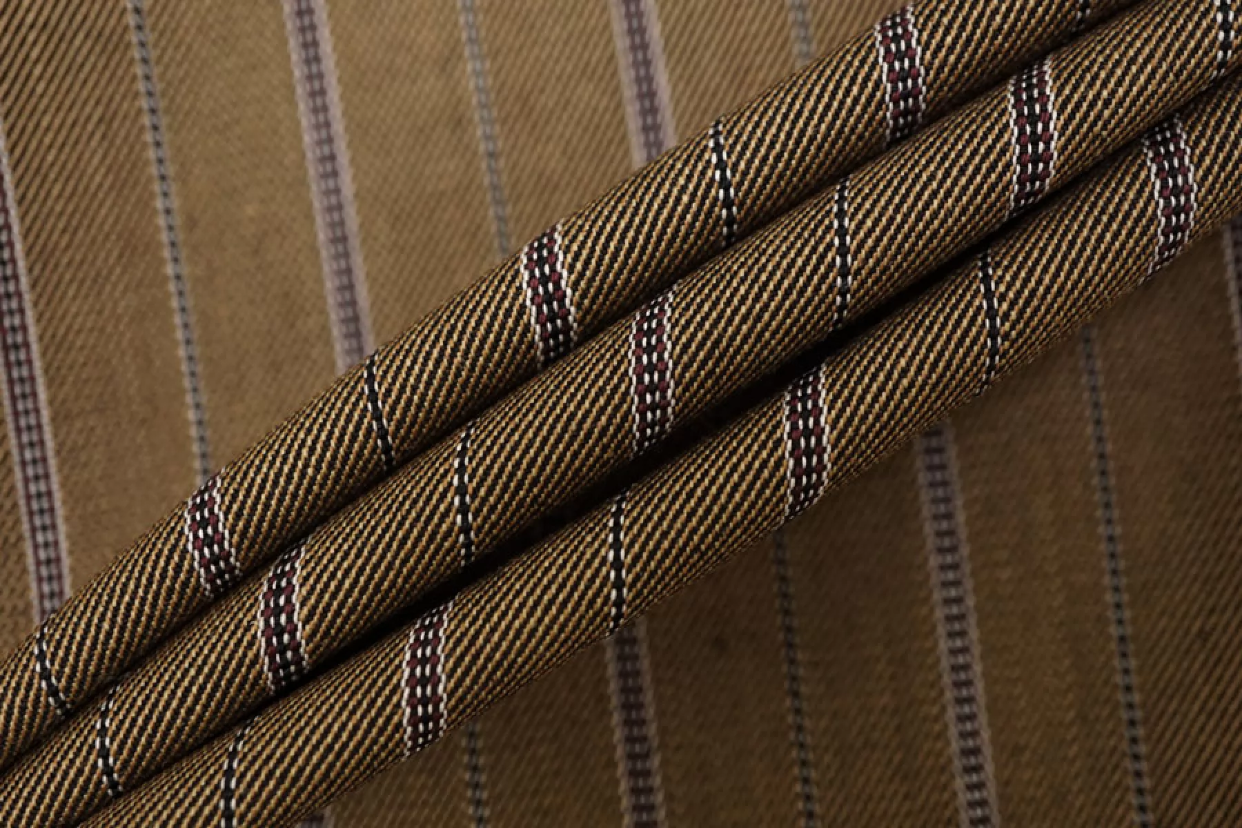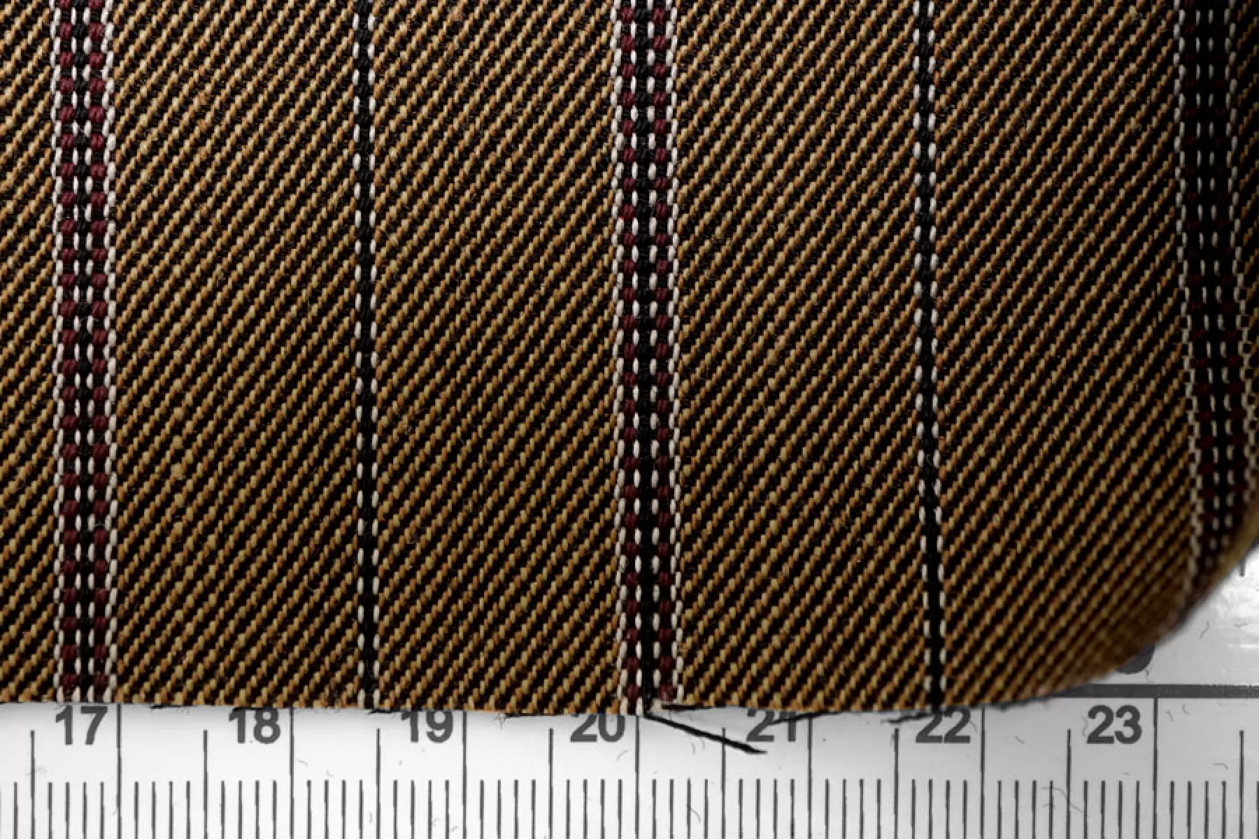 Интересная костюмная вирджинская шерсть, в основе диагональное переплетение нитей чёрных и светло-коричневых нитей, плюс продольные полосы из светло-серых и бордовых нитей. Ткань довольно плотная, немного суховатая. Не просвечивает. Не тянется. Форму держит, средняя по пластичности. Не мнется. Отличный вариант на костюмы (в том числе и мужские), юбки. Уход за материалом деликатный.