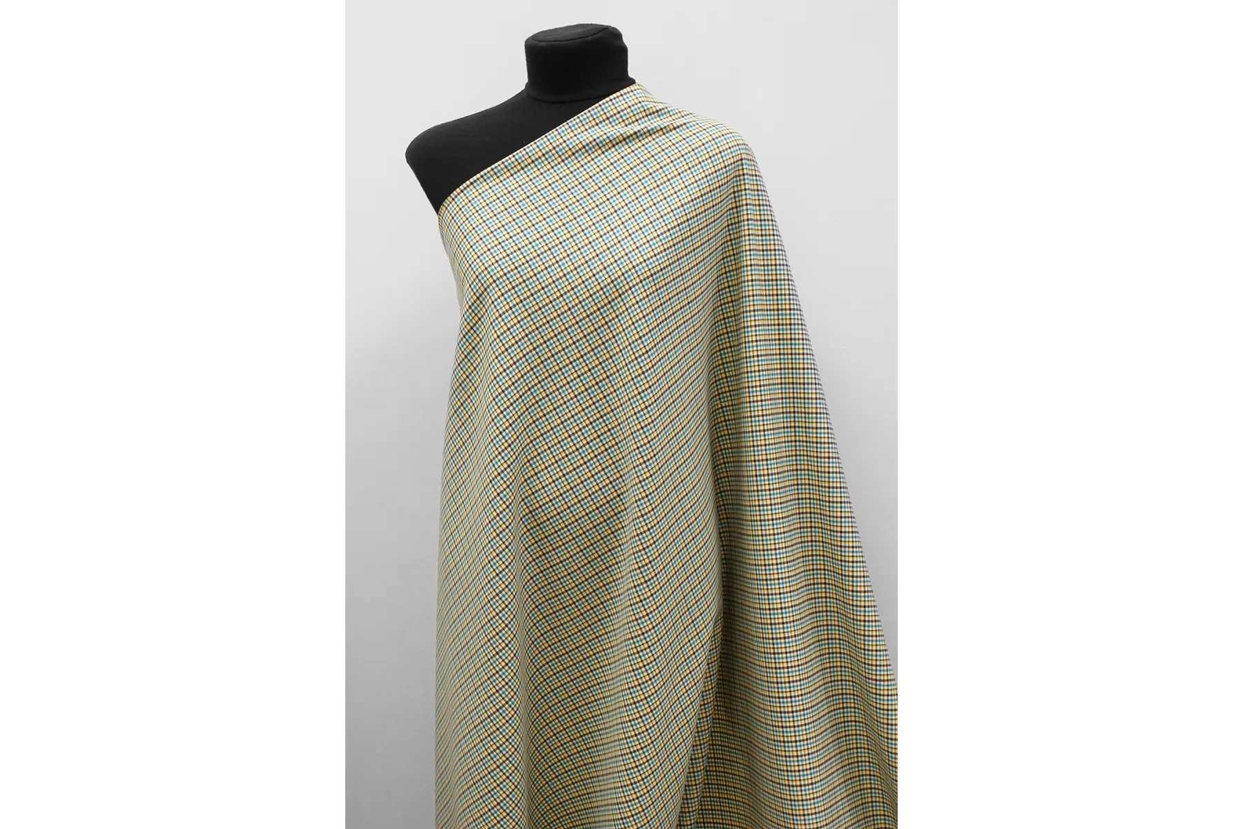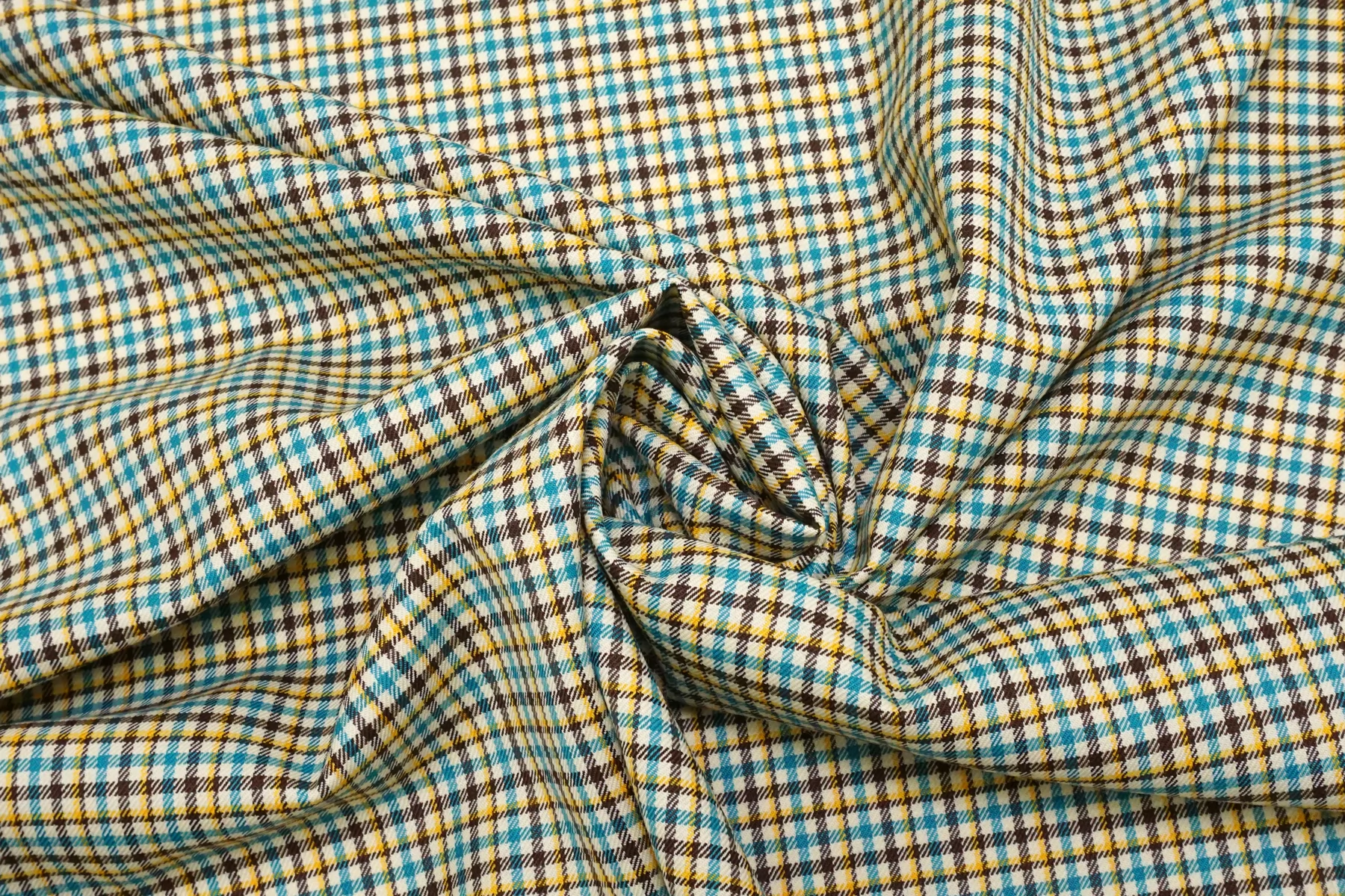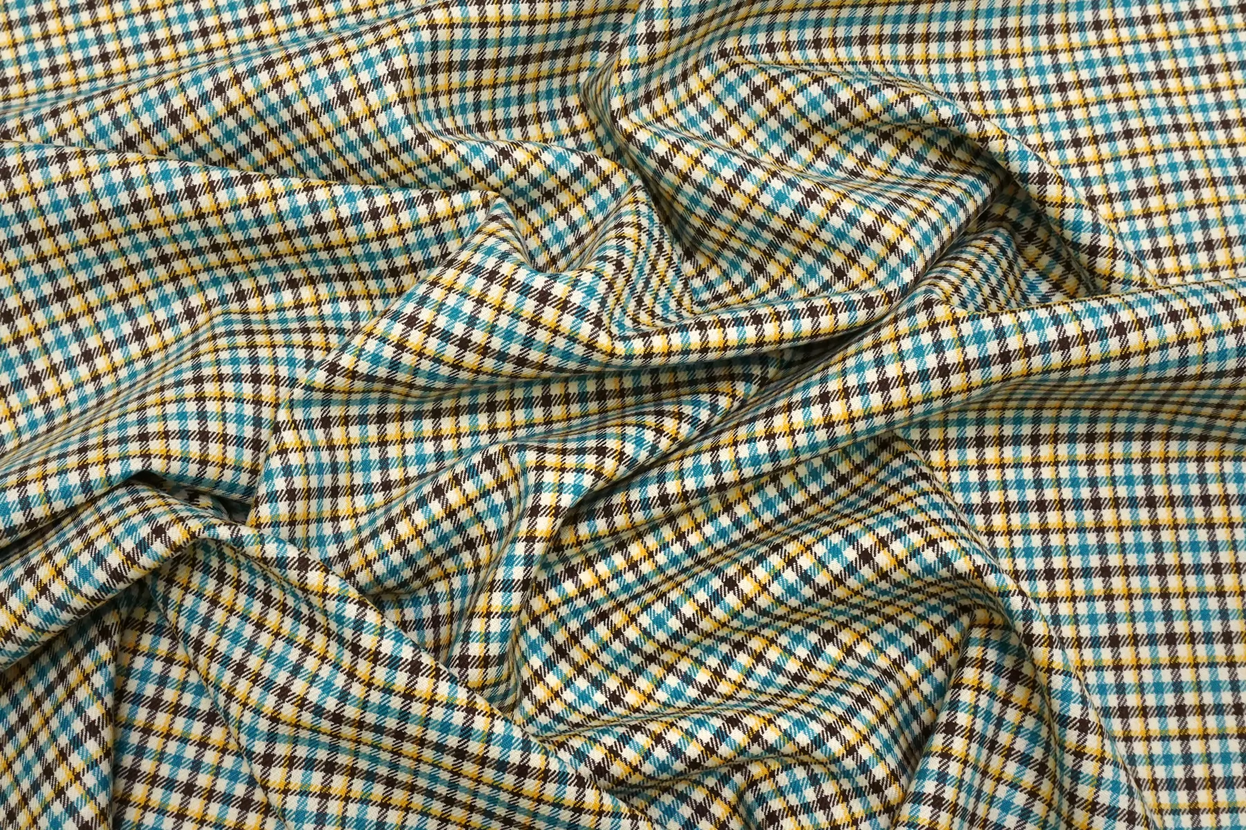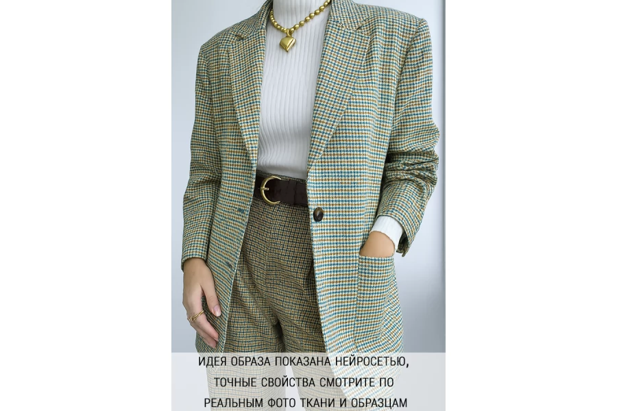 Прекрасная костюмная вирджинская шерсть в клетку от бренда Gucci из нитей молочно-бежевого, жёлтого, бирюзового и тёмно-коричневого цвета. Тактильно гладкая, плотная, но достаточно тонкая. Чувствуется, что шерсть, при этом не колется. Не просвечивает. Плетение совсем немного тянется. Хорошо драпируется и умеренно держит форму. Не мнется. Отличный вариант на костюмы, жакеты мягкой формы, платья, брюки, тёплые рубашки и не только. Уход за материалом деликатный.