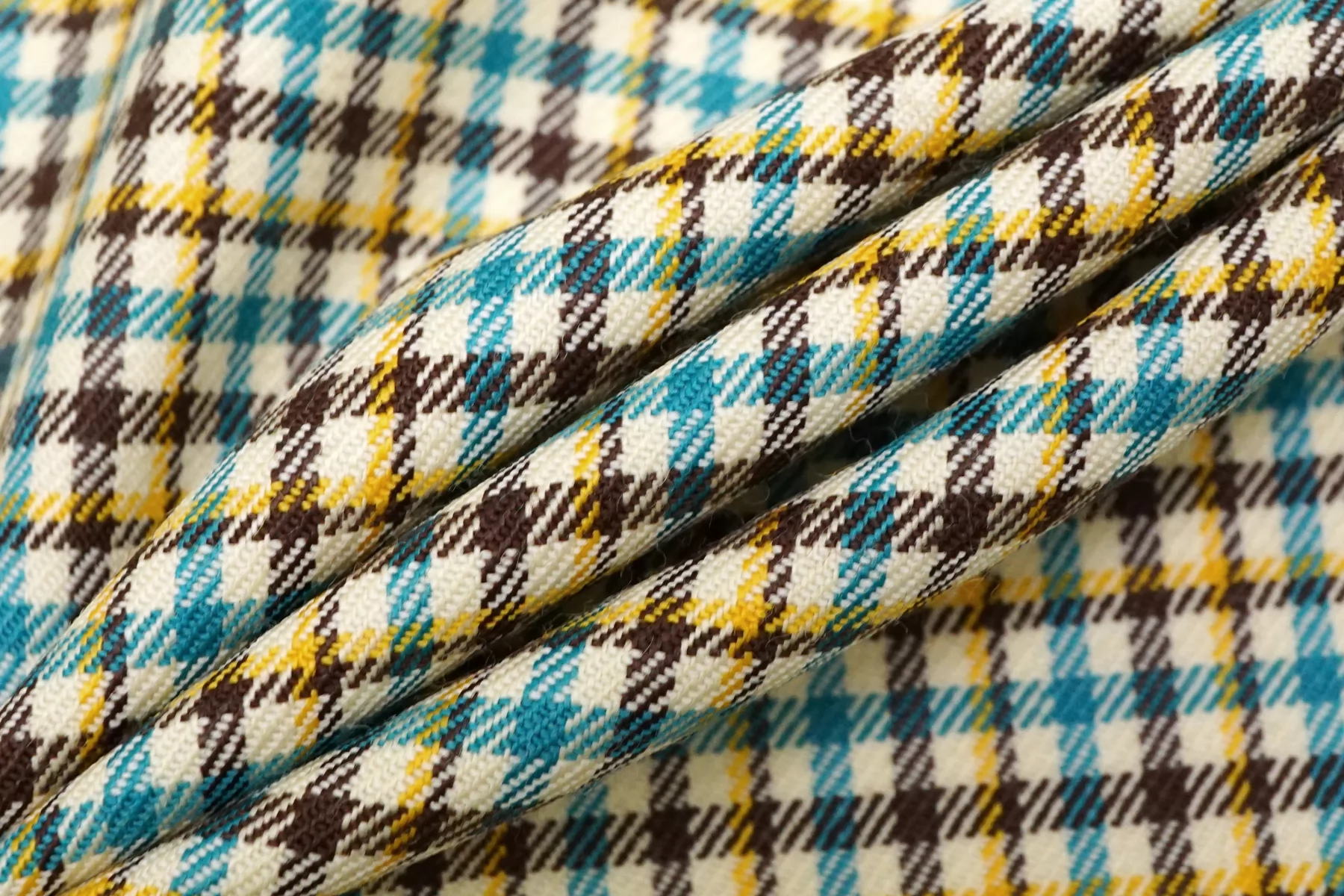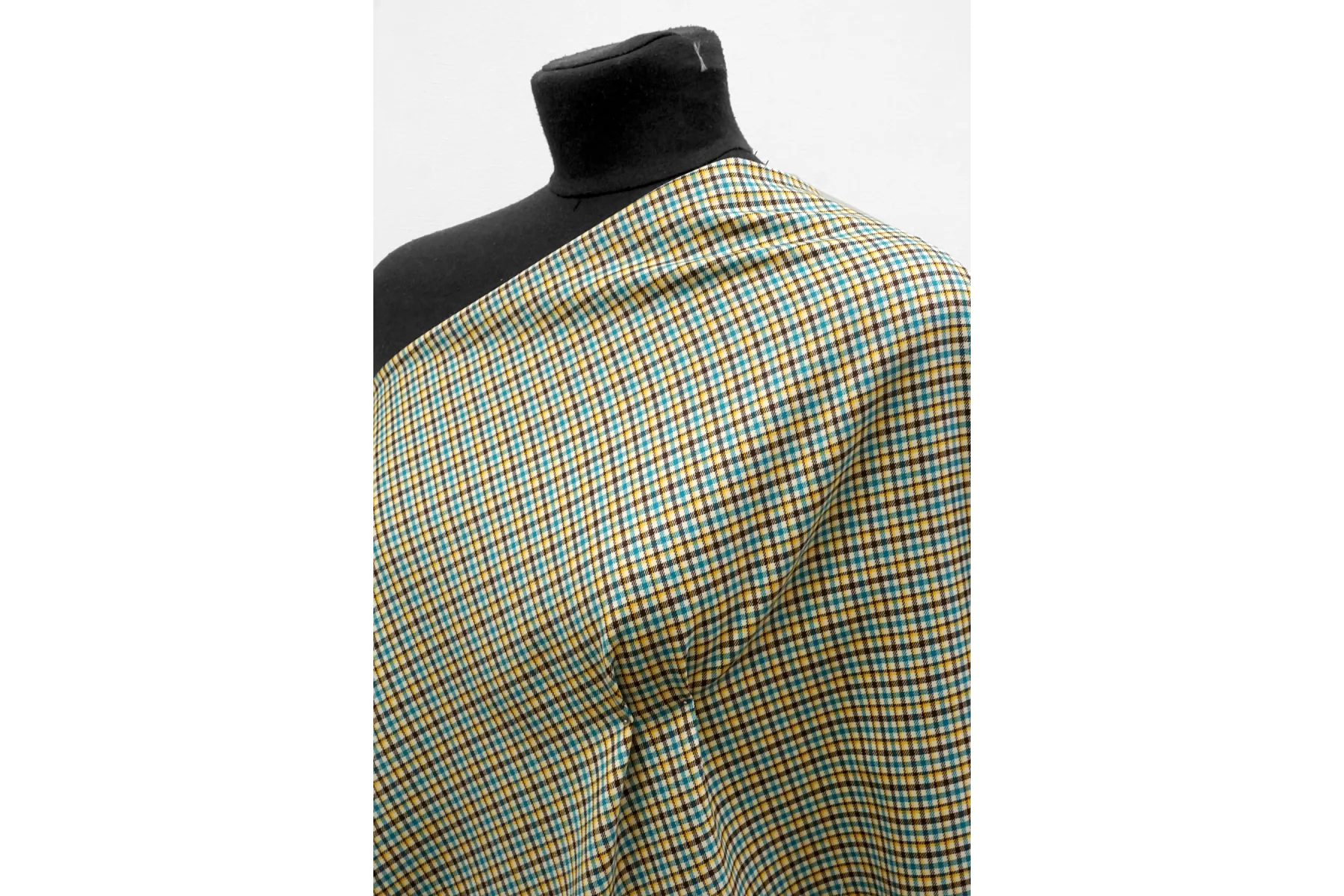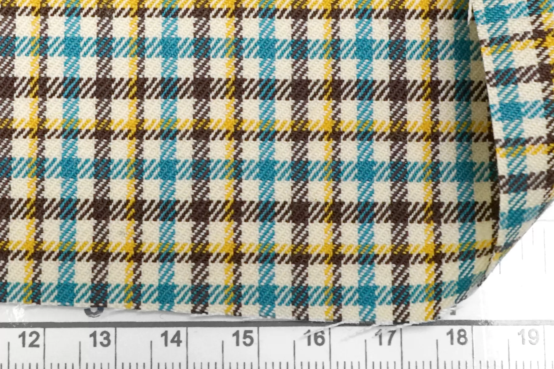 Прекрасная костюмная вирджинская шерсть в клетку от бренда Gucci из нитей молочно-бежевого, жёлтого, бирюзового и тёмно-коричневого цвета. Тактильно гладкая, плотная, но достаточно тонкая. Чувствуется, что шерсть, при этом не колется. Не просвечивает. Плетение совсем немного тянется. Хорошо драпируется и умеренно держит форму. Не мнется. Отличный вариант на костюмы, жакеты мягкой формы, платья, брюки, тёплые рубашки и не только. Уход за материалом деликатный.