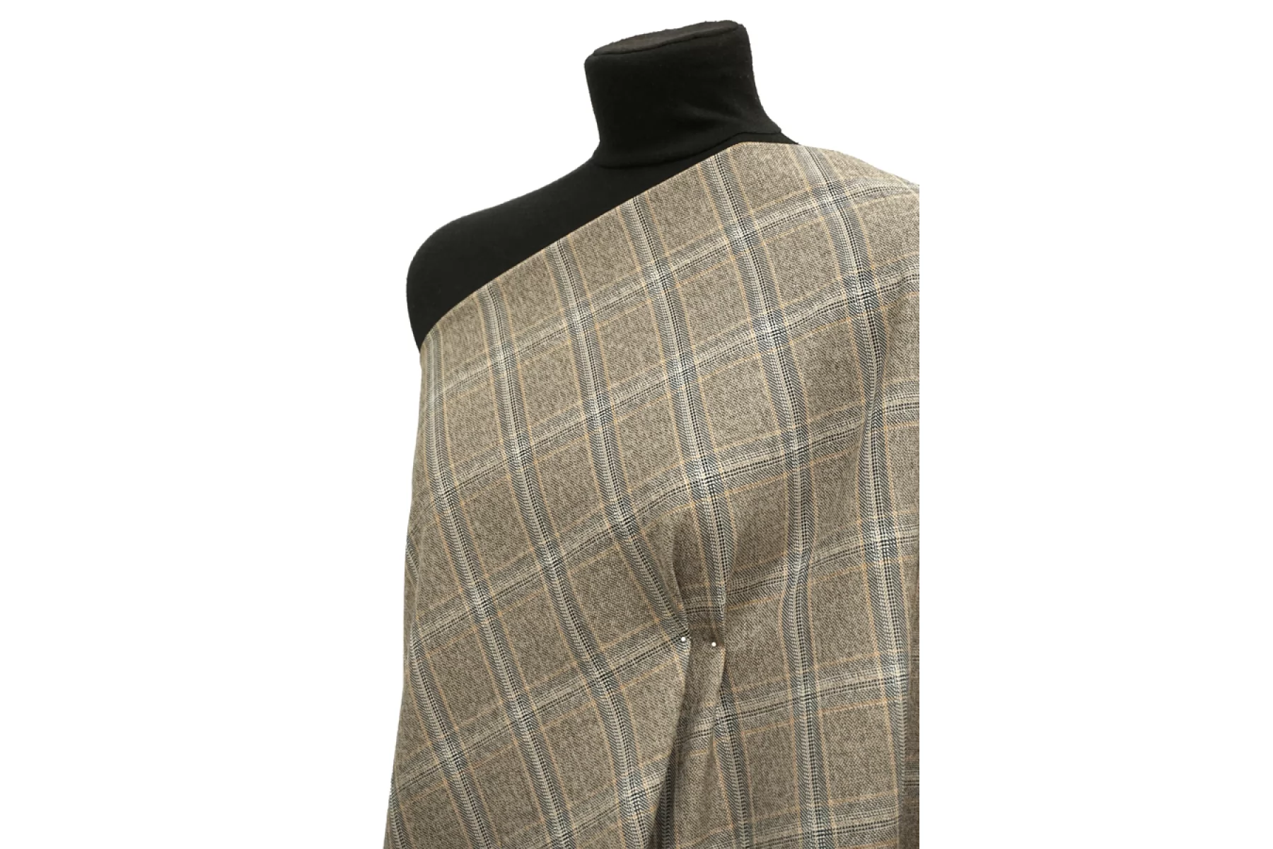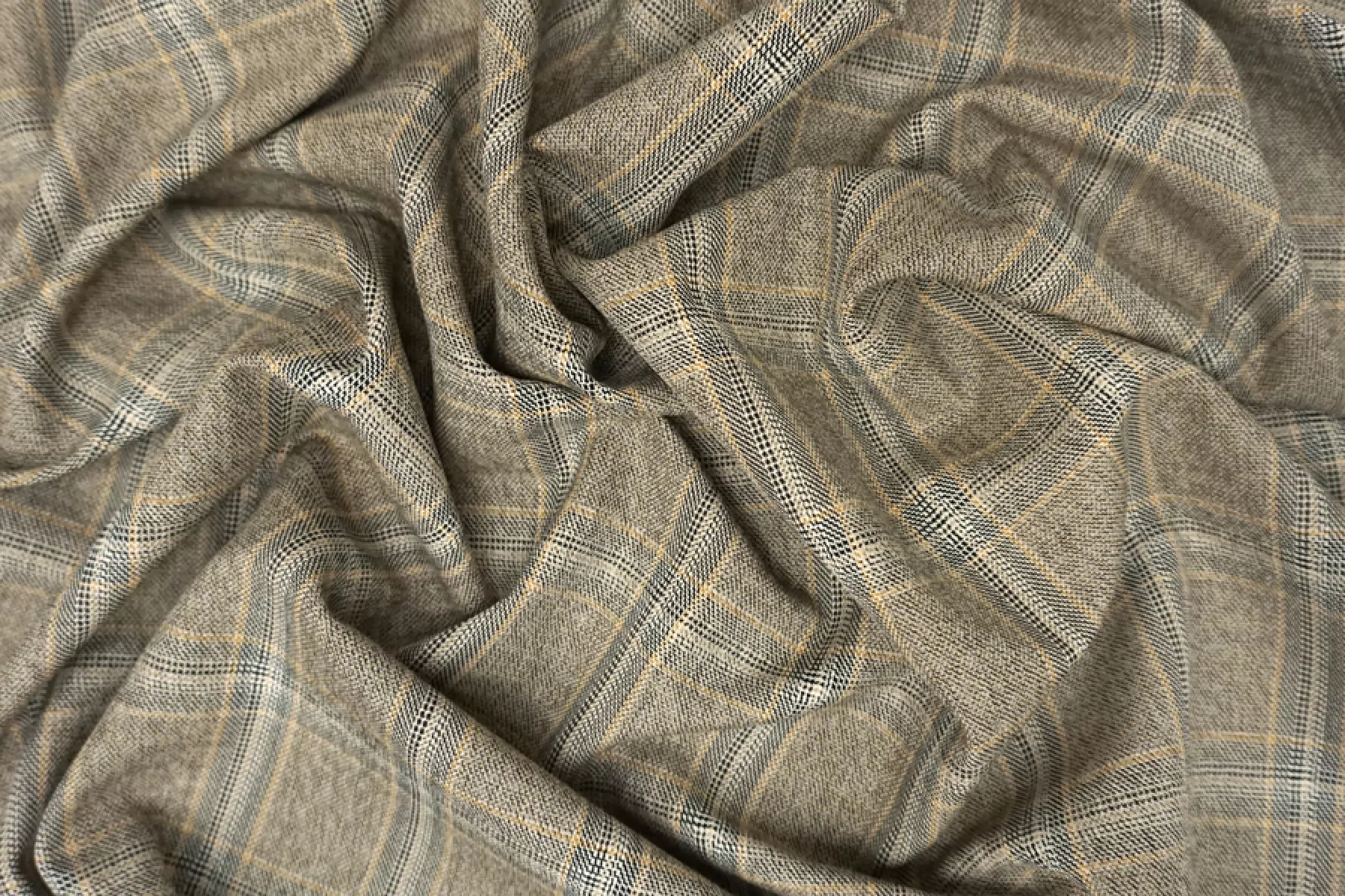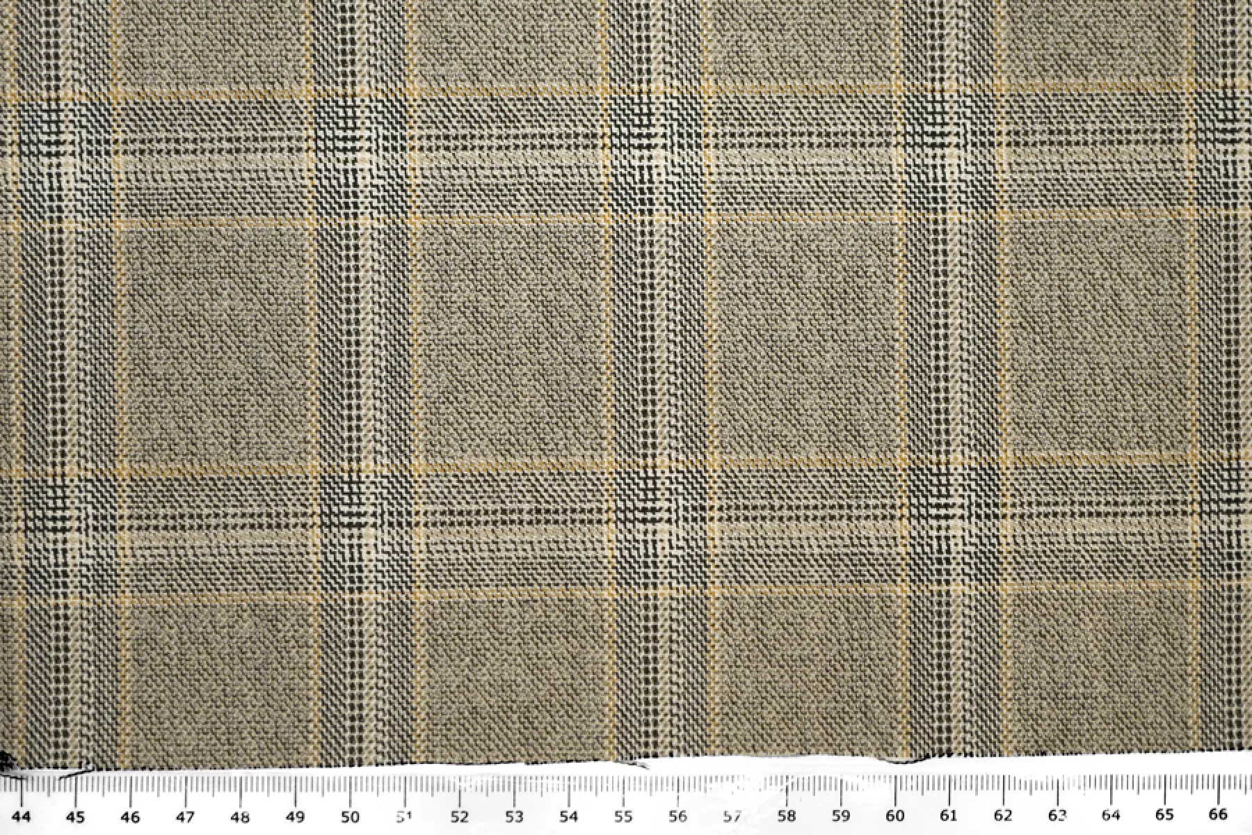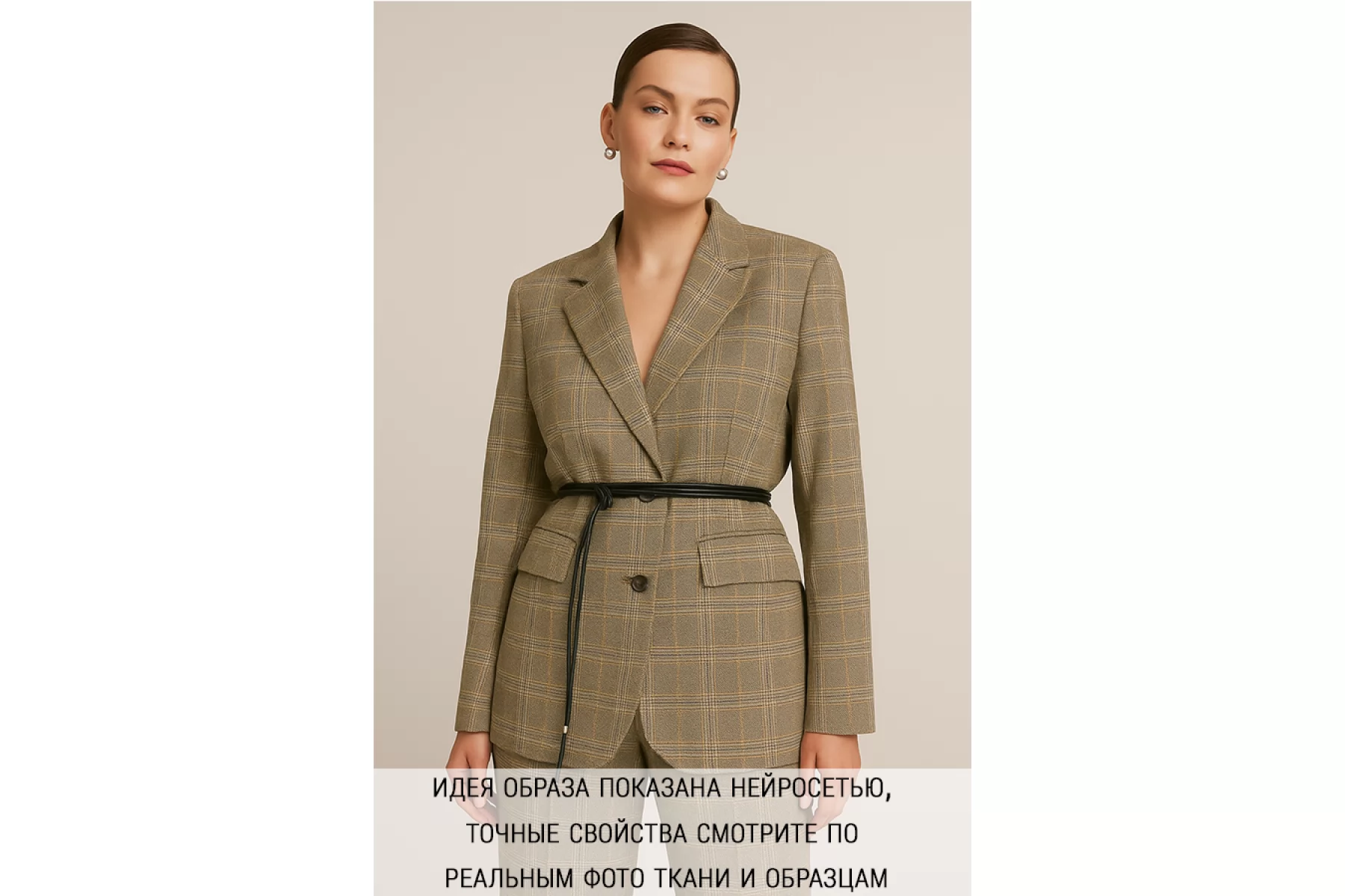 Костюмная шерсть от GUCCI в клетку, которую образует переплетение нитей бежевого, серого, молочного, горчичного и черного. Тактильно сухая, слегка шероховатая, но приятная. Клетка среднего размера (~7,2 х9 см). Полотно плотное. Не колется, но ощущается шерсть. Не просвечивает. Не тянется. Не мнется. Хорошо драпируется и отлично держит форму. Шьем стильные жакеты, пиджаки, костюмные варианты, юбки и не только. Уход за шерстью деликатный. При необходимости используйте подкладочный материал.