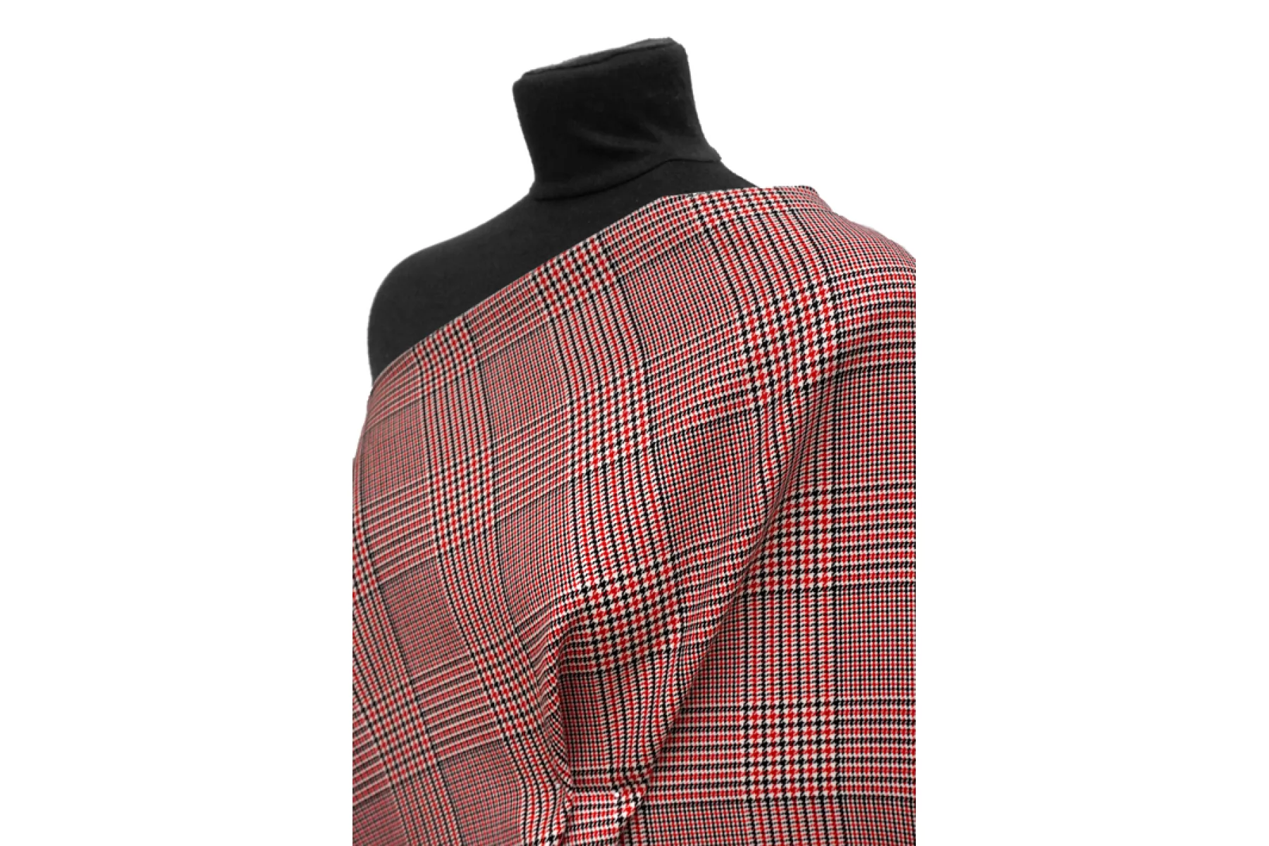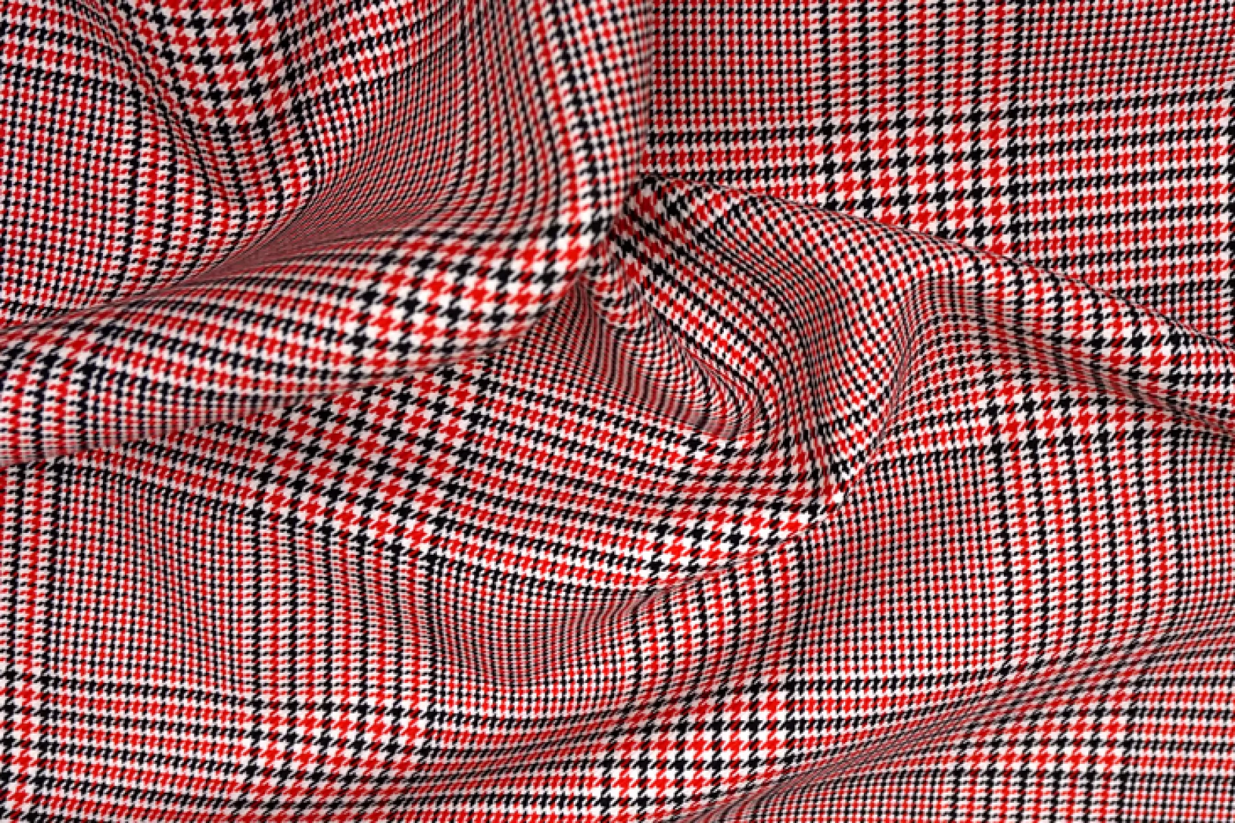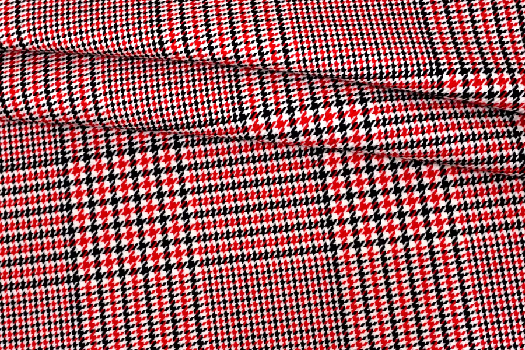 Шикарная позиция - шерсть диагонального плетения с мелкой гусиной лапкой и крупной клеткой в черно-бело-красном цвете от бренда McQueen. Шерсть тактильно очень приятная, прохладная. Не мнется. Материал довольно плотный. Не тянется и не просвечивает. Отличный вариант на костюмы. Уход за материалом деликатный.
