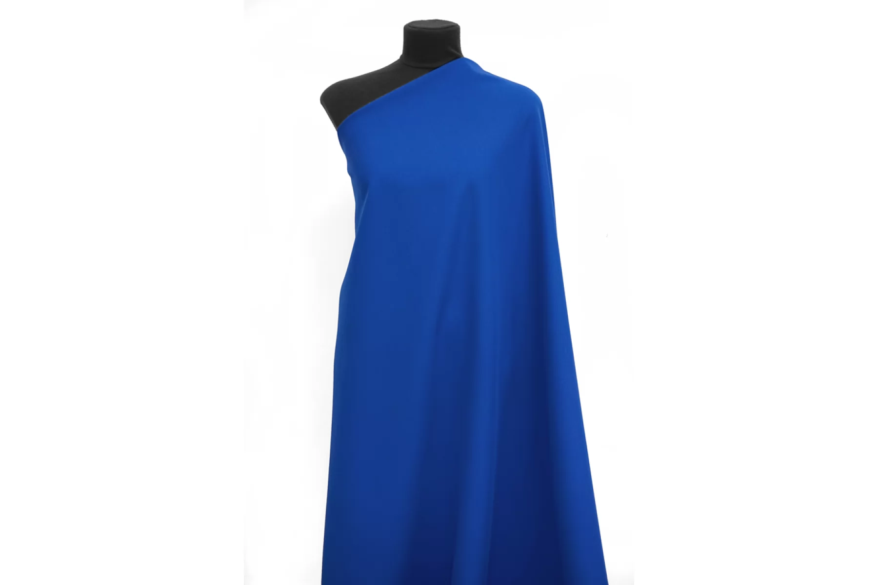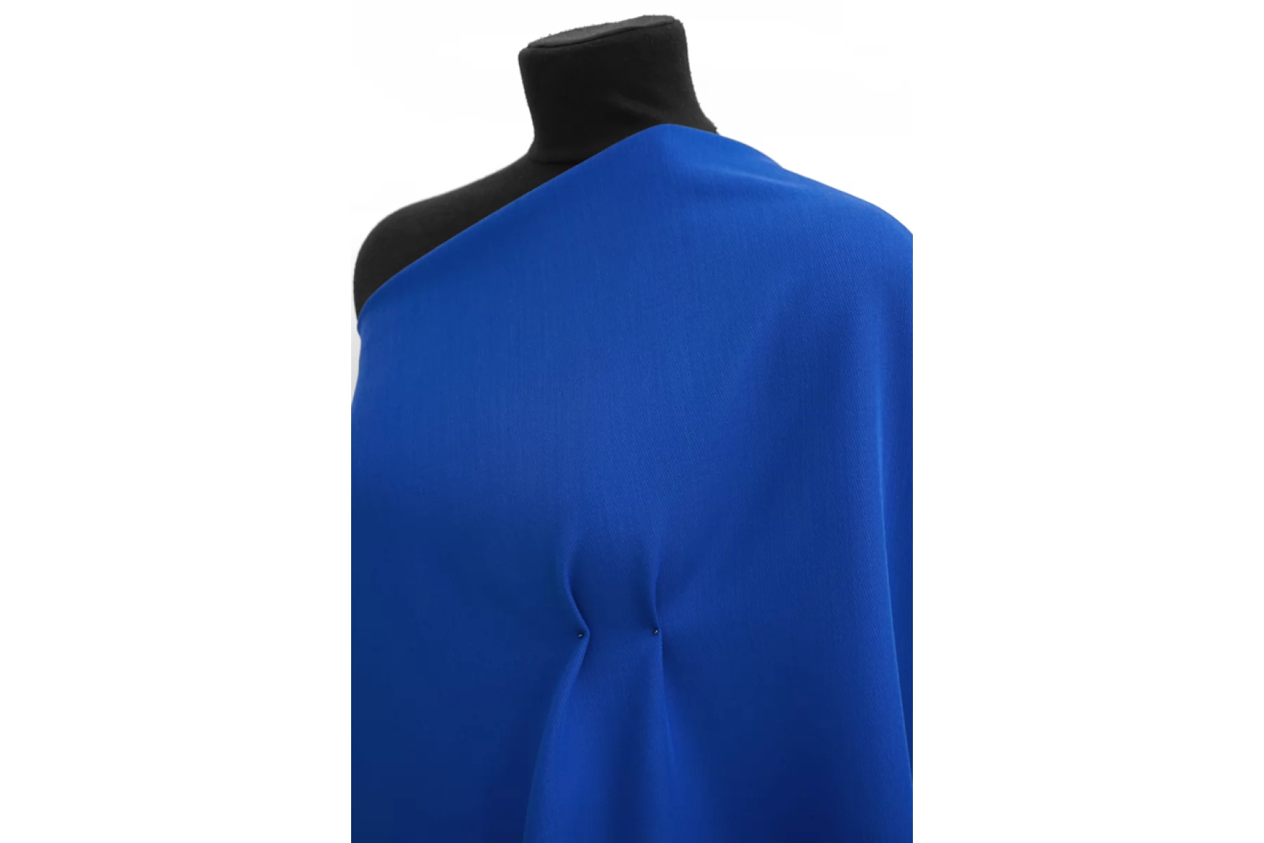 Плотная костюмная шерсть от HUGO BOSS диагонального плетения насыщенного синего цвета. Тактильно суховатая, шероховатая, чувствуется, что шерсть. Не колется. Слегка ощущается плетение диагоналей. Обладает красивым матовым лоском. Не просвечивает. Не тянется. Хорошо драпируется и держит форму. Не мнется. Отличный вариант на жакеты, пиджаки, брюки и костюмные варианты. Уход за шерстью деликатный.