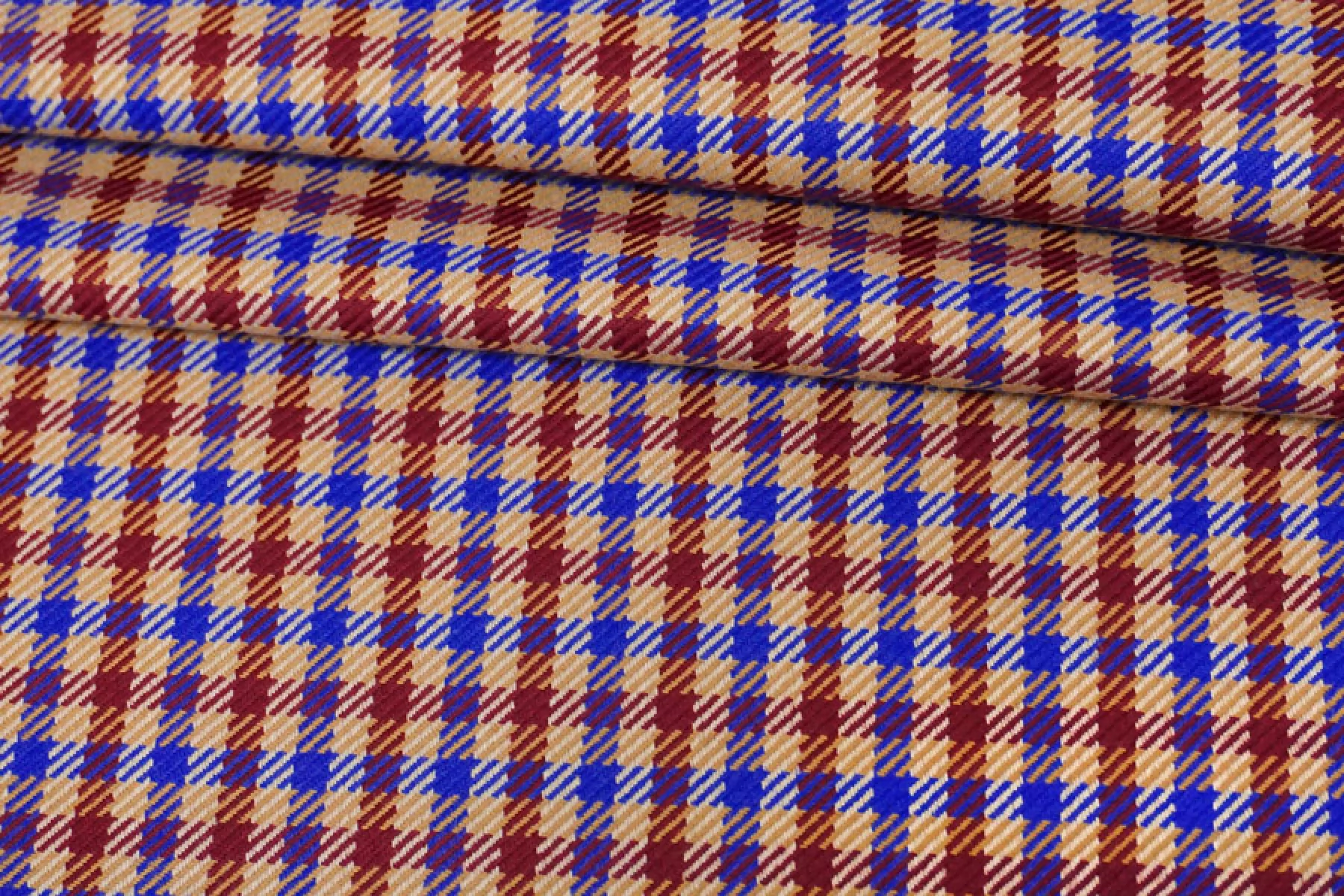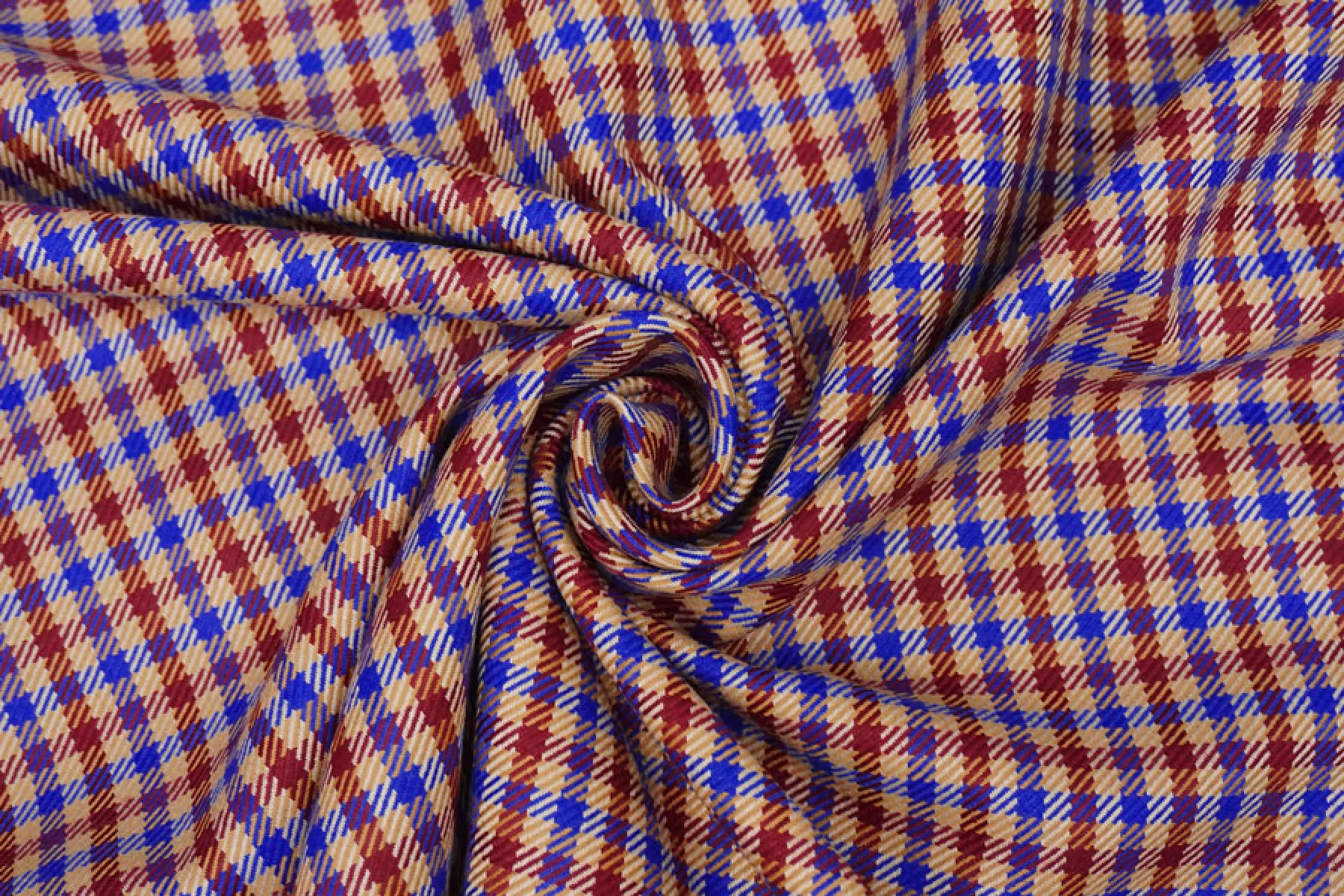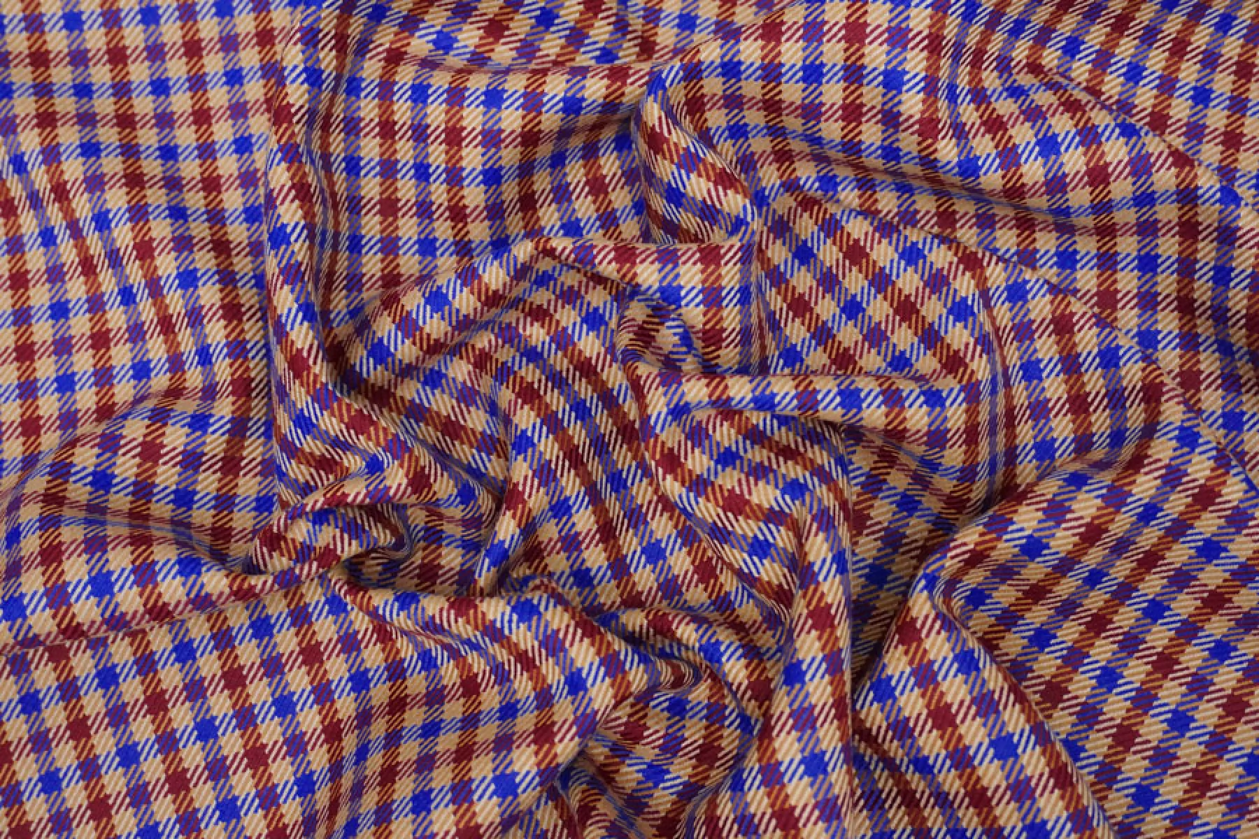 Шикарного качества итальянская костюмная шерсть в клетку, диагонального плетения, в оттенках синего, винного и бежевых. Тактильно приятная и гладкая. Не колется. Мягкая и пластичная. Достаточно плотная. Обладает легким лоском. Хорошо драпируется и держит форму. Не просвечивает, не тянется, не мнется. Стильный вариант для пошива жакета, брюк, платья, юбки, костюма и не только. Уход за шерстью деликатный.