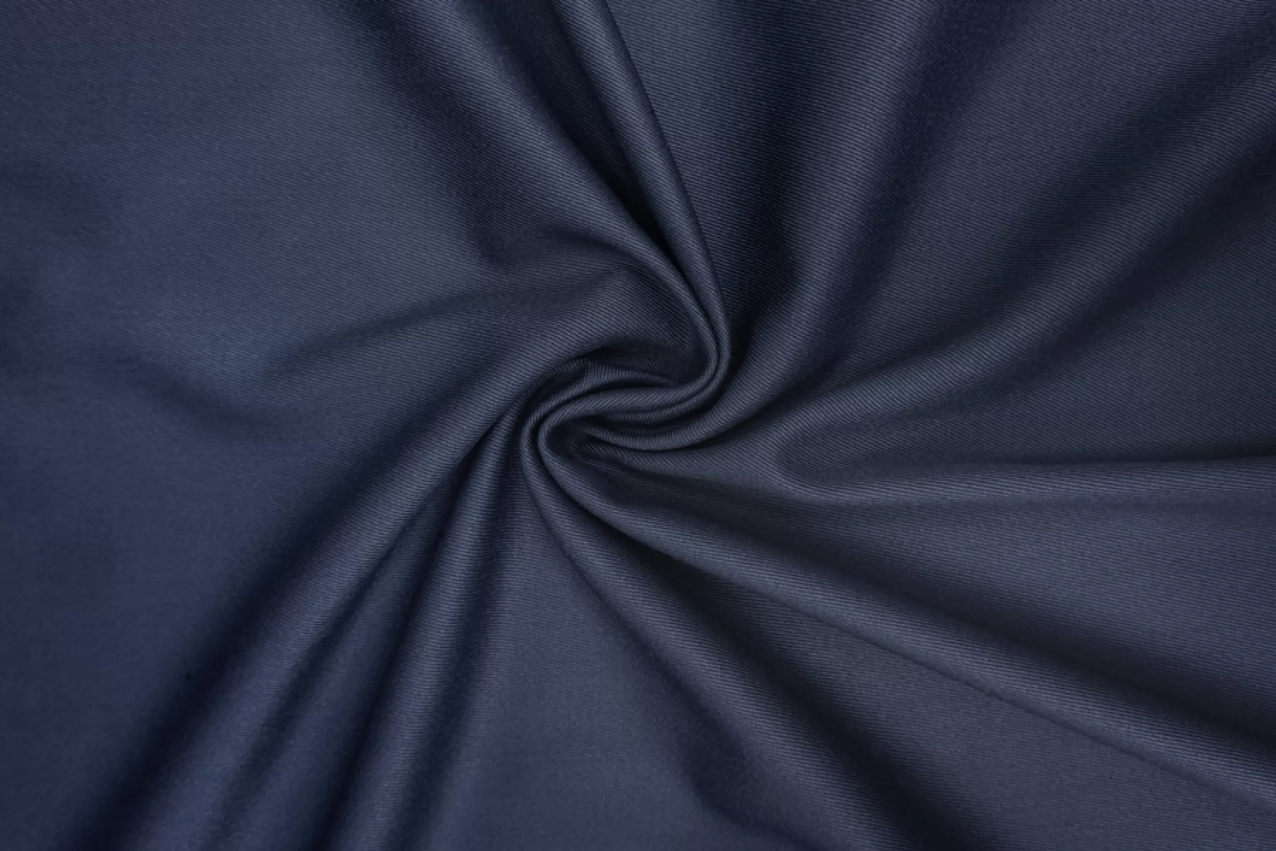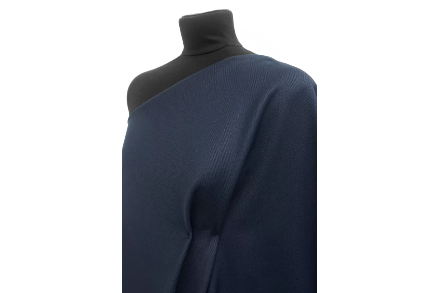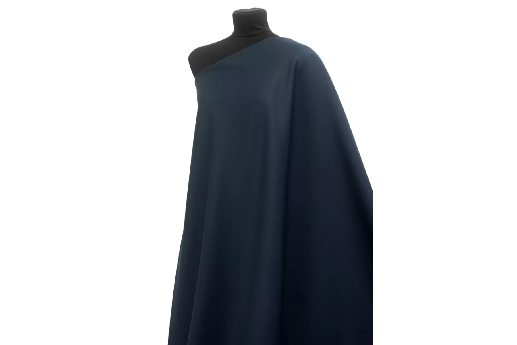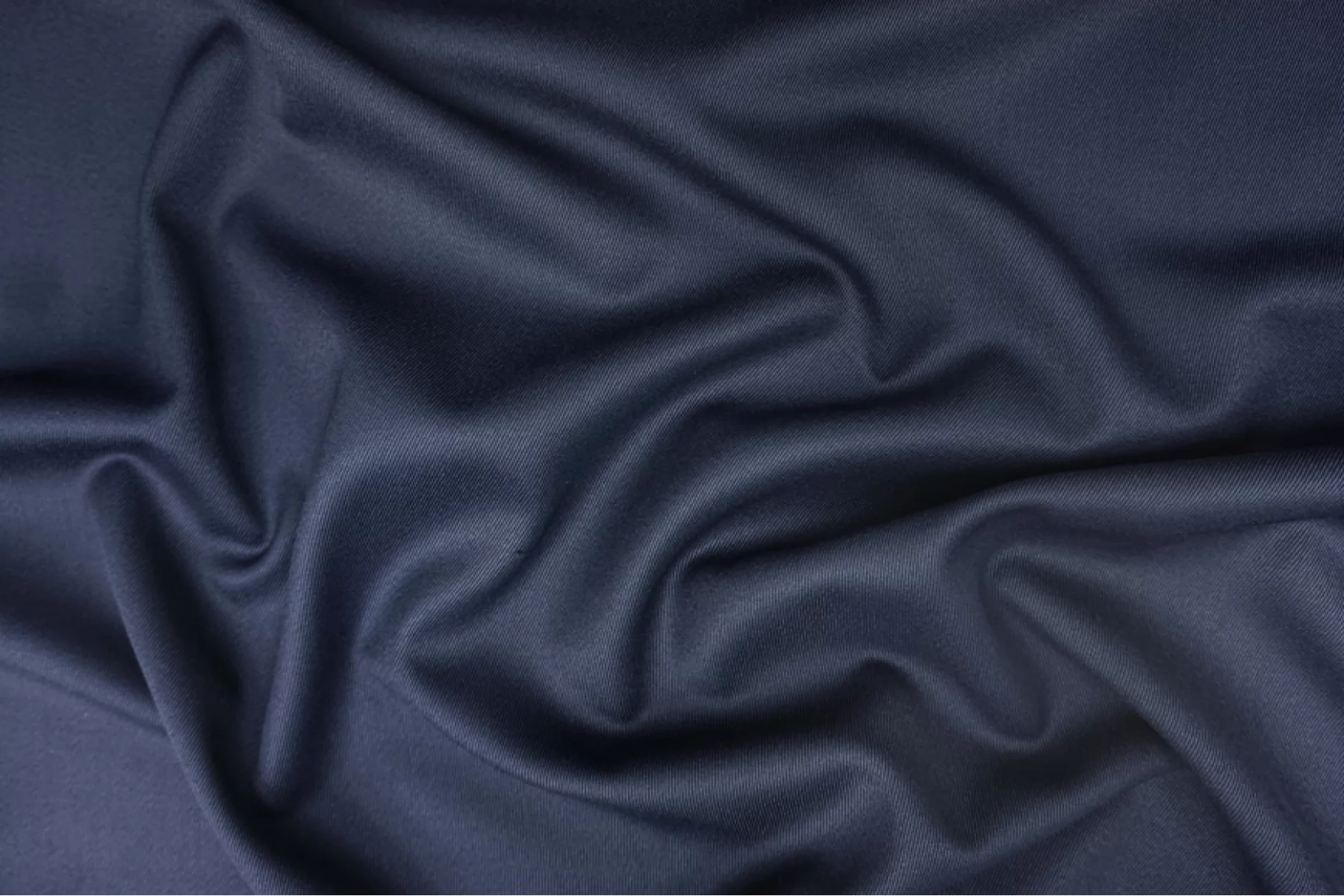 Плотная костюмная шерсть диагонального плетения приглушенного темно-синего оттенка. Тактильно суховатая, чувствуется, что шерсть, приятная,гладкая, увесистая. Не колется. Слегка ощущается плетение диагоналей. Обладает красивым лоском. Не просвечивает. Не тянется. Хорошо драпируется и держит форму. Не мнется. Отличный вариант на жакеты, пиджаки, брюки и костюмные варианты. Уход за шерстью деликатный.