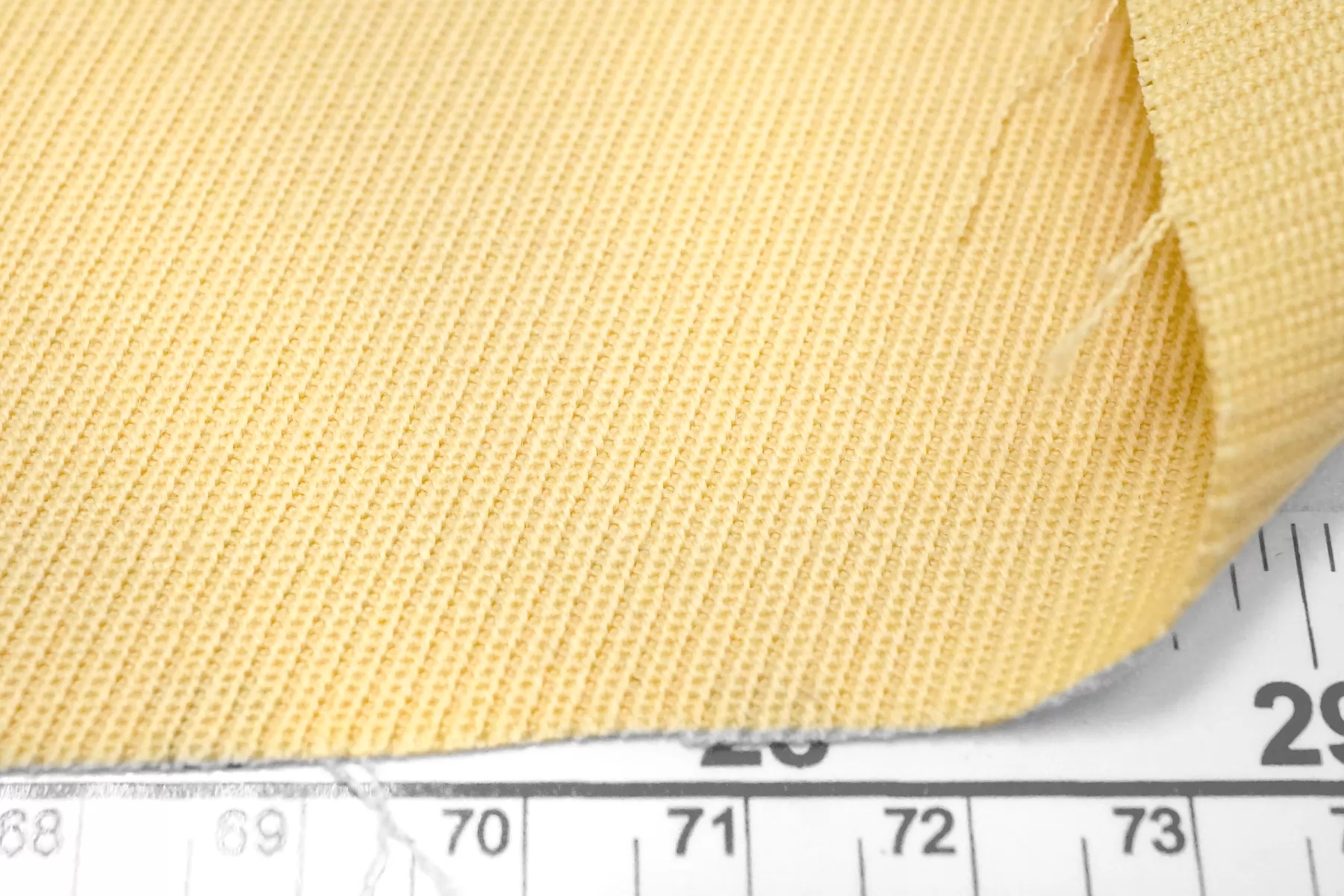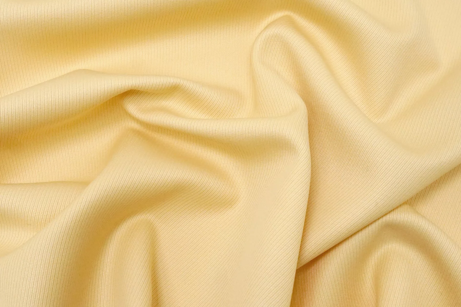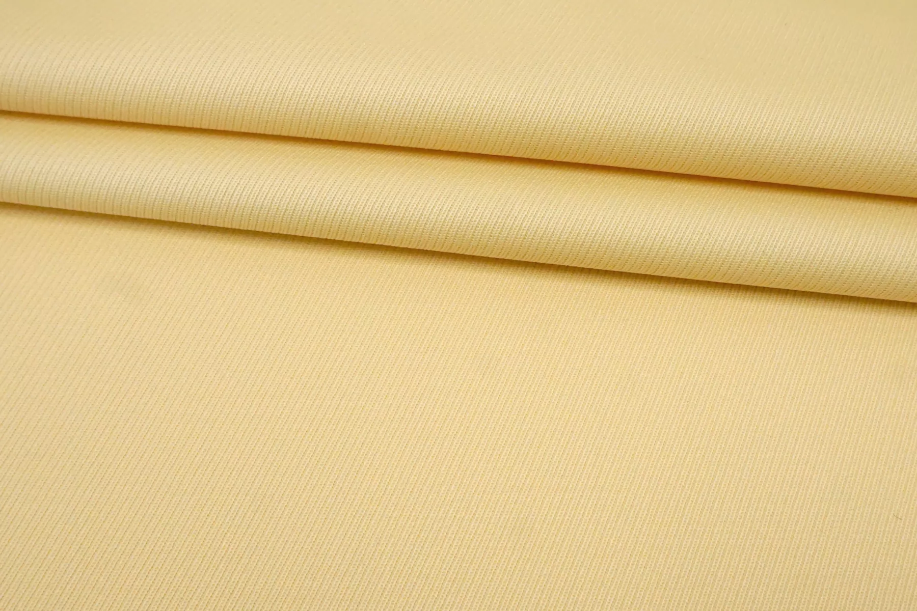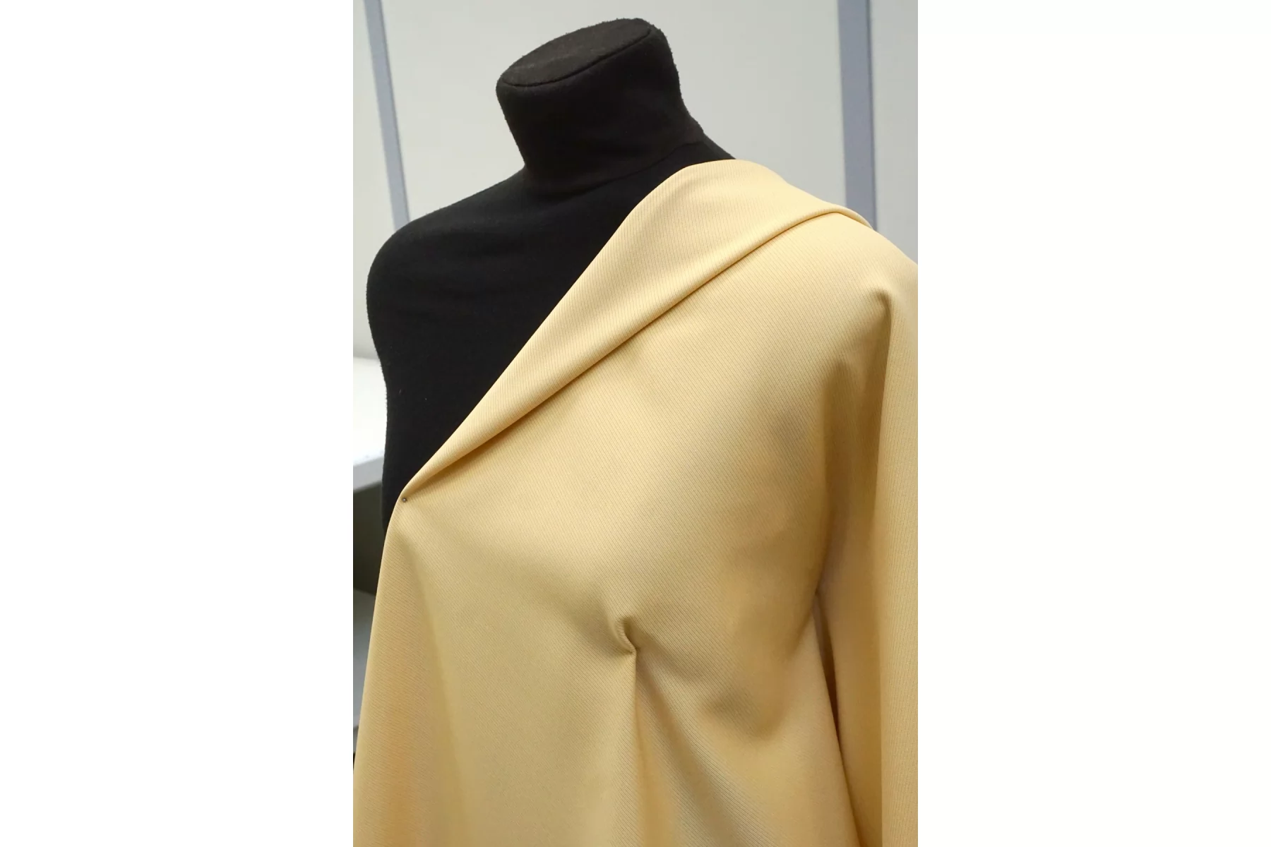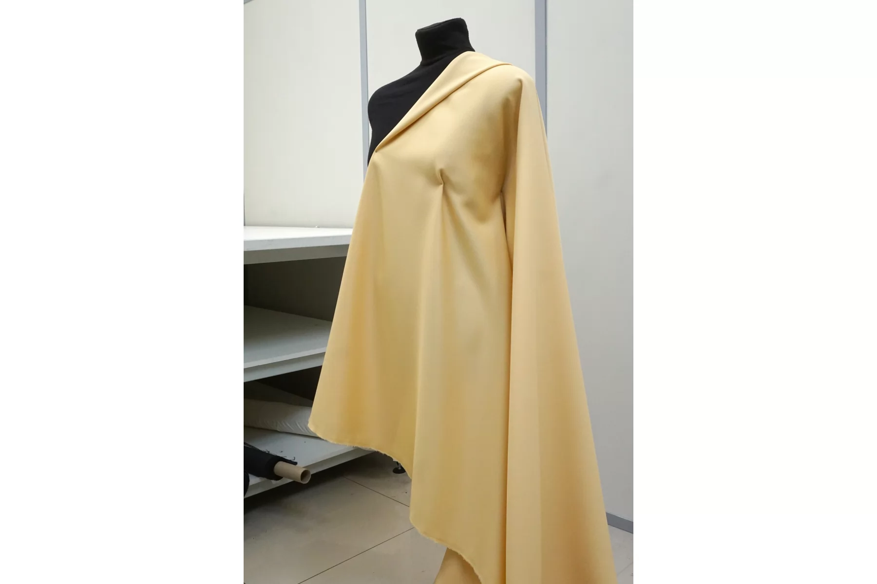 Костюмная вирджинская шерсть диагонального плетения, в разбелённом жёлто-песочном оттенке. Тактильно суховатая, плотная. Чувствуется плетение наощупь. Чувствительной коже может немного колоться. Не просвечивает. Не тянется. Не мнется. Хорошо держит форму, умеренной пластичности. Используем для пошива костюмов. При необходимости используйте подкладочный материал. Уход за шерстью деликатный.