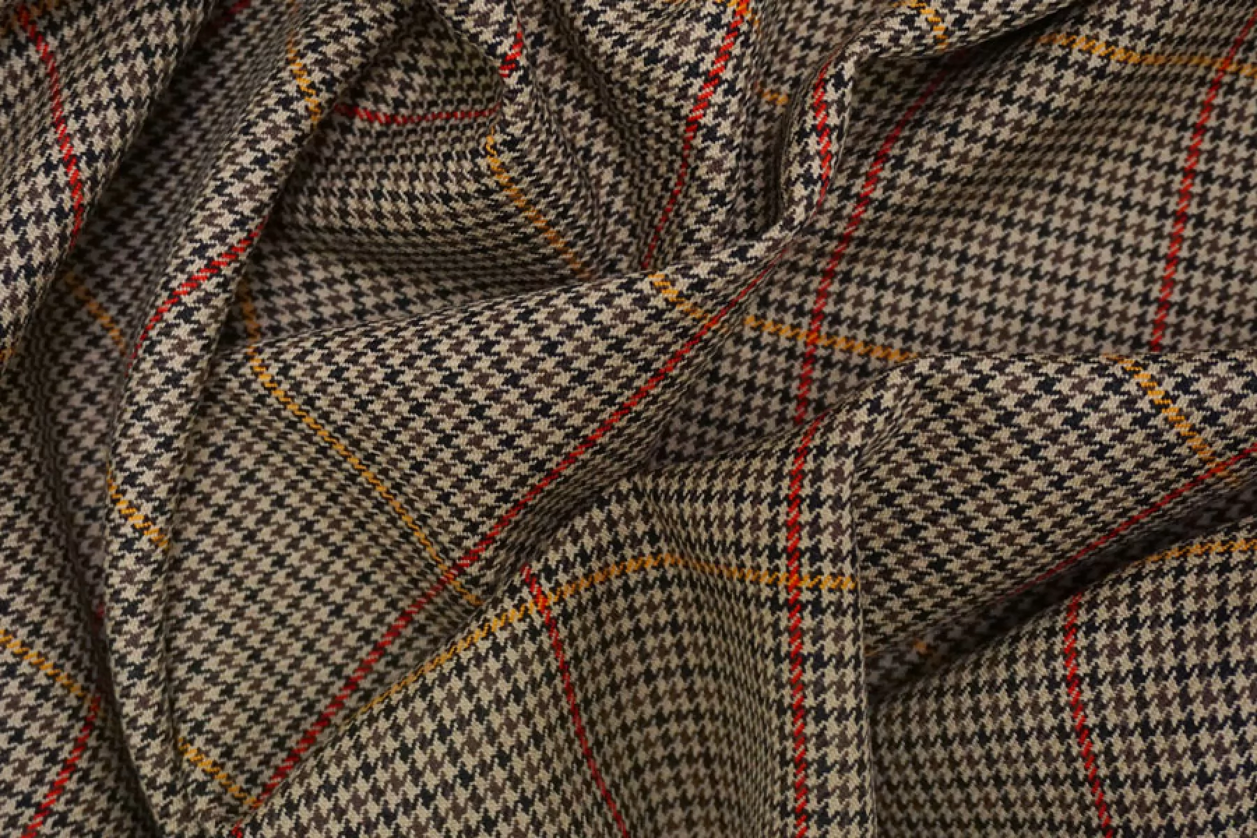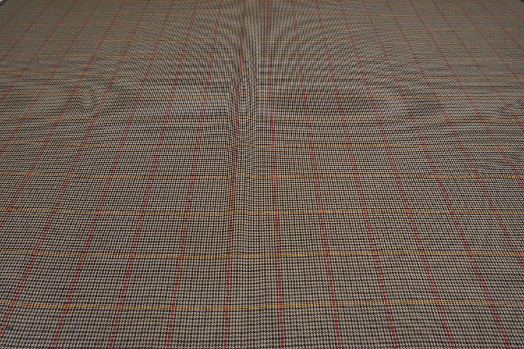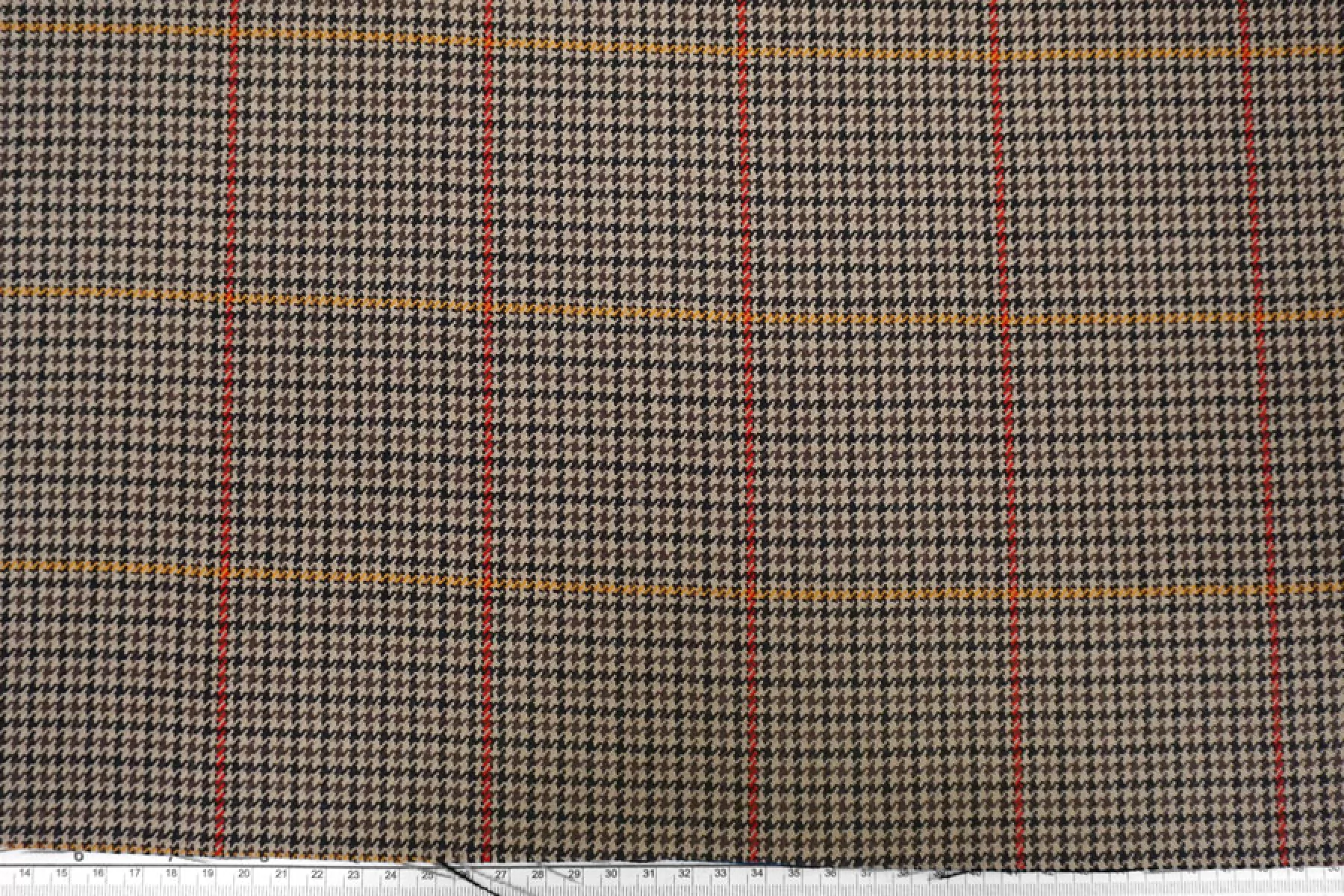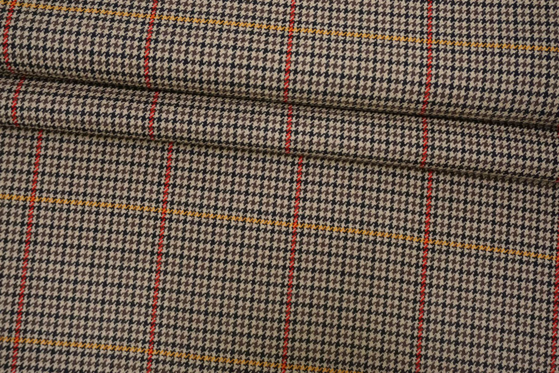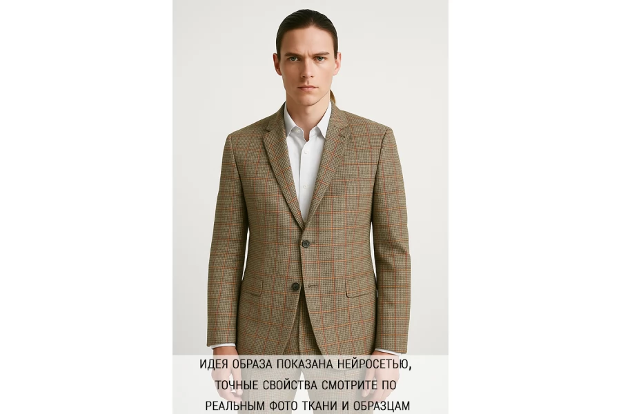 Шикарная костюмная шерсть с добавлением мохера в приятном коричнево-бежевом оттенке с узором в виде мелкой гусиной лапки и крупной клетки. Плетение диагональное. Тактильно ткань суховатая, шероховатая и покалывающая, чувствуется мохер. Не просвечивает, не тянется, форму держит. Плотненькая, достаточно пластичная. Используем для пошива костюмов. При необходимости используйте подкладочный материал. Уход деликатный.