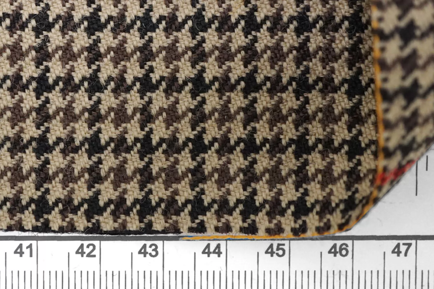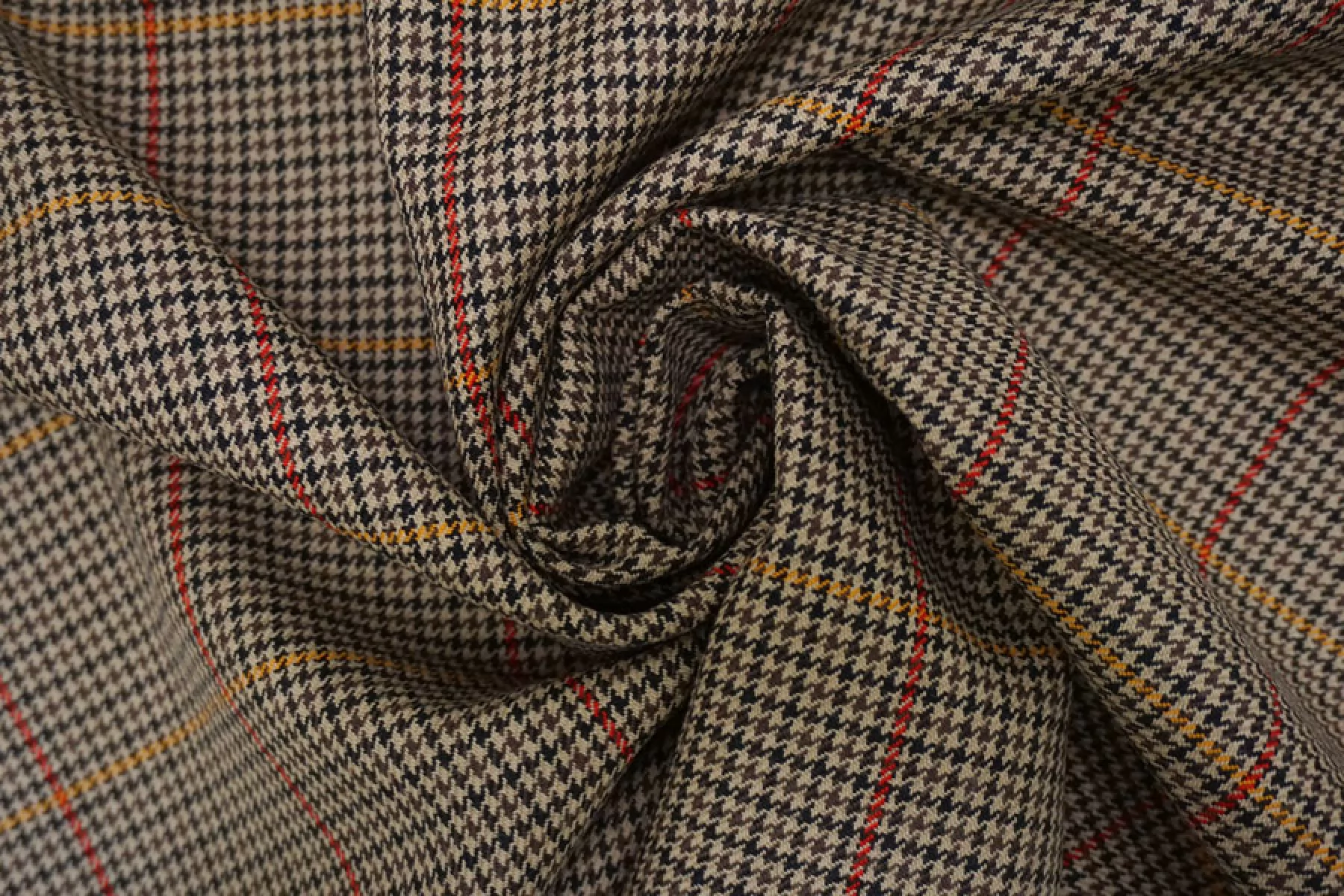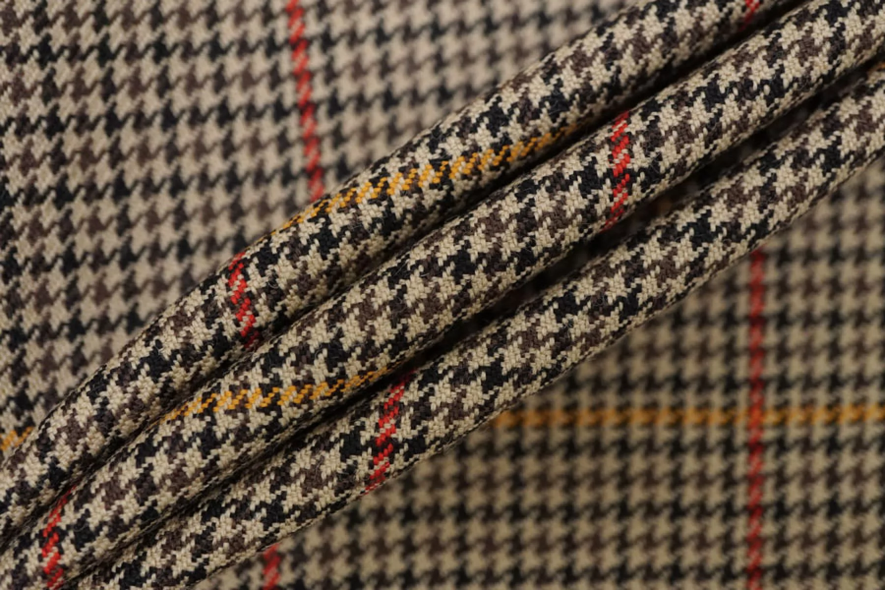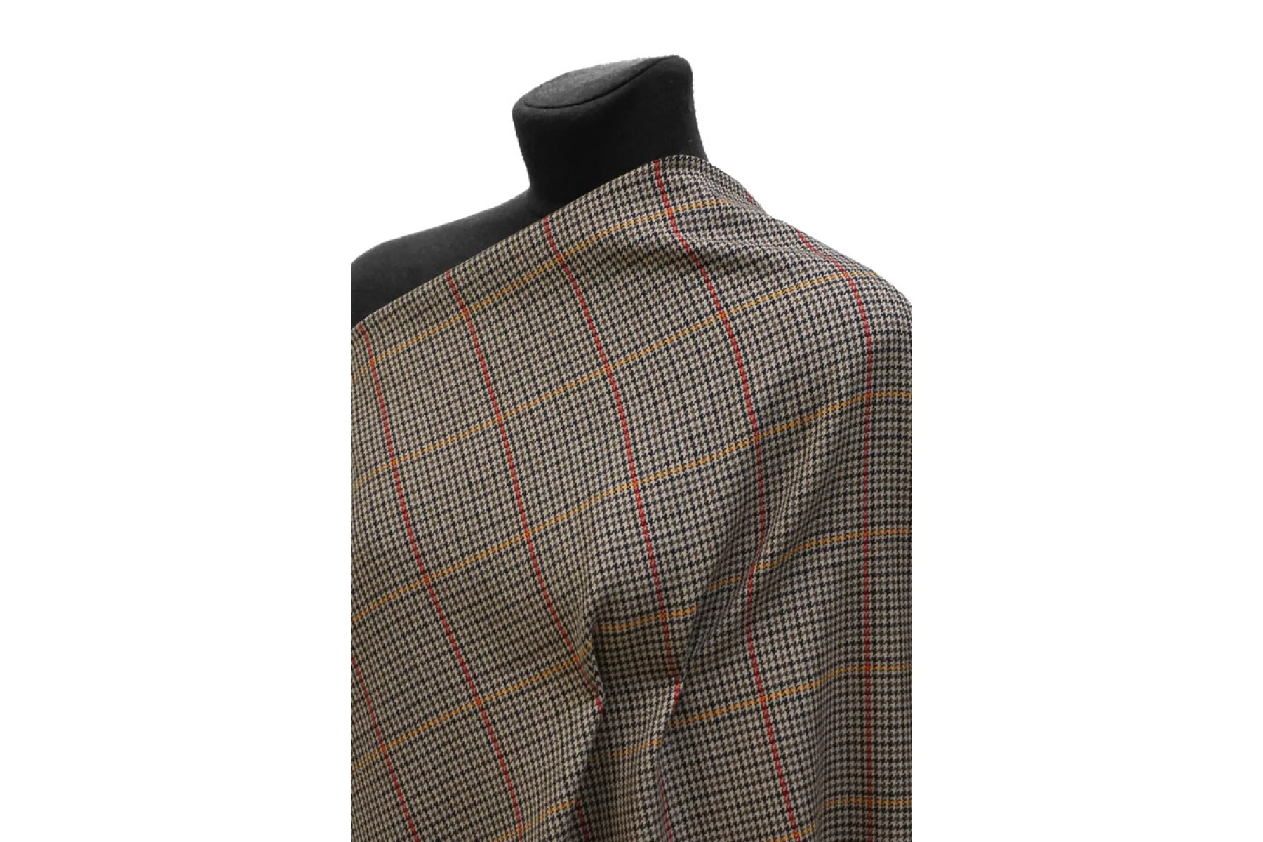 Шикарная костюмная шерсть с добавлением мохера в приятном коричнево-бежевом оттенке с узором в виде мелкой гусиной лапки и крупной клетки. Плетение диагональное. Тактильно ткань суховатая, шероховатая и покалывающая, чувствуется мохер. Не просвечивает, не тянется, форму держит. Плотненькая, достаточно пластичная. Используем для пошива костюмов. При необходимости используйте подкладочный материал. Уход деликатный.