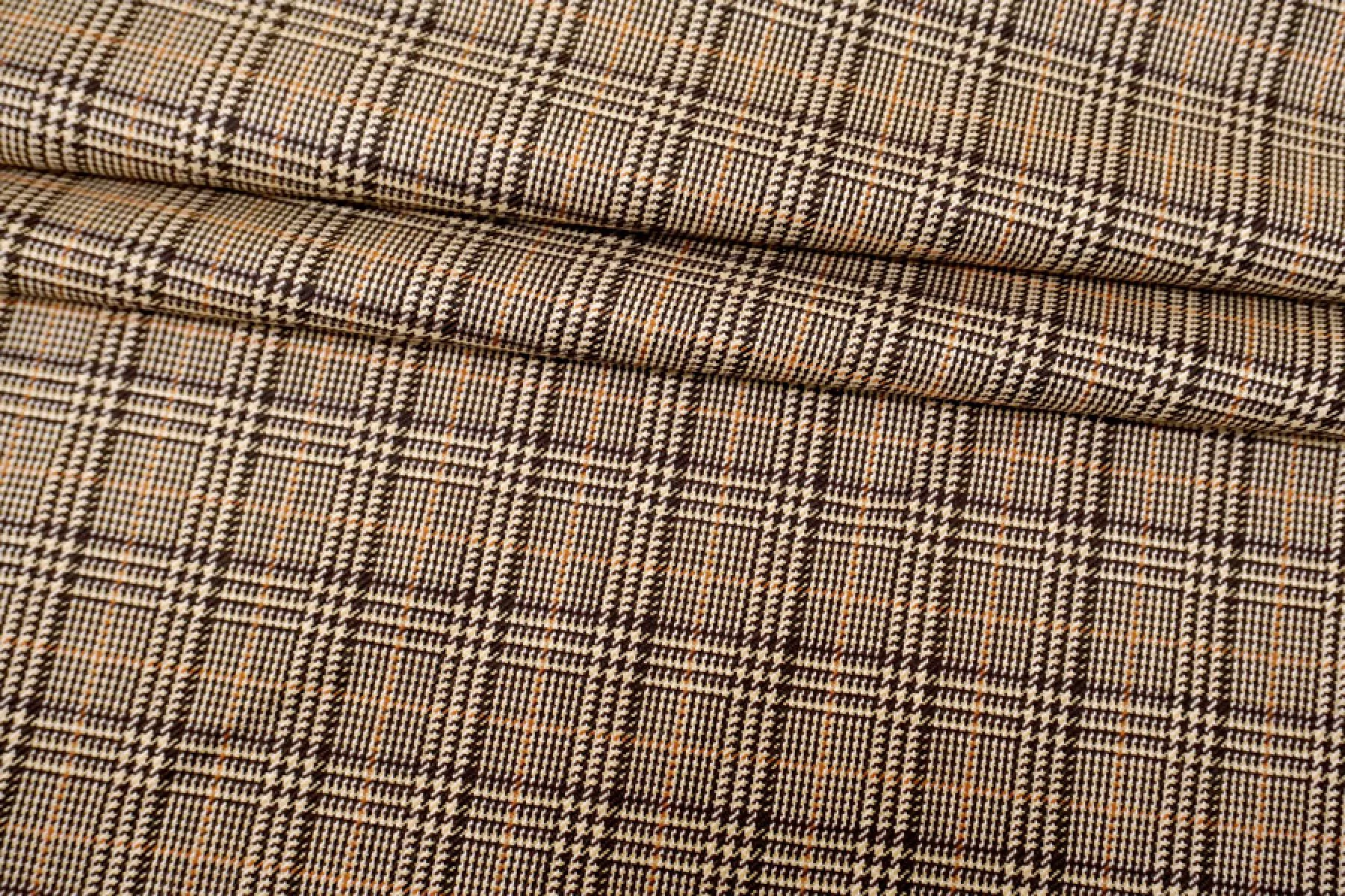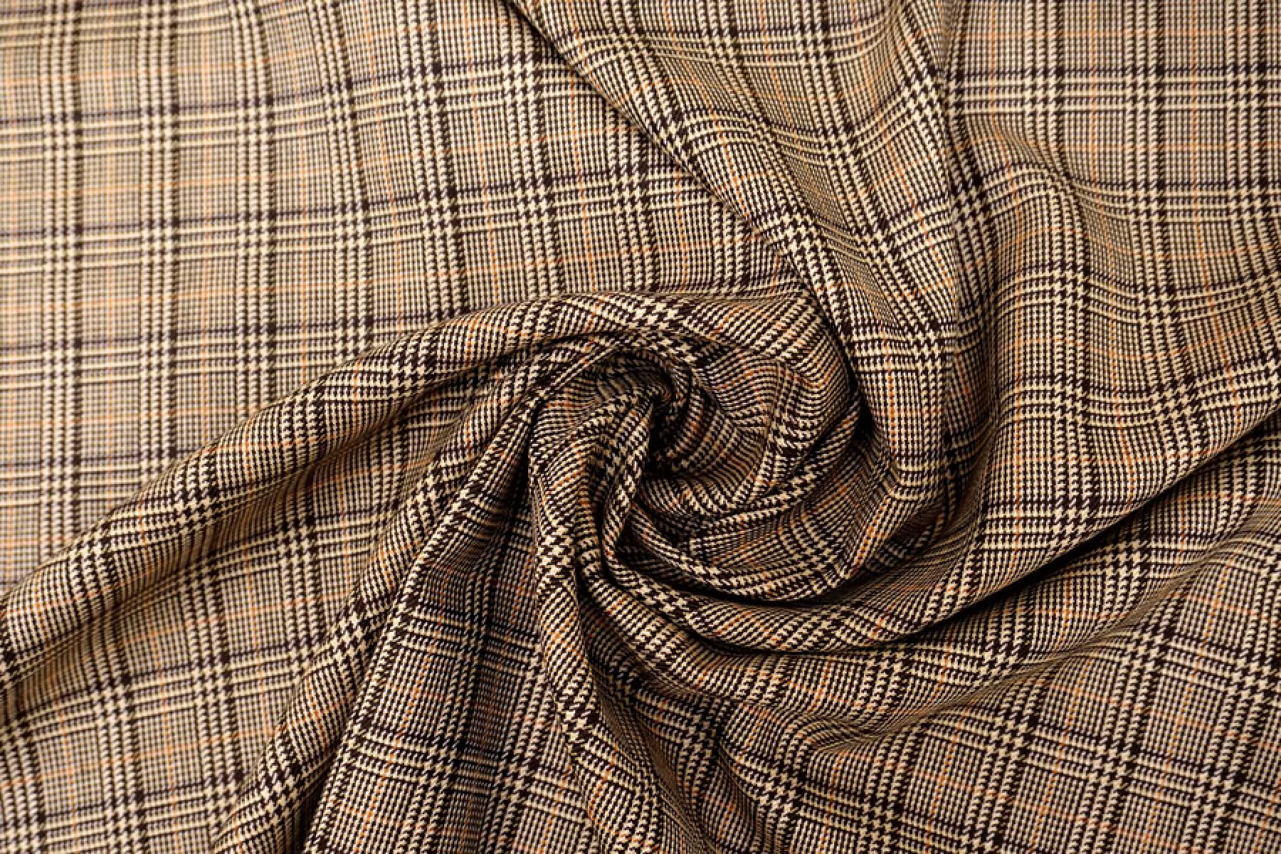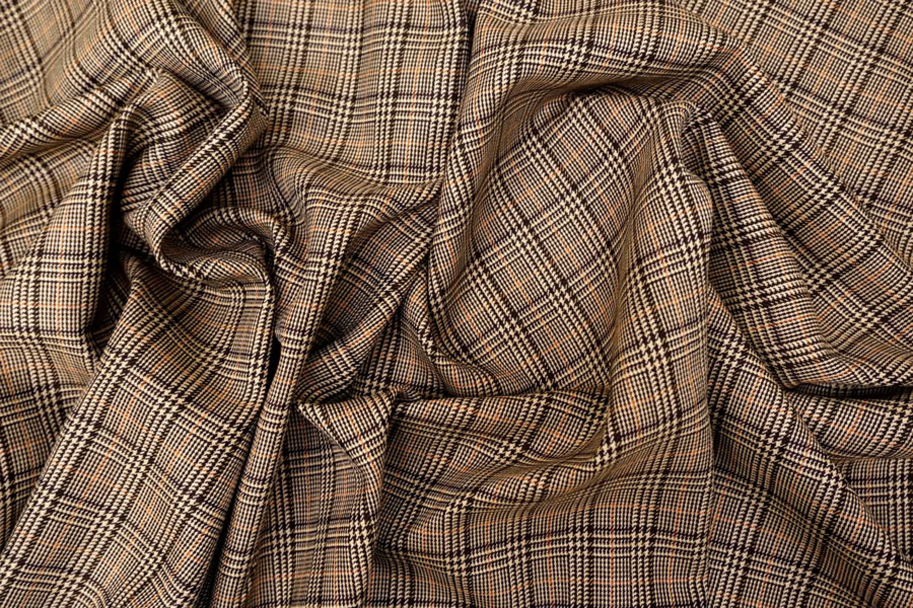 Прекрасная костюмная шерсть с шелком в коричнево-бежевую клетку. Тактильно гладкая и суховатая, колется. С красивым лоском. Не тянется. Не мнется. Пластичная. Хорошо драпируется и немного держит форму. Шьем теплые костюмы, юбки, рубашки. Уход деликатный.