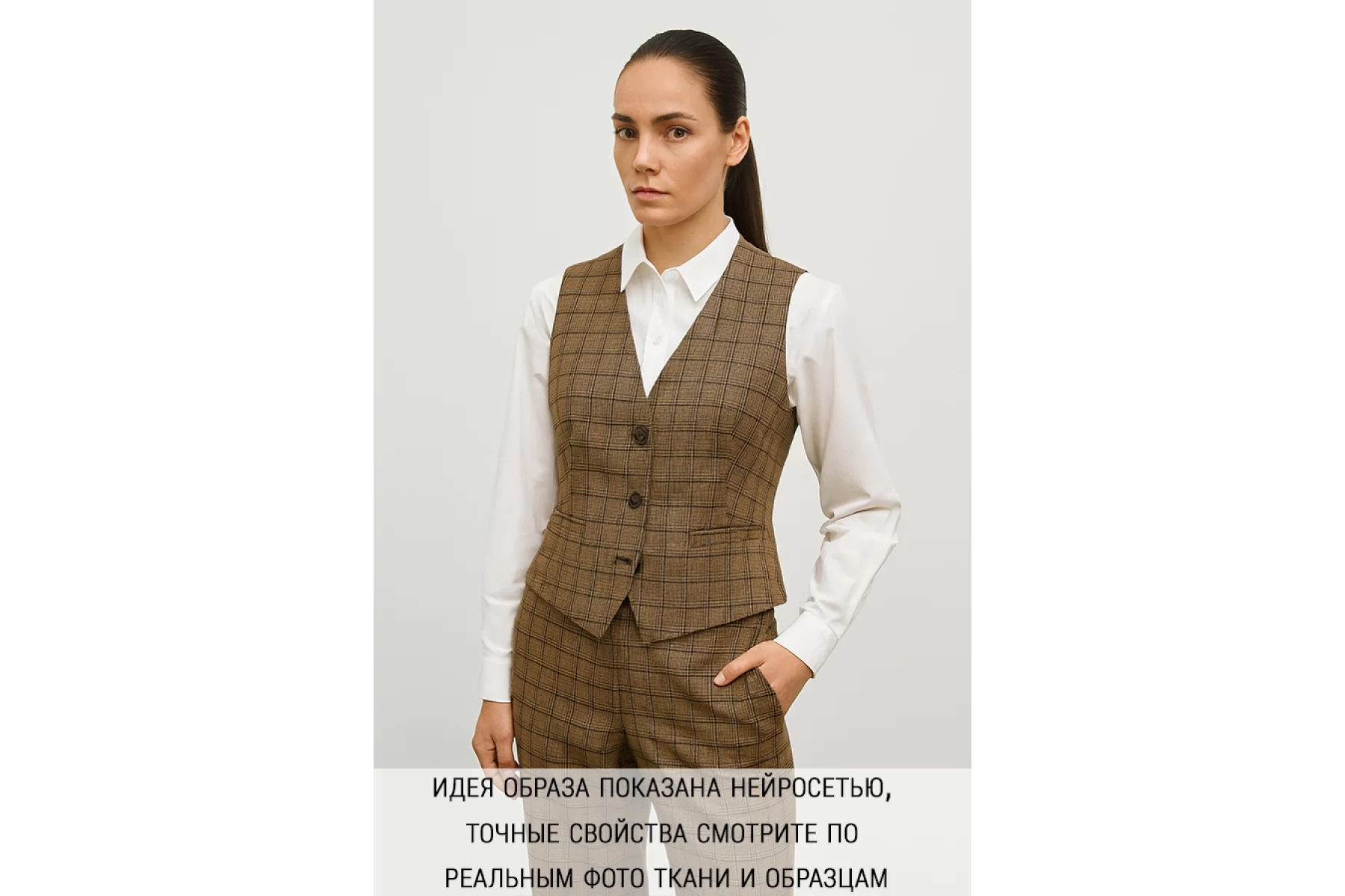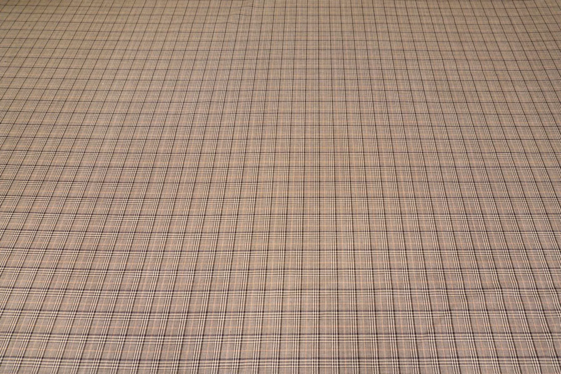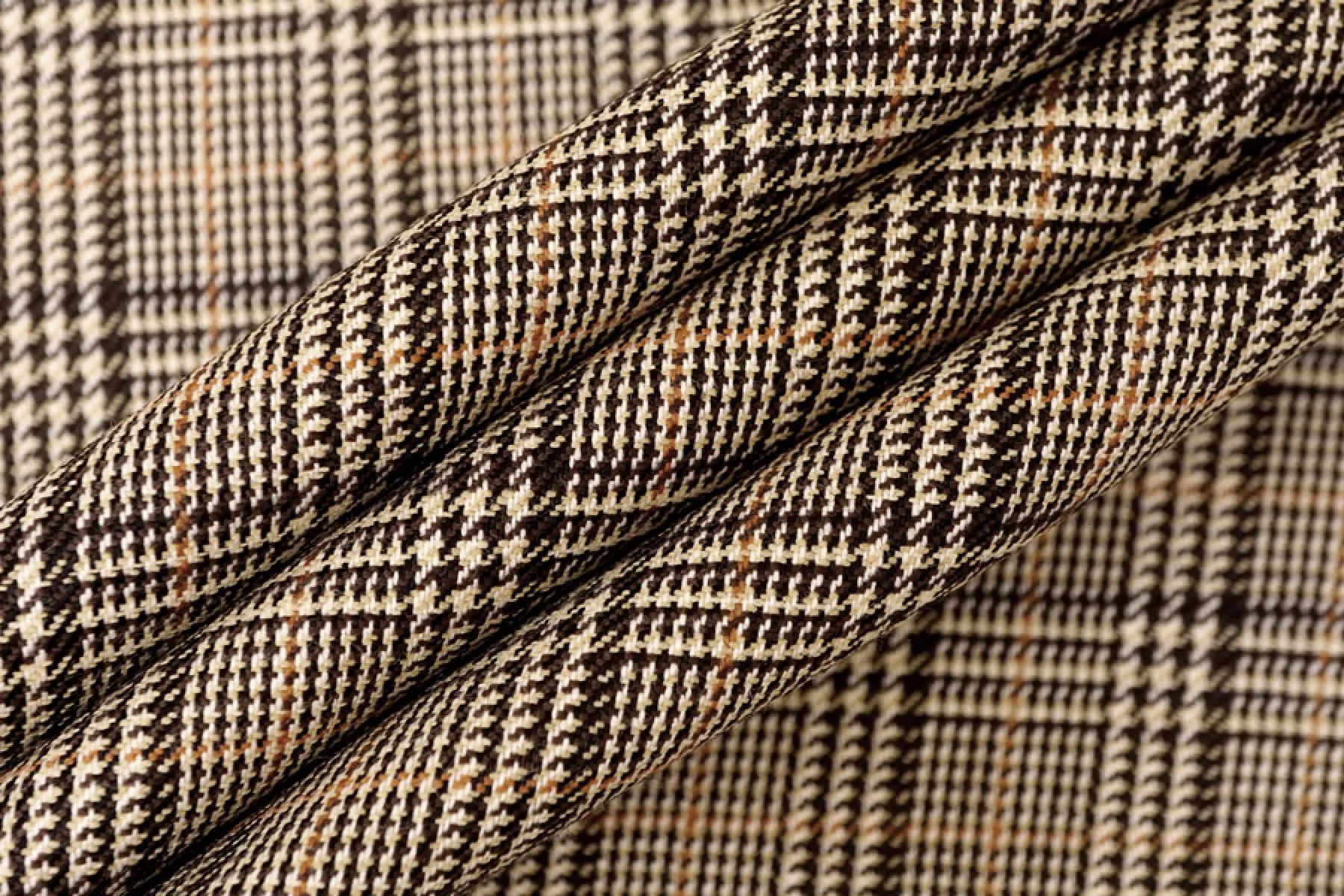 Прекрасная костюмная шерсть с шелком в коричнево-бежевую клетку. Тактильно гладкая и суховатая, колется. С красивым лоском. Не тянется. Не мнется. Пластичная. Хорошо драпируется и немного держит форму. Шьем теплые костюмы, юбки, рубашки. Уход деликатный.