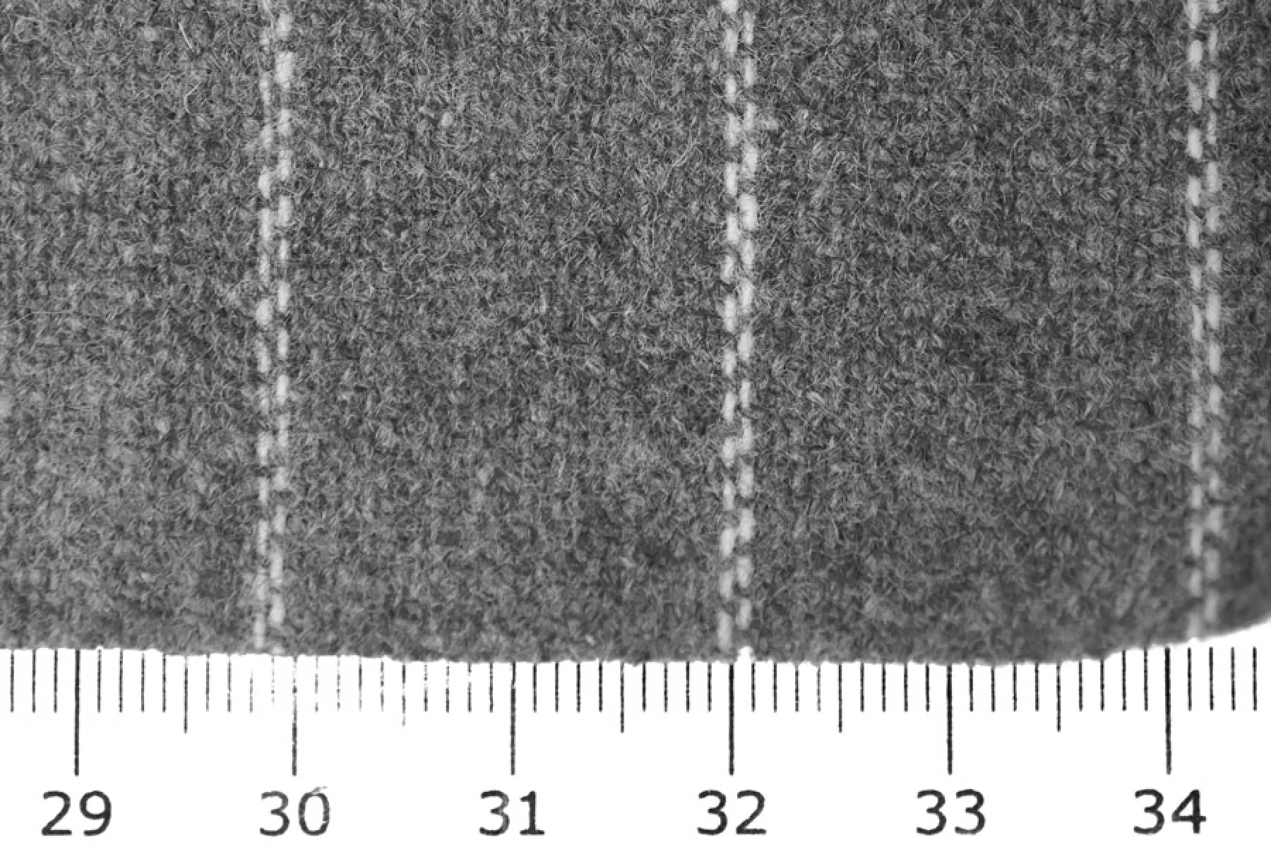 Прекрасная костюмная шерсть серого цвета в белую вертикальную полоску. Тактильно шероховатая, суховатая, немного колется. Слегка растягивается. Не просвечивает. Не мнется. Обладает легким лоском. Пластичная. Хорошо драпируется и держит форму. Шьем костюмы или теплые рубашки. Уход деликатный.