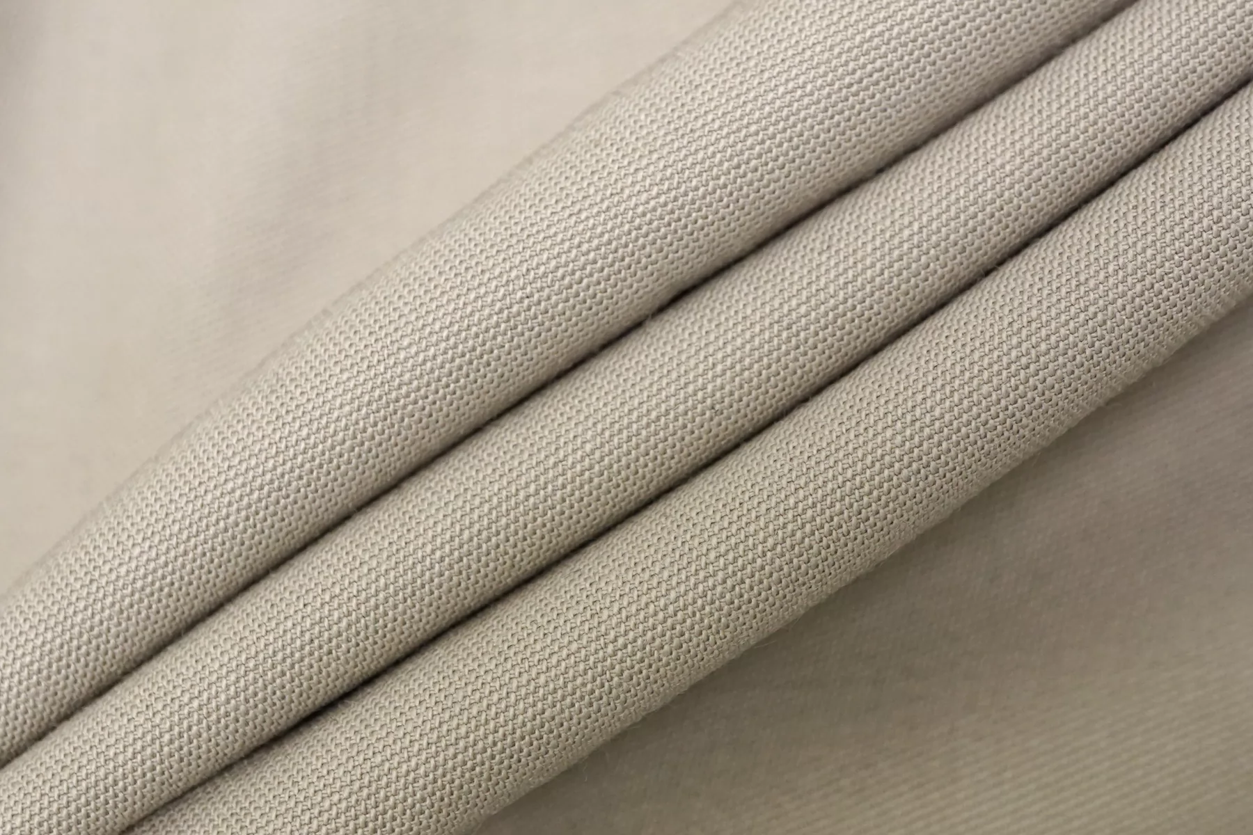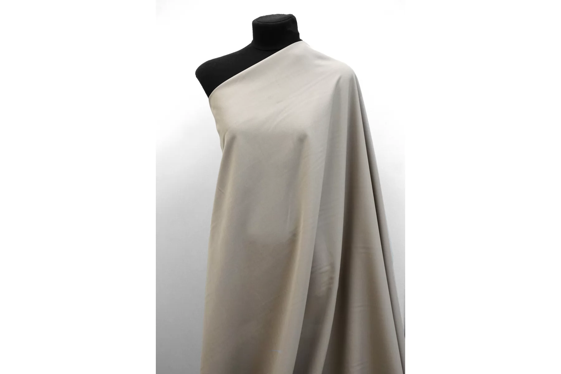 Костюмная шерсть диагонального плетения, в серо-бежевом цвете. Тактильно суховатая, плотная, гладкая. Чувствуется плетение наощупь. Чувствительной коже может слегка колоться. Не просвечивает, не тянется. Не мнется. Держит форму, умеренной пластичности. Используем для пошива костюмов, в том числе и мужских. При необходимости используйте подкладочный материал. Уход за шерстью деликатный.