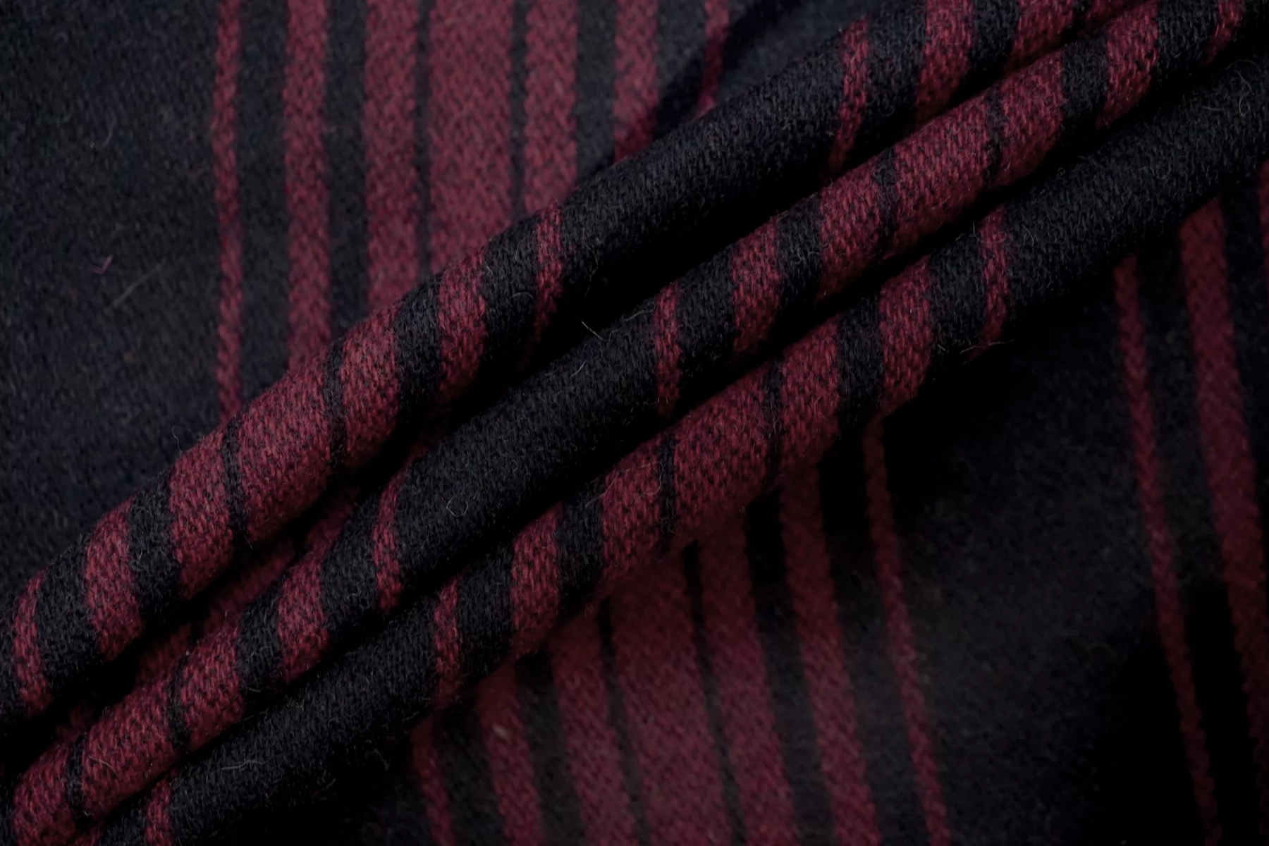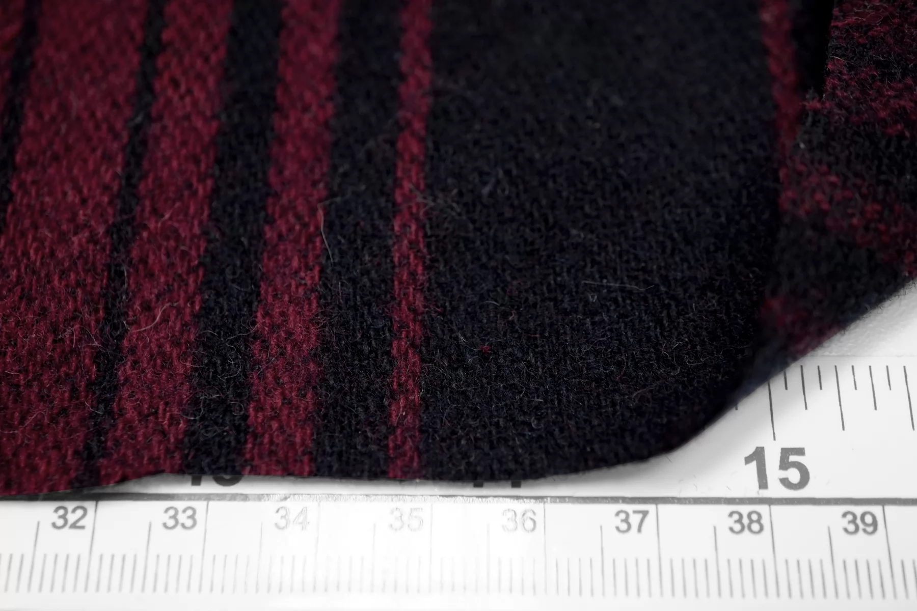 Интересная костюмная шерсть в полоскутемно-синего и бордового цвета. Тактильно слегка суховатая, практически не колется. Не тянется. Не мнется. Пластичная. Хорошо драпируется и умеренно держит форму. Шьем теплые костюмы, платья, юбки, теплые рубашки. Уход деликатный.