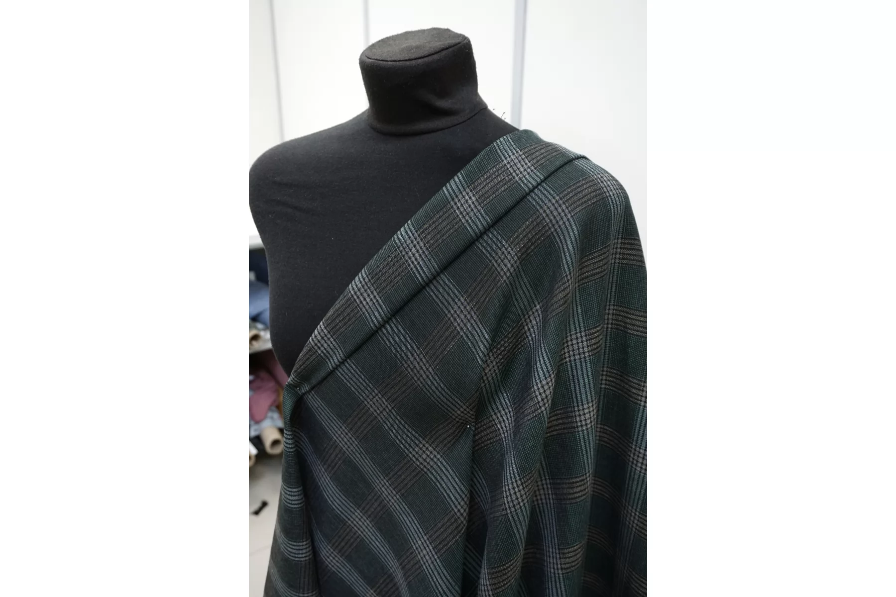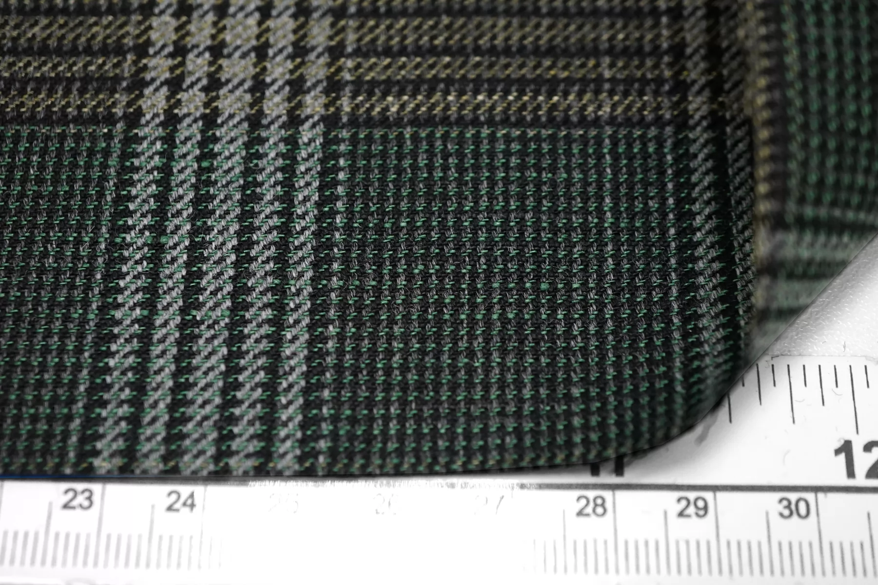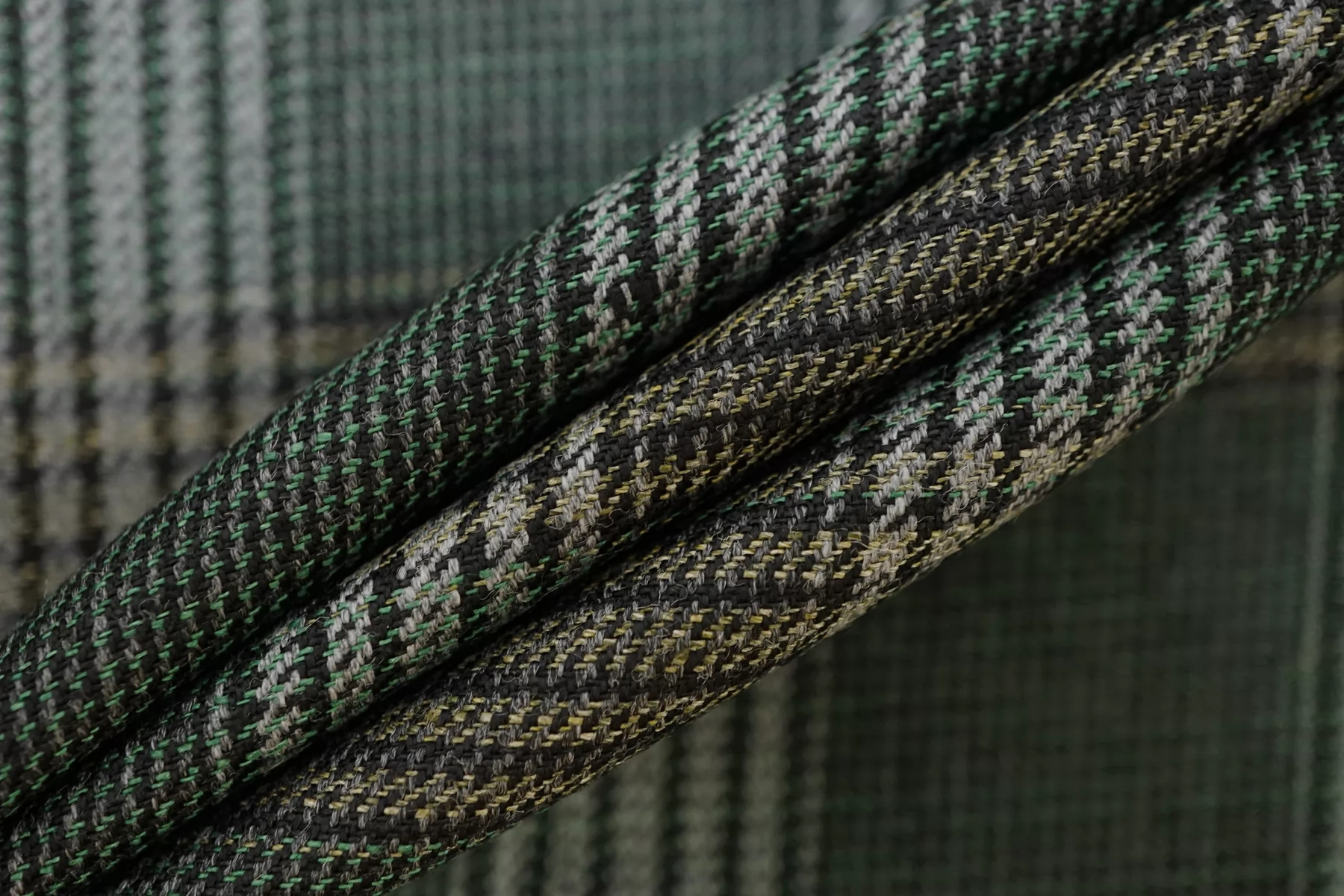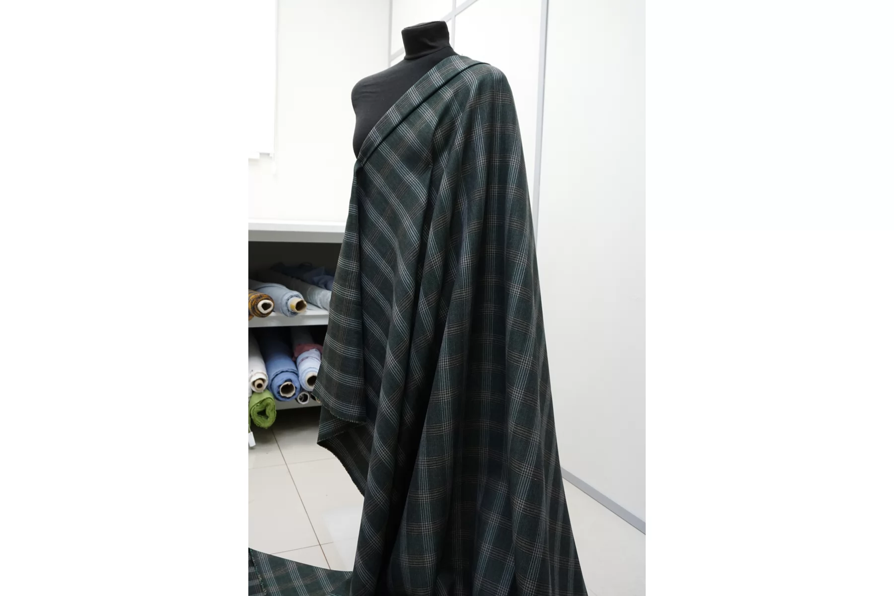 Шикарная позиция - костюмный лён с шерстью, с узором клеткой, нити черного, серого и зелёного цвета. Тактильно ткань суховатая, чувствуется и шерсть и лен. Не просвечивает, не тянется, форму держит. Используем для пошива костюмов, зимних платьев и юбок. При необходимости используйте подкладочный материал.