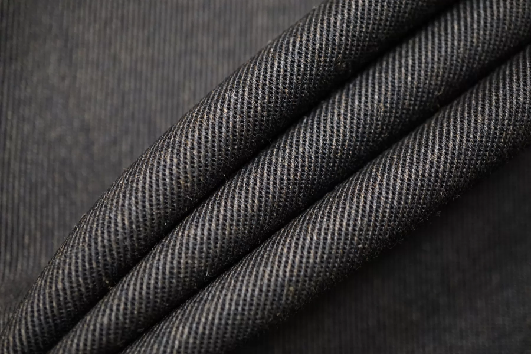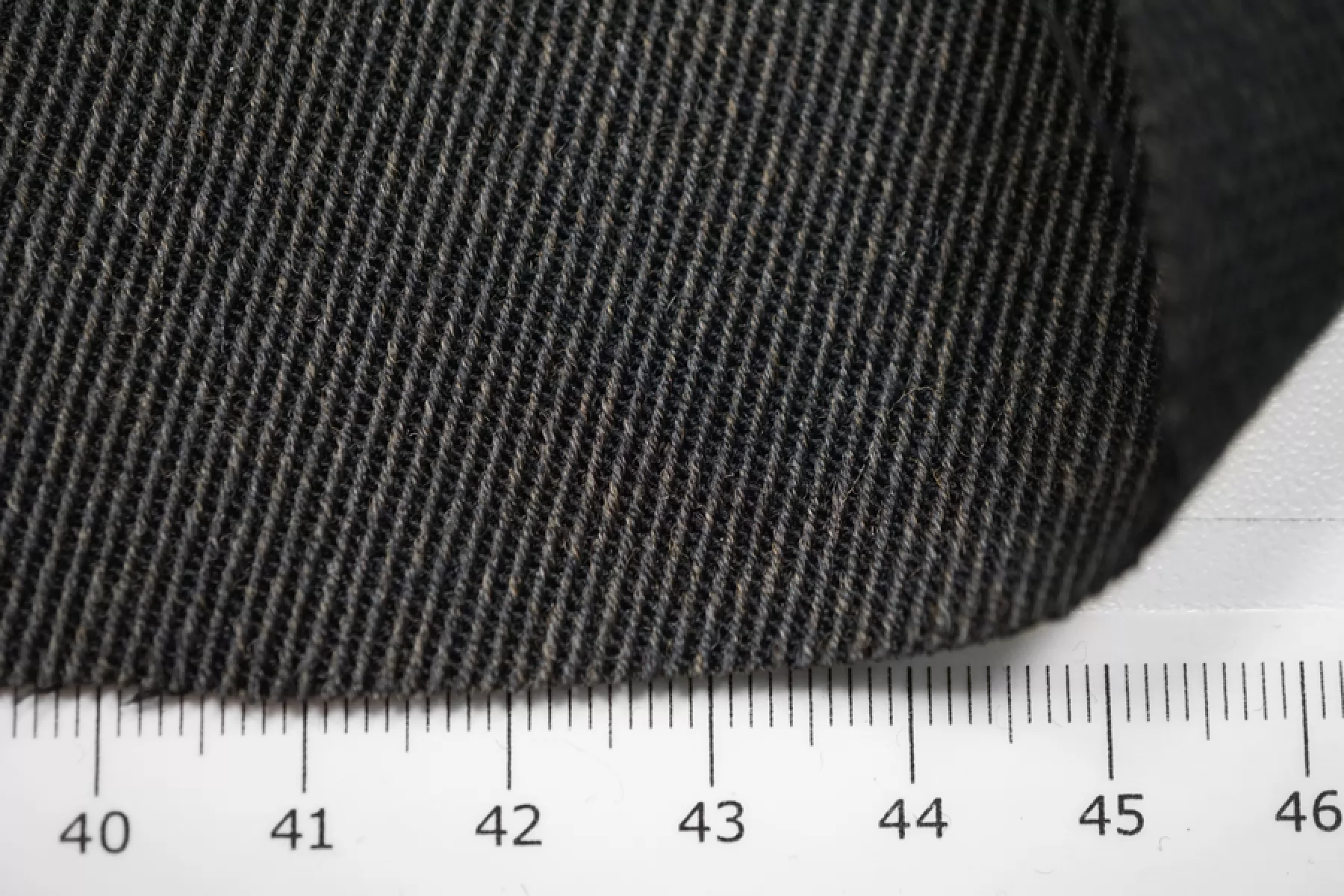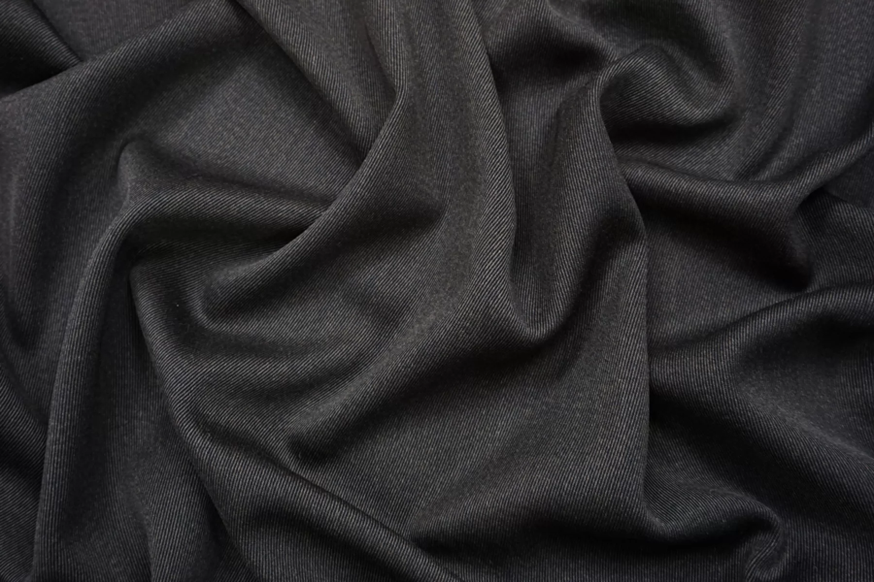 Костюмная шерсть диагонального плетения с выраженным рубчиком, в темно-сером цвете. Плотная, пластичная, не просвечивает, тянется. Подойдет для пошива теплой юбки, пиджака, брюк, платья.