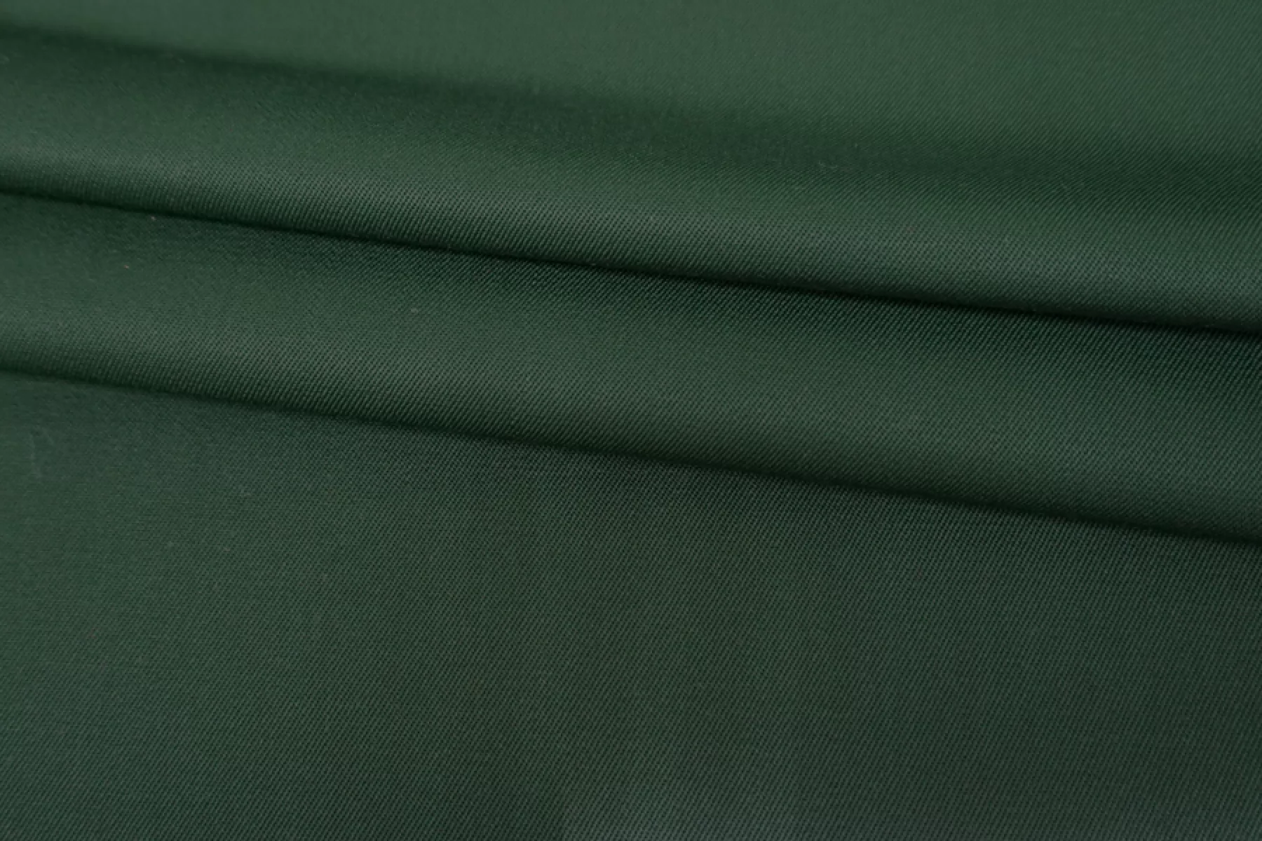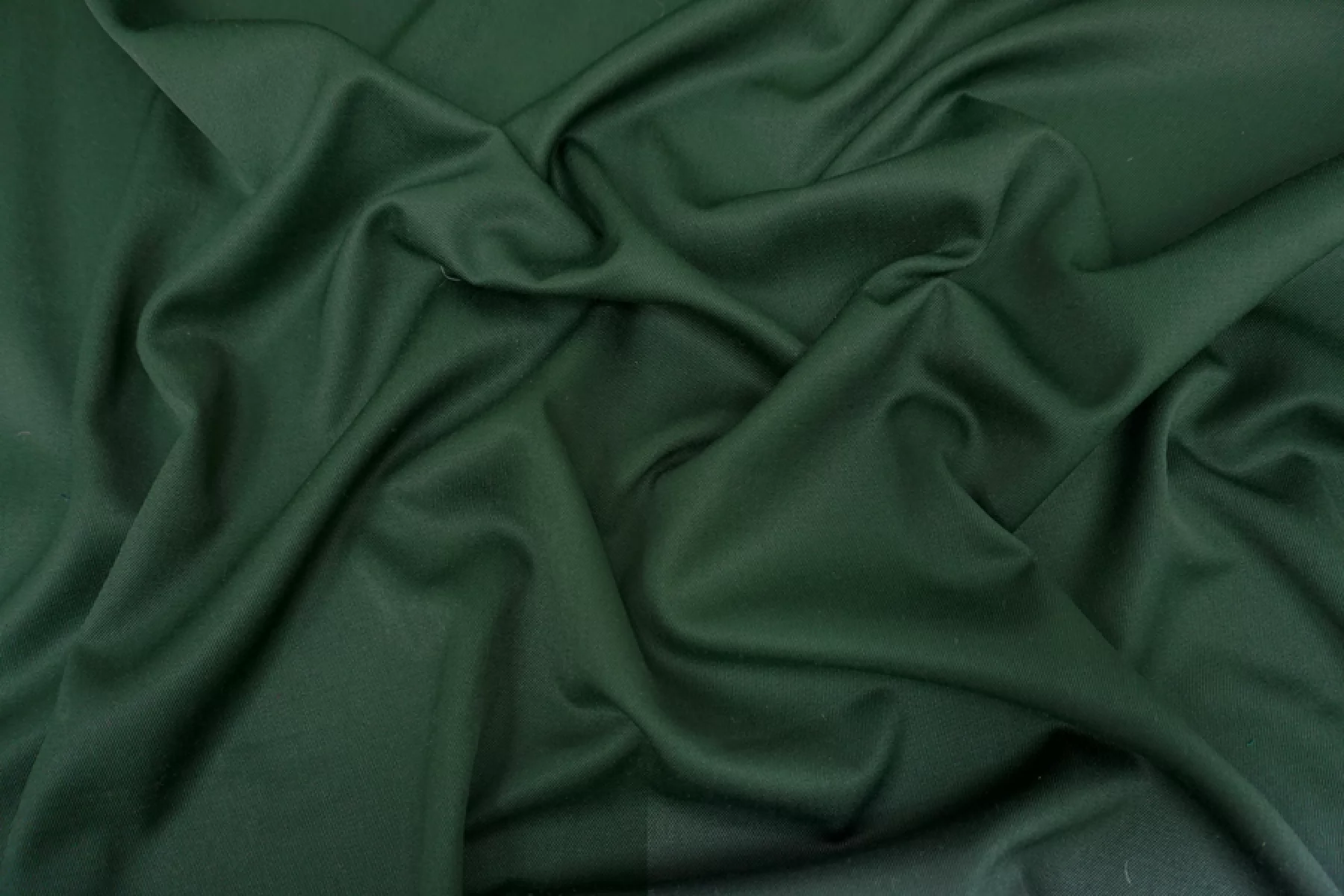 Костюмная шерсть диагонального плетения в красивом темно-зеленом, слегка приглушенном оттенке. Тактильно суховатая, совсем слегка шероховатая, не колется, но при необходимости используйте подкладочный материал. Пластичная. Обладает очень легким лоском. Не просвечивает. Не тянется. Хорошо драпируется и немного держит форму. Практически не мнется. Отличный вариант на жакеты, брюки, юбки и костюмные варианты. Уход деликатный.