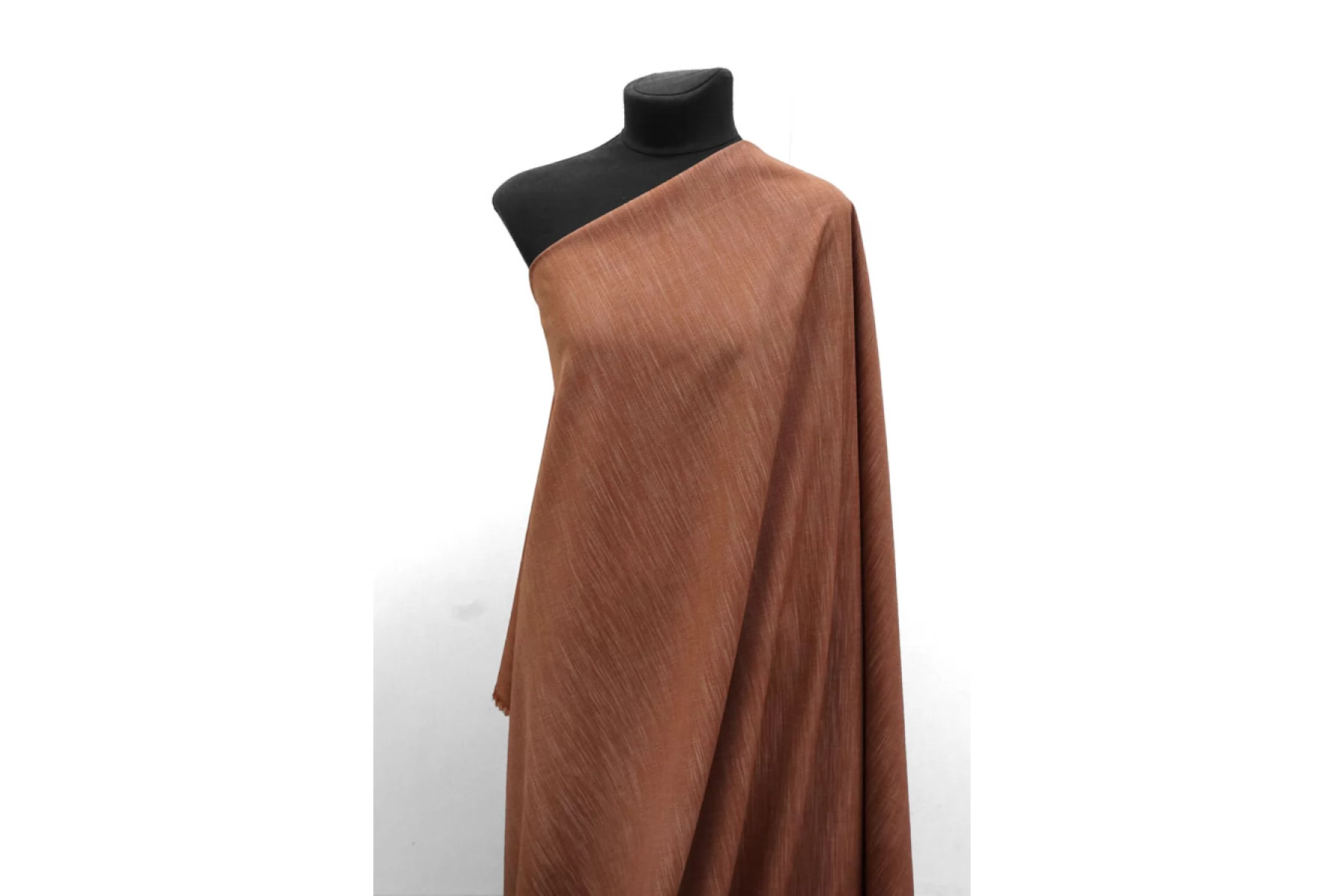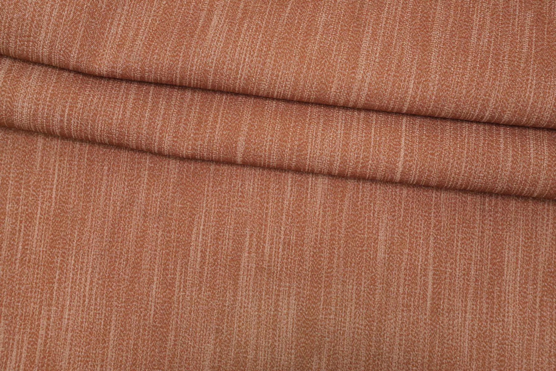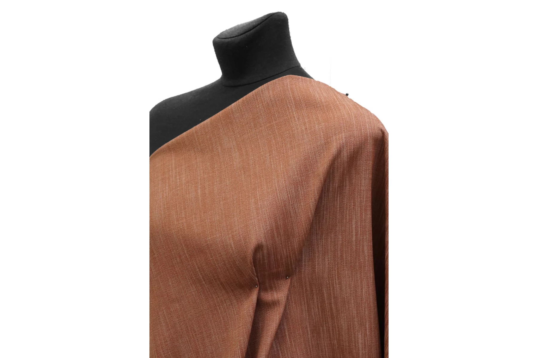 Очень интересная шерсть с вискозой костюмной плотности в приятном светло-терракотовом оттенке. Переплетение нитей терракотового и бледно-террактового оттенка образуют полоски вдоль полотна. Тактильно гладка, слегка как-будто креповая. Плотная, хотя пластичная и не толстая. Немного светит. Не мнется. Форму не держит. Шьем зимние платья, юбки, брюки, мягкие жакеты. Уход деликатный.