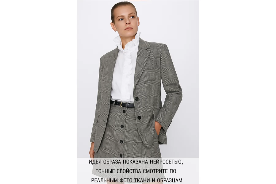 Прекрасная костюмная шерсть в черно-белую клетку. Тактильно гладкая и суховатая, колется. С красивым лоском. Не тянется. Не мнется. Пластичная. Хорошо драпируется и немного держит форму. Шьем теплые костюмы, юбки, рубашки, платья. Уход деликатный.