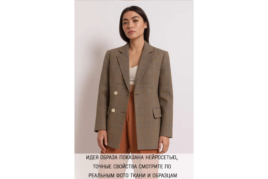 Очень необычная и красивая шерсть костюмной плотности в очень интересной расцветке в серовато-коричневом цвете с легкой довольно крупной клеткой из светло оранжевых и голубы нитей. Смотрится очень дорого и элегантно. Шероховатая и приятная тактильно, покалывает. Несмотря на то что ткань тонкая, она очень плотная и формодержащая. Обладает хорошей пластикой и не тянется, что обеспечит хорошую посадку по фигуре. Очень красива в складке. Не просвечивает. Элегантный выбор для пошива жакетов, платьев, брюк, юбок и костюмов. Рекомендуется деликатный уход для сохранения безупречного вида.