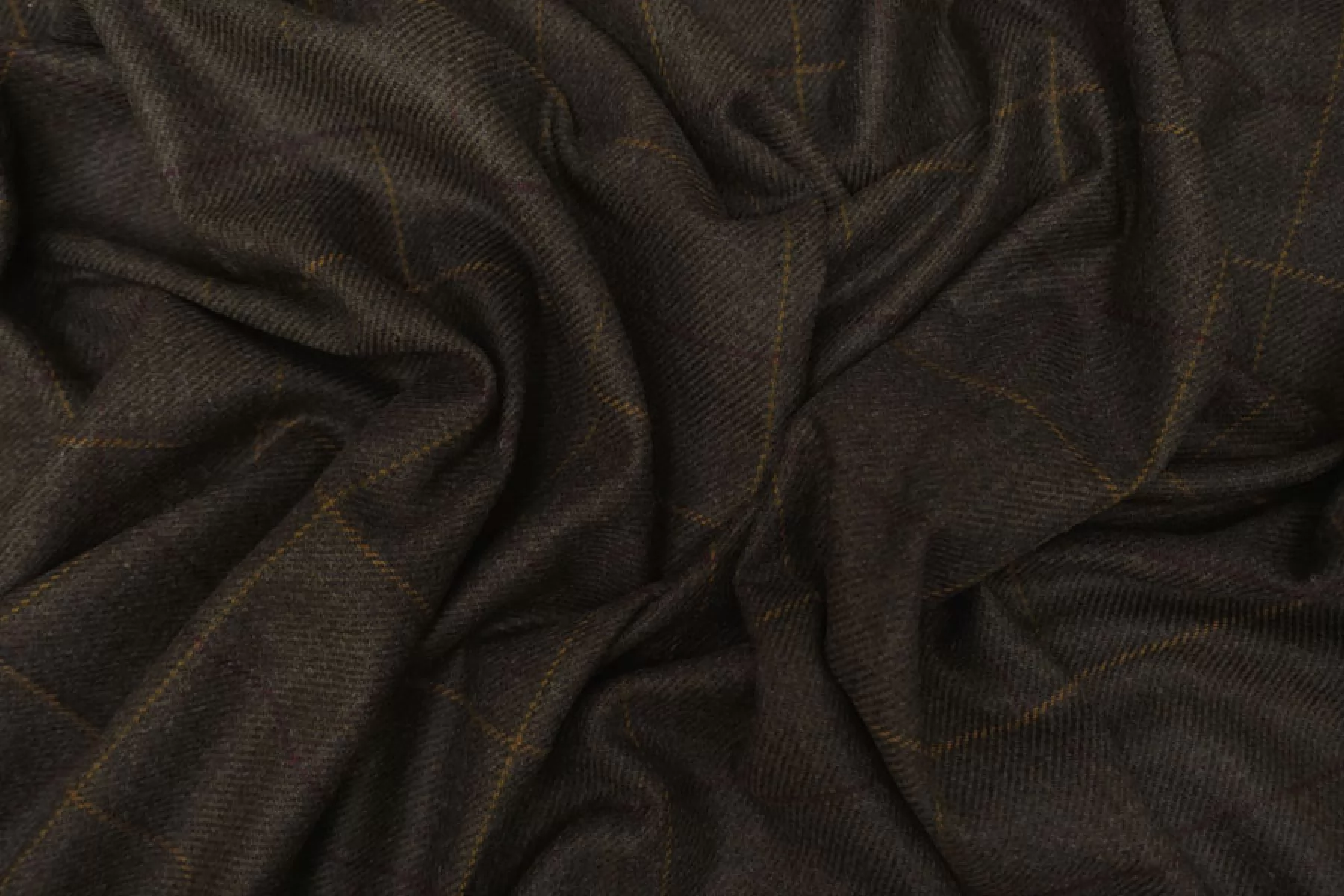 Прекрасная костюмная шерсть оттенка зеленый хаки в клетку диагонального плетения. Тактильно шероховатая и суховатая, колется. С красивым лоском. Немного тянется. Не мнется. Пластичная. Хорошо драпируется и держит форму. Шьем теплые костюмы, платья, юбки, теплые рубашки. Уход деликатный.