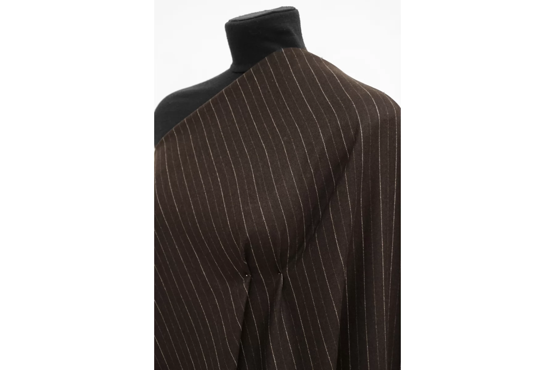 Шикарная итальянская костюмная шерсть коричневого цвета в вертикальную полоску. Суховатая наощупь с очень легким ворсом, колется. Плотная. Немножко растягивается. Не мнется. Обладает легким лоском. Пластичная. Держит форму. Шьем костюмы, платья, юбки или теплые рубашки. Уход деликатный.