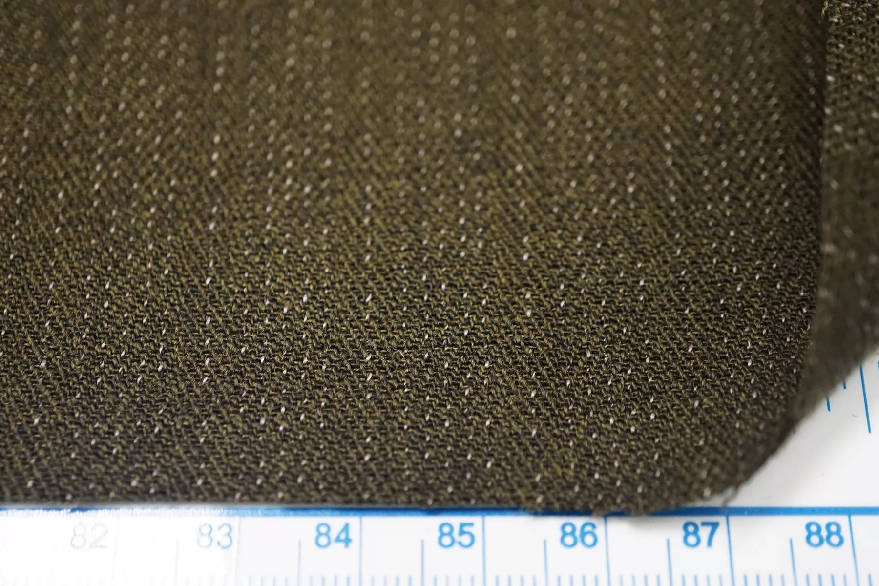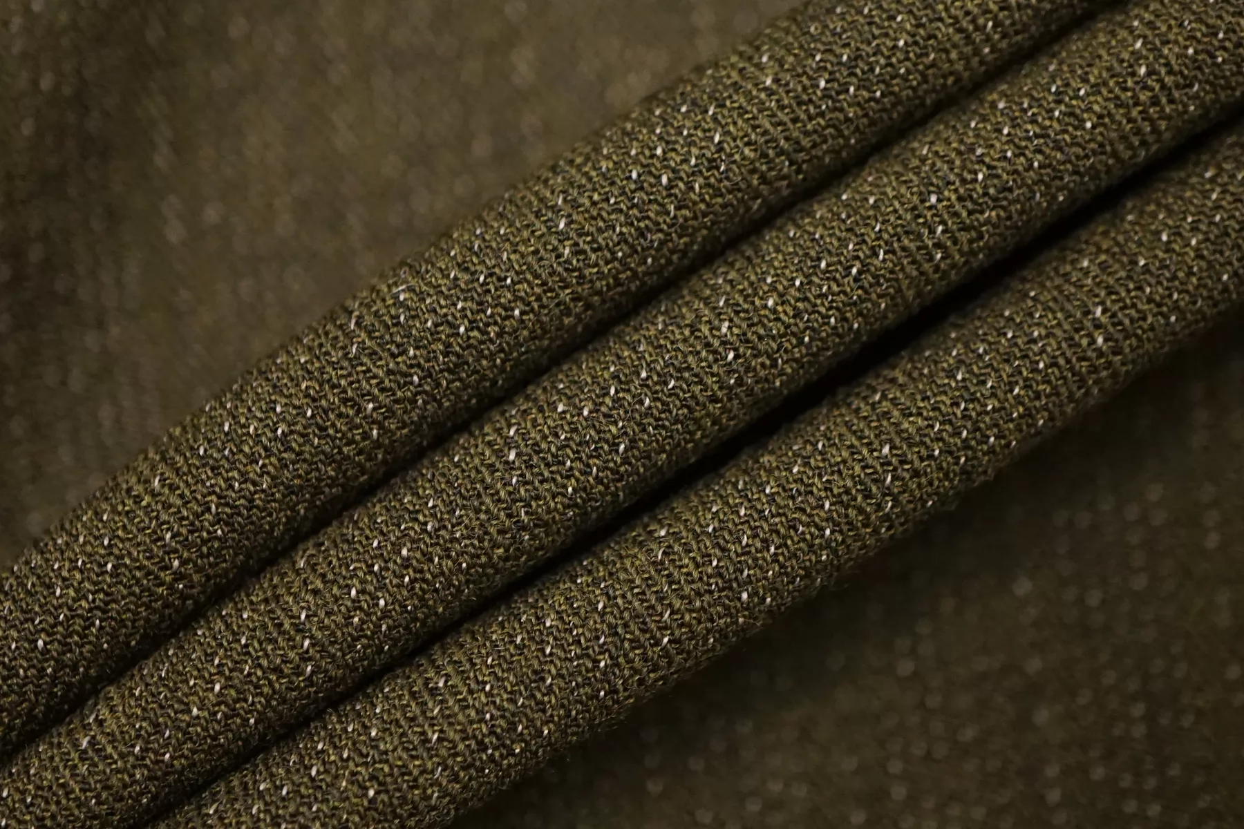 Итальянская костюмная шерсть в интересном, не ярком оттенке зелёного хаки (с желтинкой), плюс вплетена светло-серая нить крапинками. Не просвечивает, пластичная, достаточно плотная. Слегка суховатая тактильно, чуть покалывает. Форму держит. Немного тянется. Не мнется. Подойдет для пошива жакета, брюк, платья, юбки, костюма.