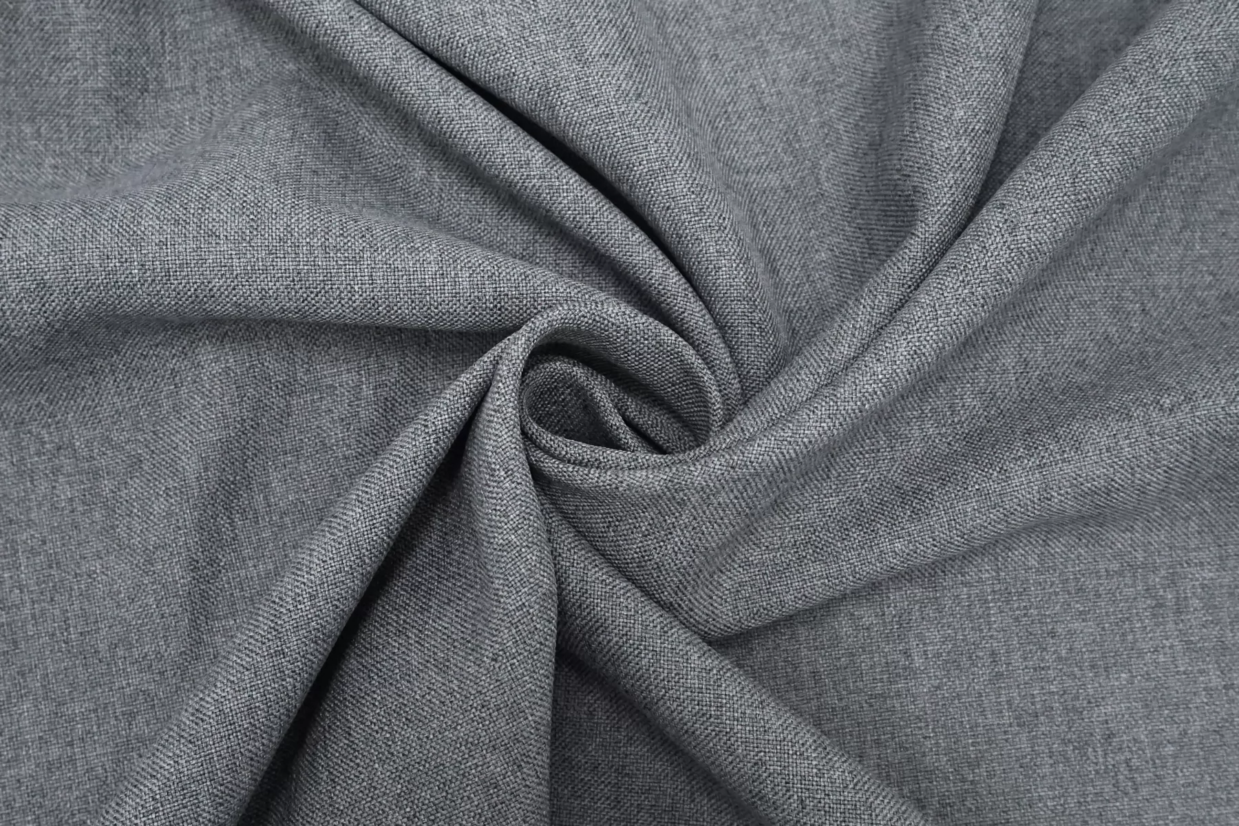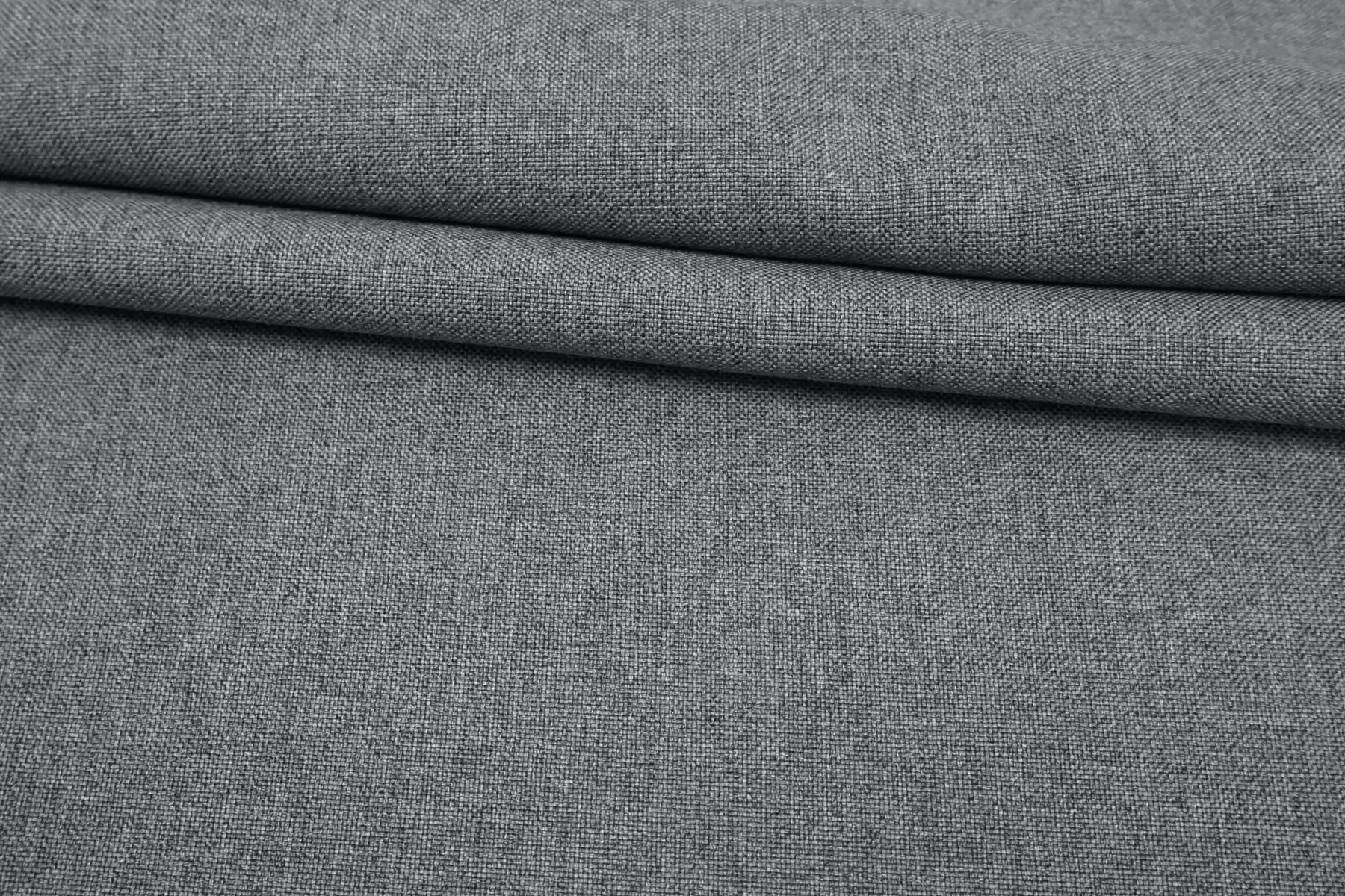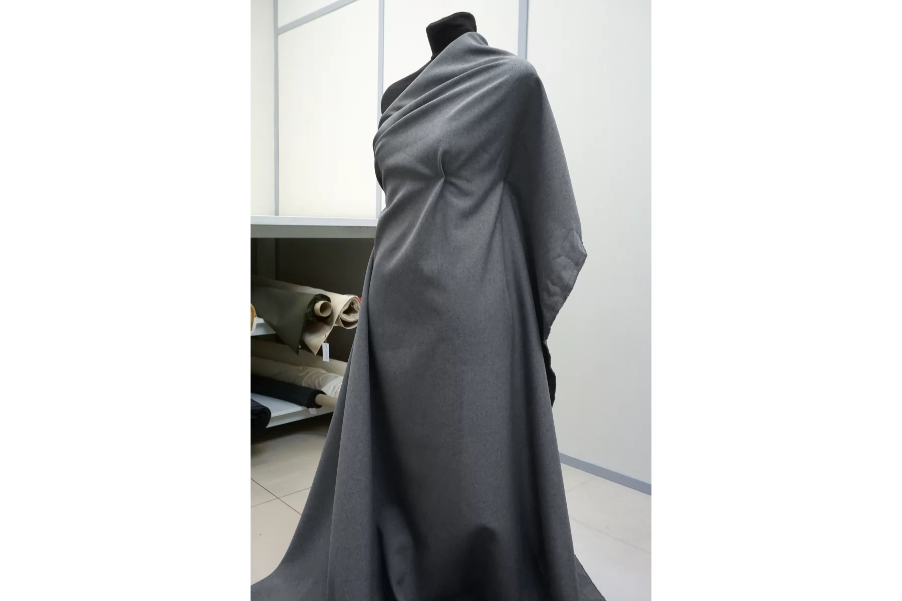 Костюмная ткань из полиэстера в сером цвете. Плотная, но при этом не толстая. Тактильно чуть грубовата, не тянется. Не просвечивает, держит форму. Подойдет для пошива костюма, или макета. При необходимости используйте подкладочный материал.