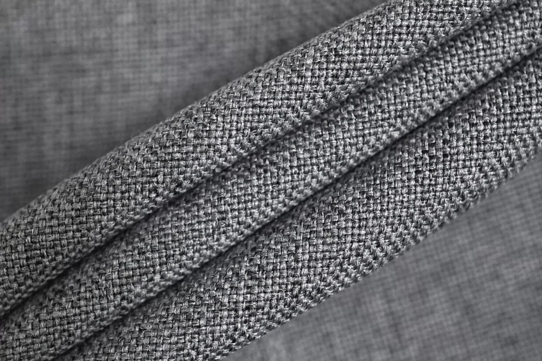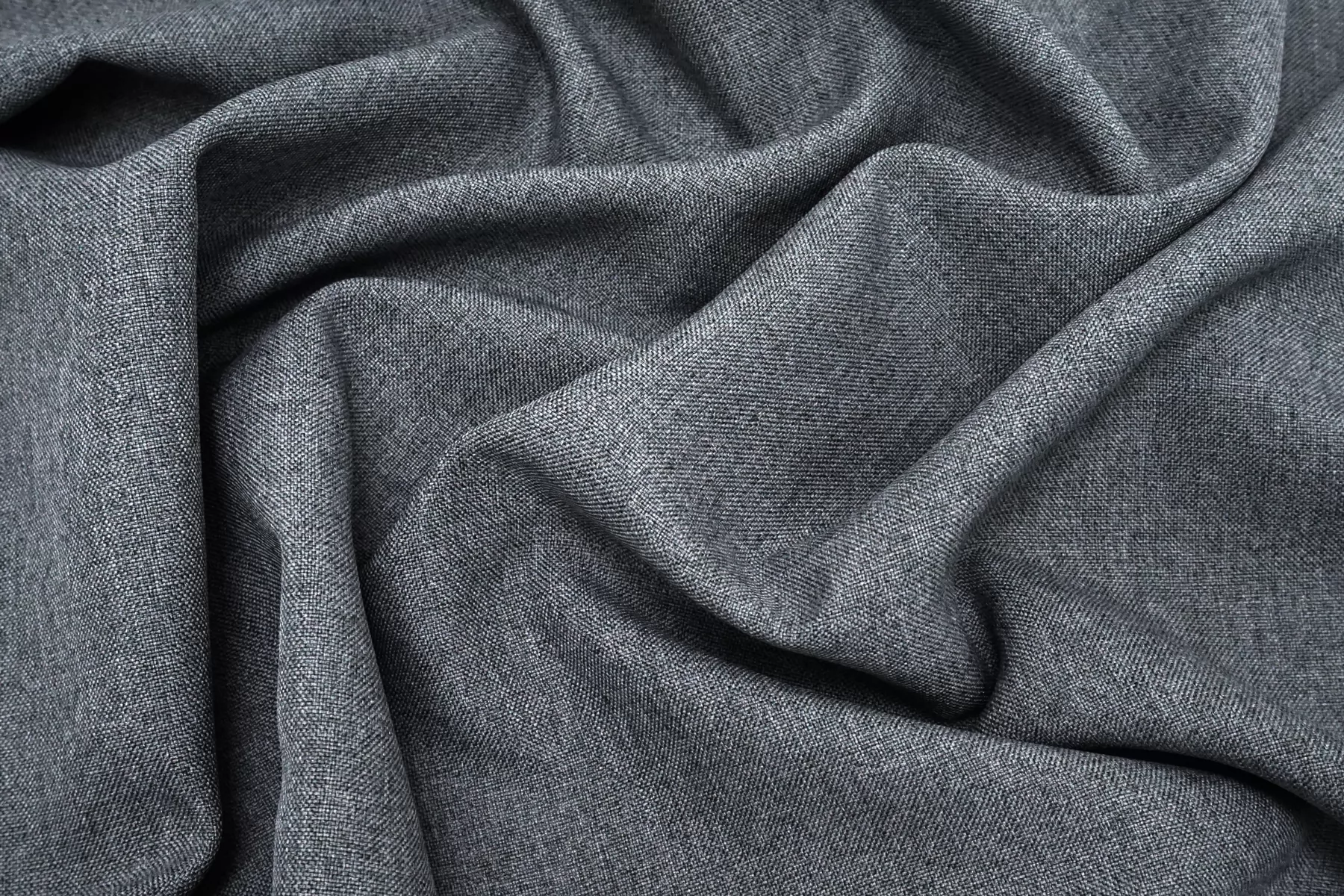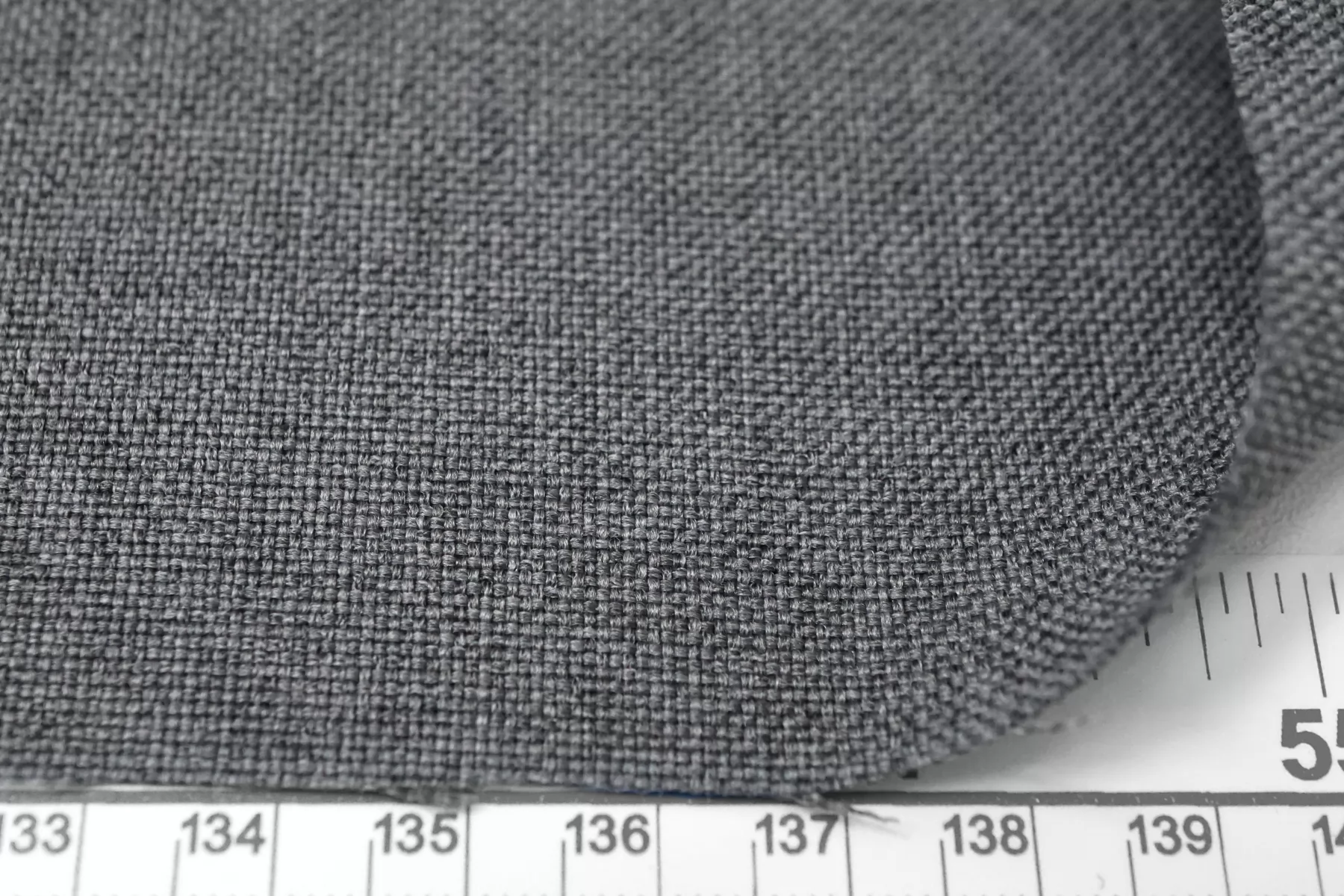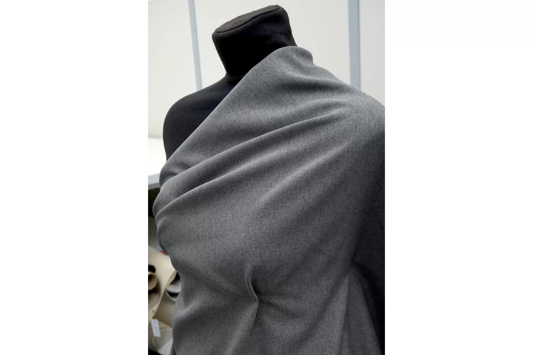 Костюмная ткань из полиэстера в сером цвете. Плотная, но при этом не толстая. Тактильно чуть грубовата, не тянется. Не просвечивает, держит форму. Подойдет для пошива костюма, или макета. При необходимости используйте подкладочный материал.