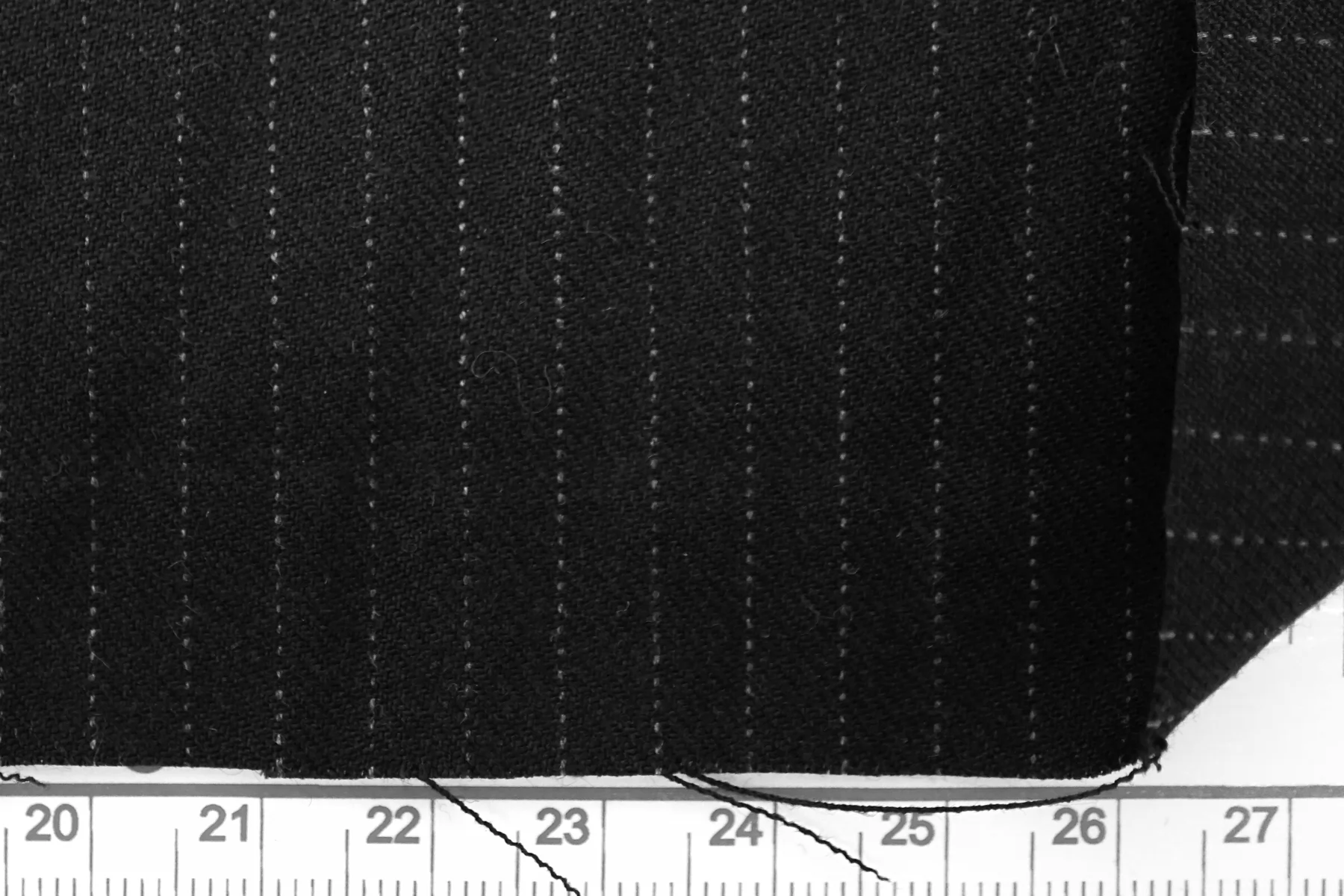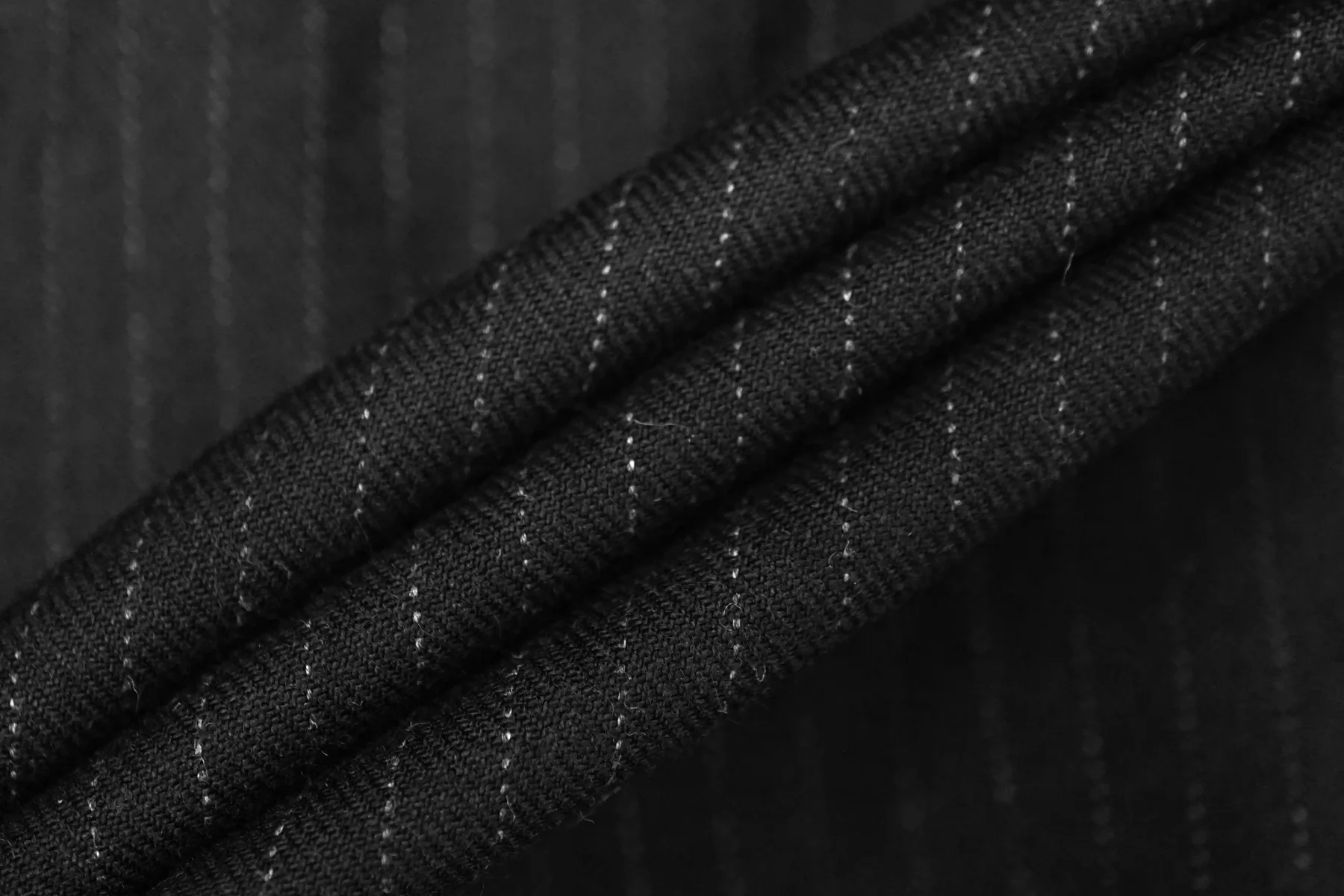 Костюмная вискоза с полиэстером, диагонального плетения, чёрного цвета в тонкую серую полоску. Материал тактильно приятный и мягкий, гладкий, тонкий, но плотненький, не мнется. Обладает хорошей износостойкостью. Красив в своей пластике. Не просвечивает. Немного держит форму. Хорошо тянется за счет содержания эластана. Шьем жакеты, костюмы, платья, юбки, брюки и не только. Рекомендуется деликатный уход.