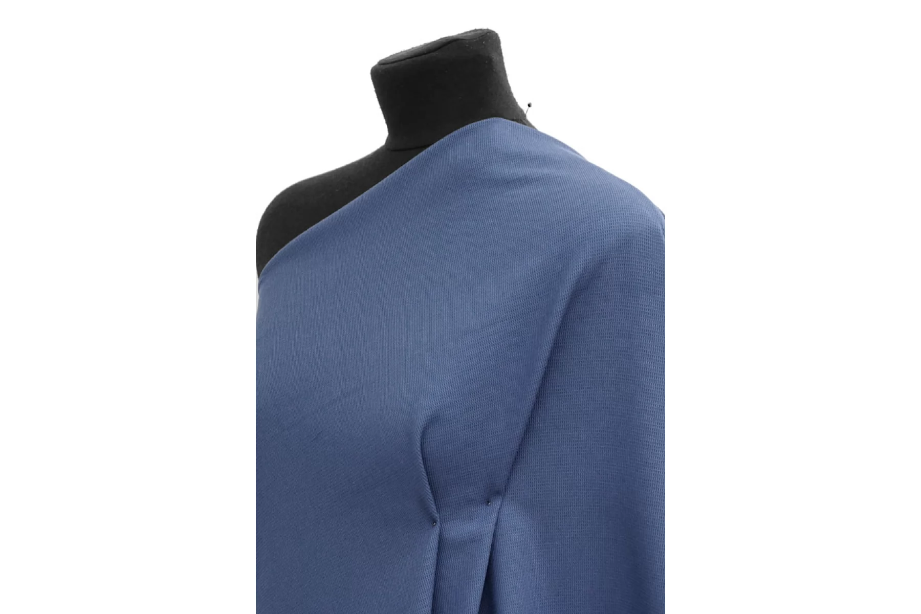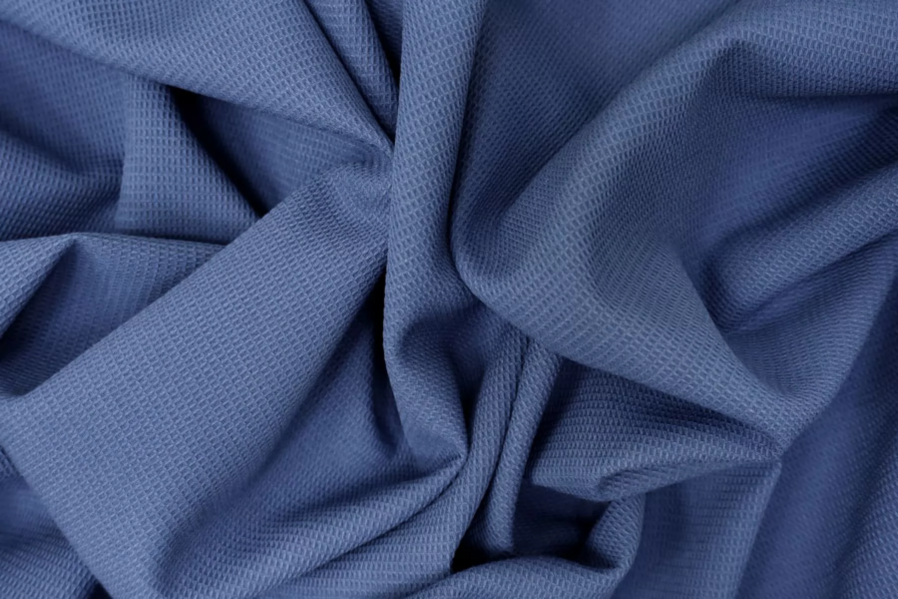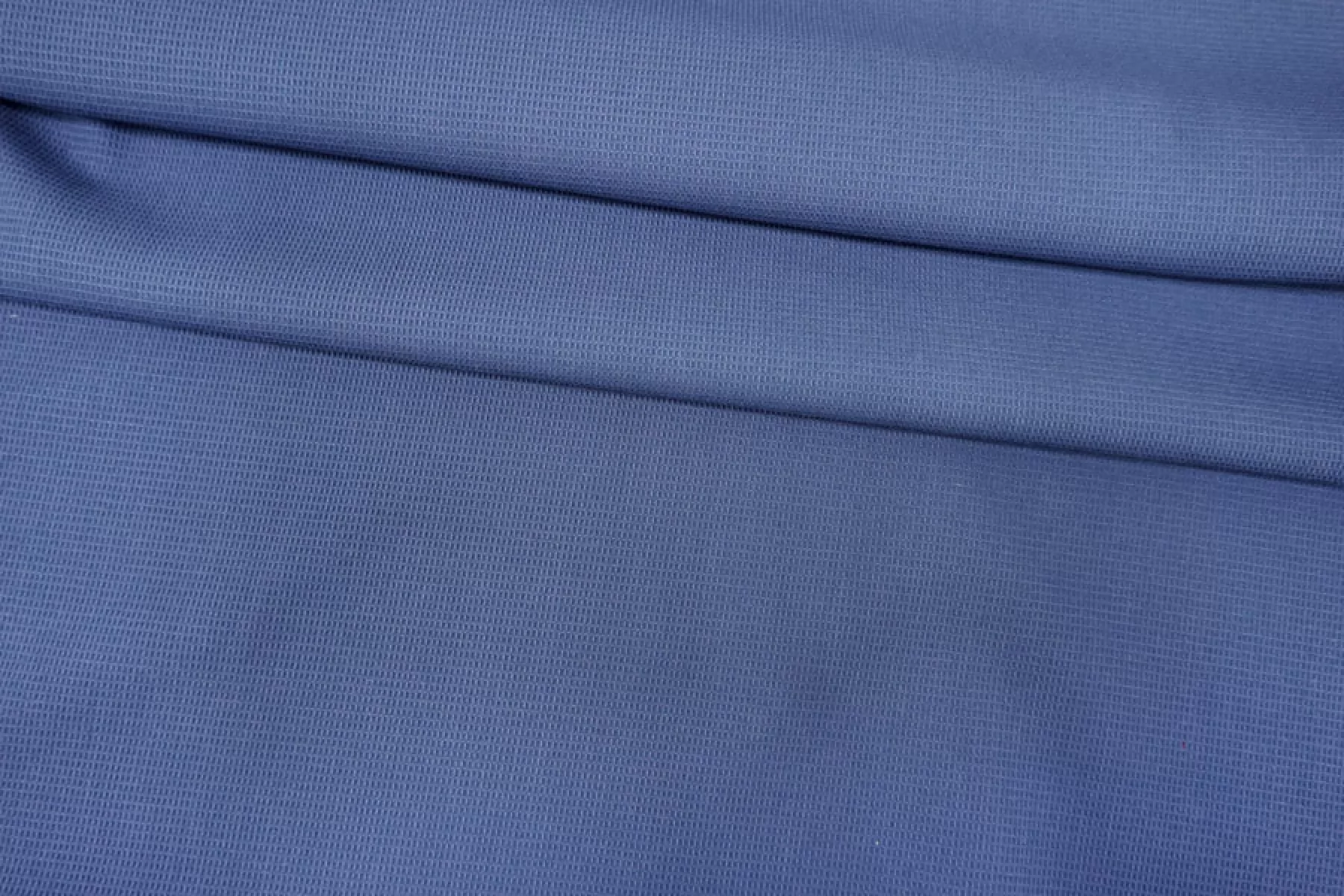 Костюмно-плательная поливискоза припыленно-синего оттенка (неяркий, сине-серый). Фактура вафельная. Пластичная, эластичная. Не просвечивает, немного держит форму. Подойдет для пошива костюмов мягкой формы, платьев, юбок, брюк и шорт.