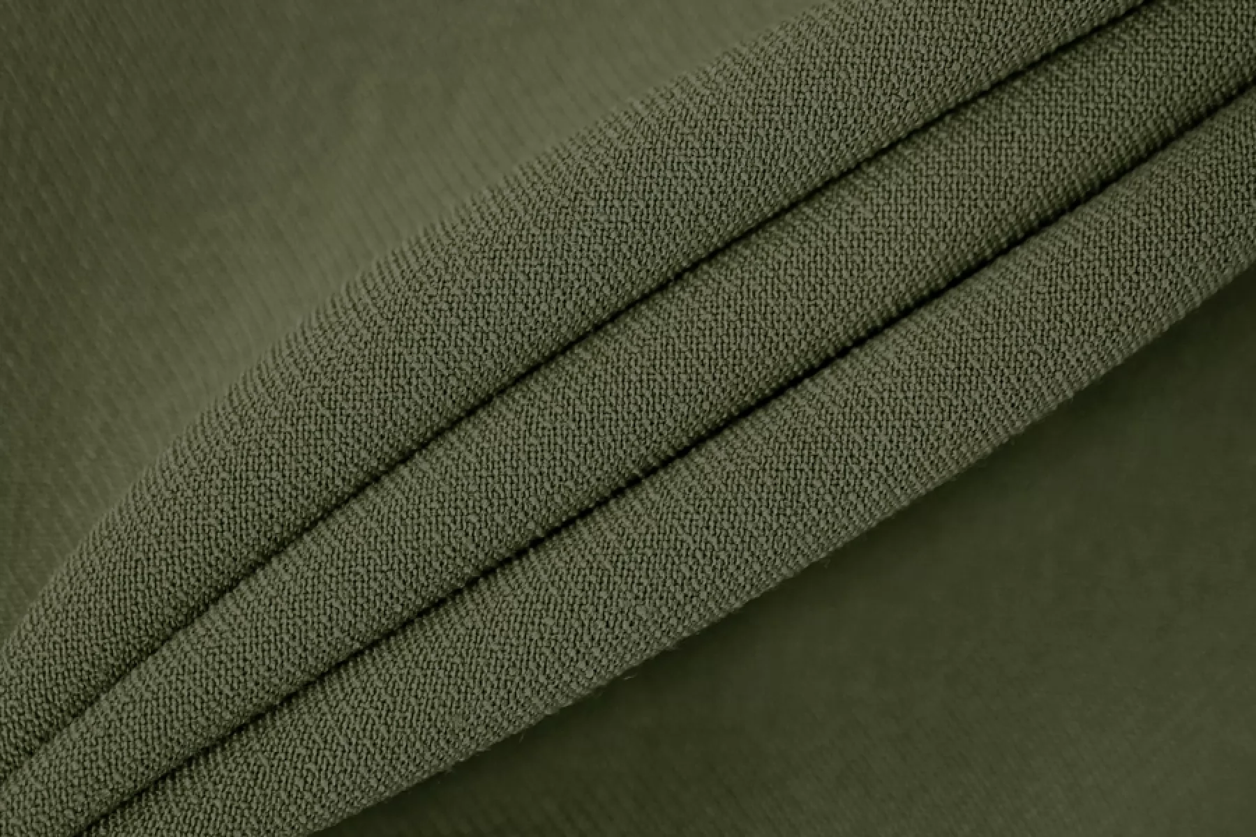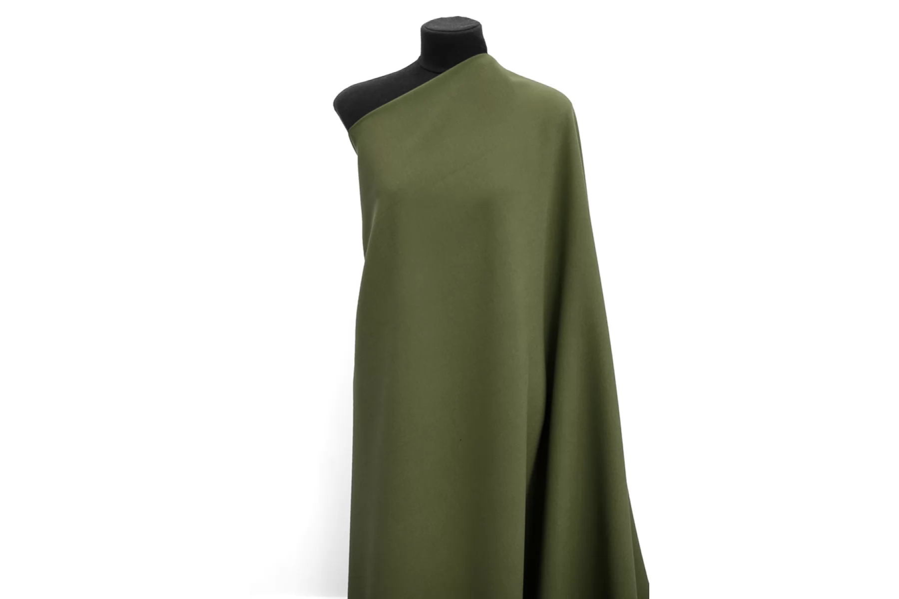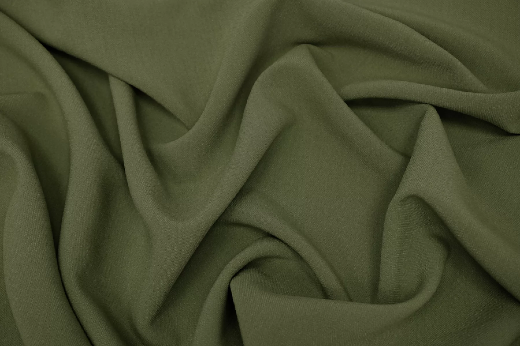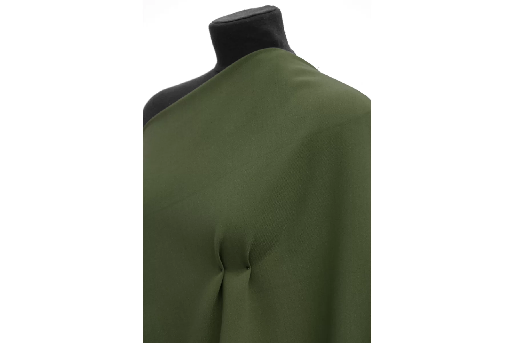 Костюмная поливискоза би-стрейч оттенка заленый хаки. Приятная и креповая наощупь. Пластичная, тянется во все стороны, не просвечивает. Ткань проста в уходе и износостойка. Хорошо драпируется и не вытягивается в локтях и коленях. Подойдет для пошива классических костюмов, платья, юбки, мягких жакетов и легких пальто. Во избежании появления катышек рекомендуем бережный отжим!