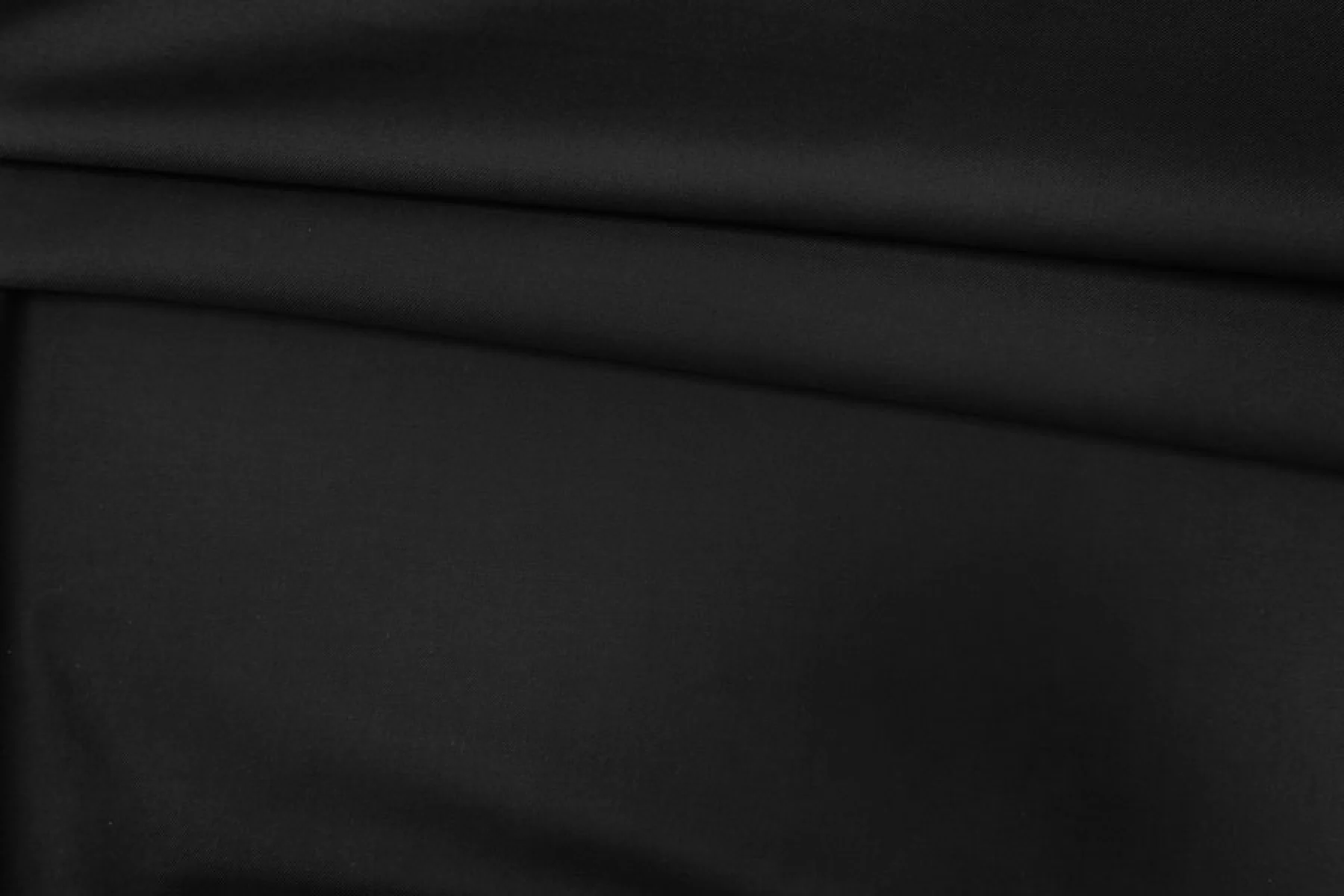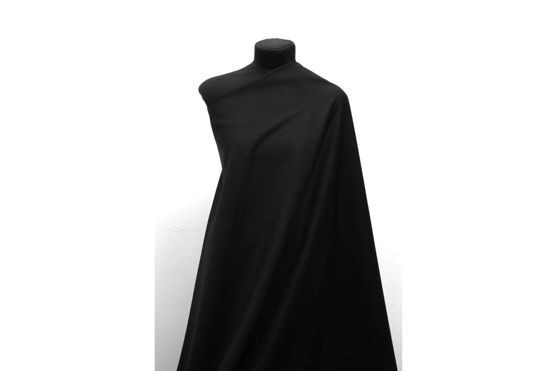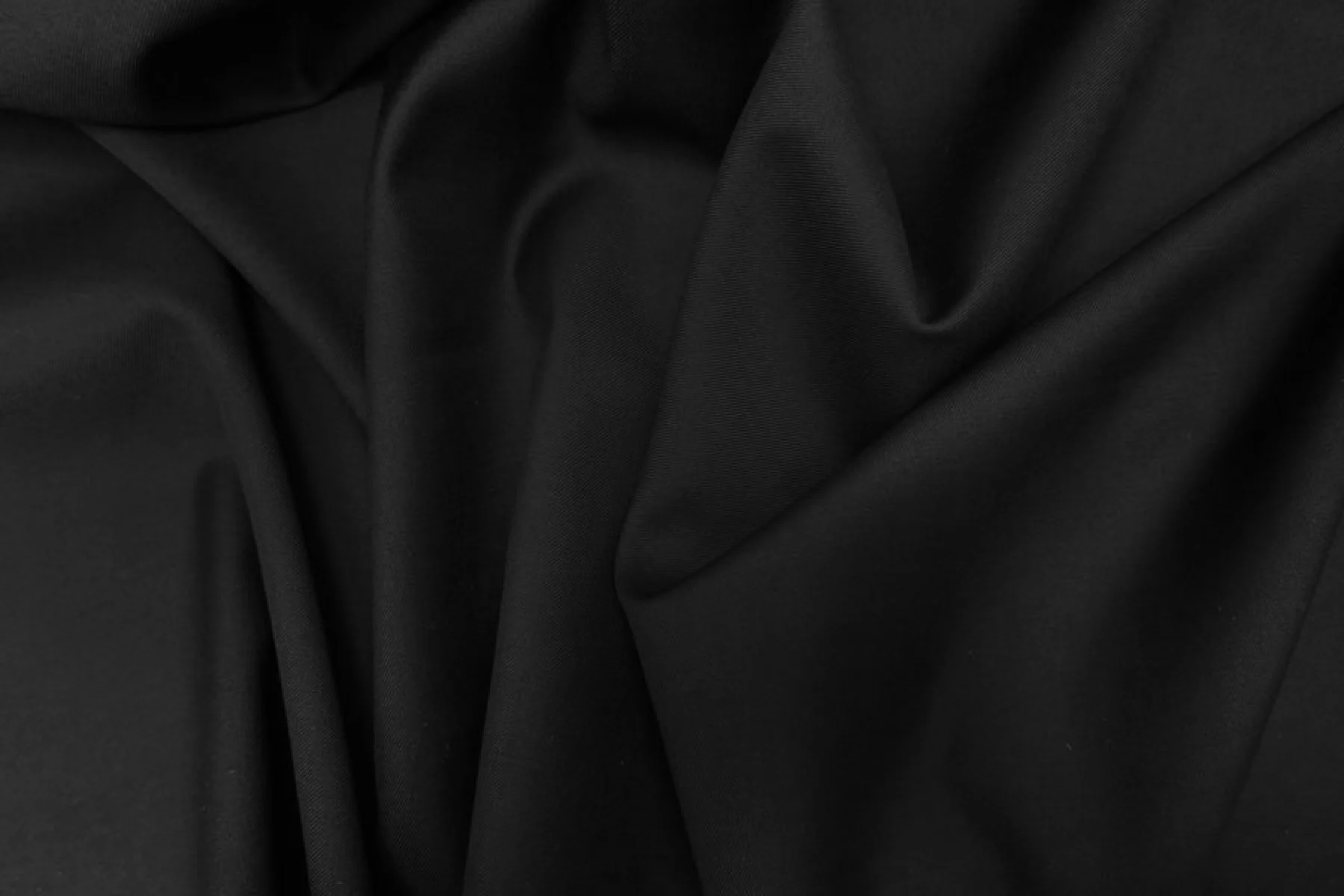 Костюмно-плательная шерсть диагонального плетения классического черного цвета. Тактильно мягкая, слегка суховатая, приятная. Немного колется. Обладает очень легким приятным лоском. Тонкая, но при этом плотная. Не просвечивает, но если смотреть прямо на просвет, заметен силуэт. Не тянется. Красиво драпируется и немного держит форму. Прекрасный вариант на костюмы, платья, юбки. При необходимости используйте подкладочный материал. Уход деликатный.