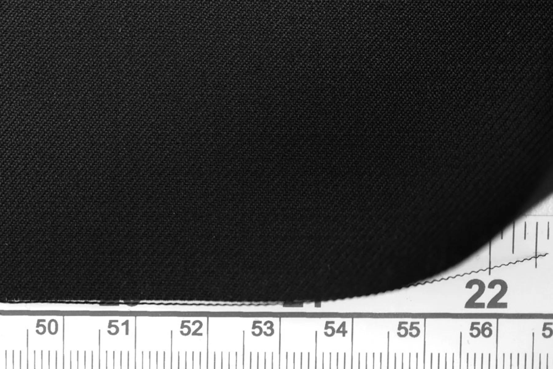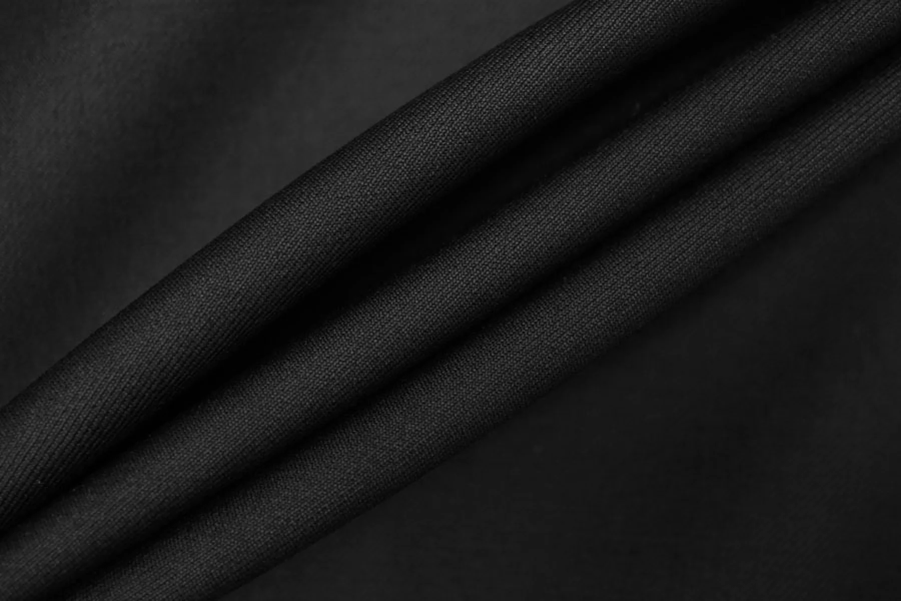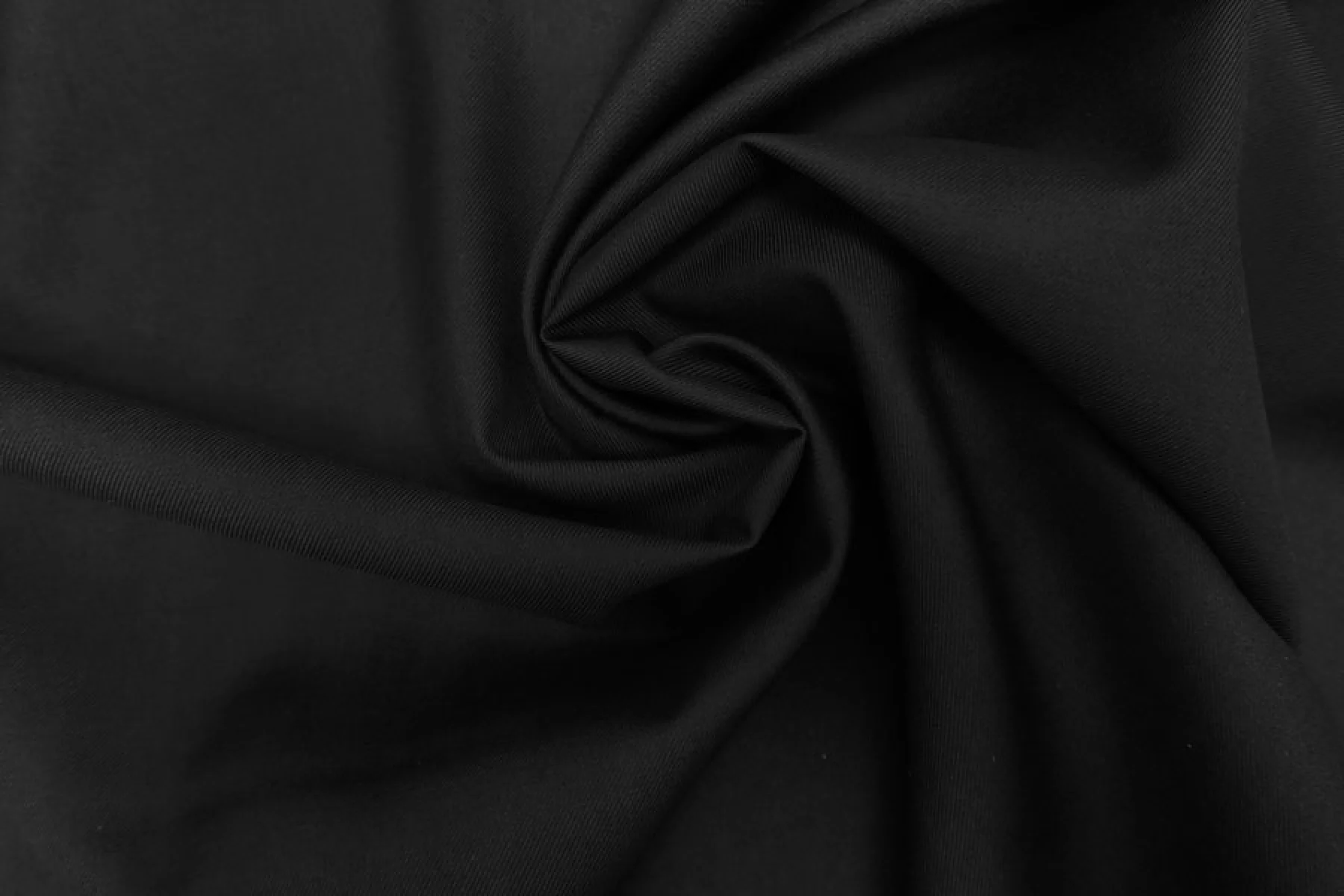 Костюмно-плательная шерсть диагонального плетения классического черного цвета. Тактильно мягкая, слегка суховатая, приятная. Немного колется. Обладает очень легким приятным лоском. Тонкая, но при этом плотная. Не просвечивает, но если смотреть прямо на просвет, заметен силуэт. Не тянется. Красиво драпируется и немного держит форму. Прекрасный вариант на костюмы, платья, юбки. При необходимости используйте подкладочный материал. Уход деликатный.