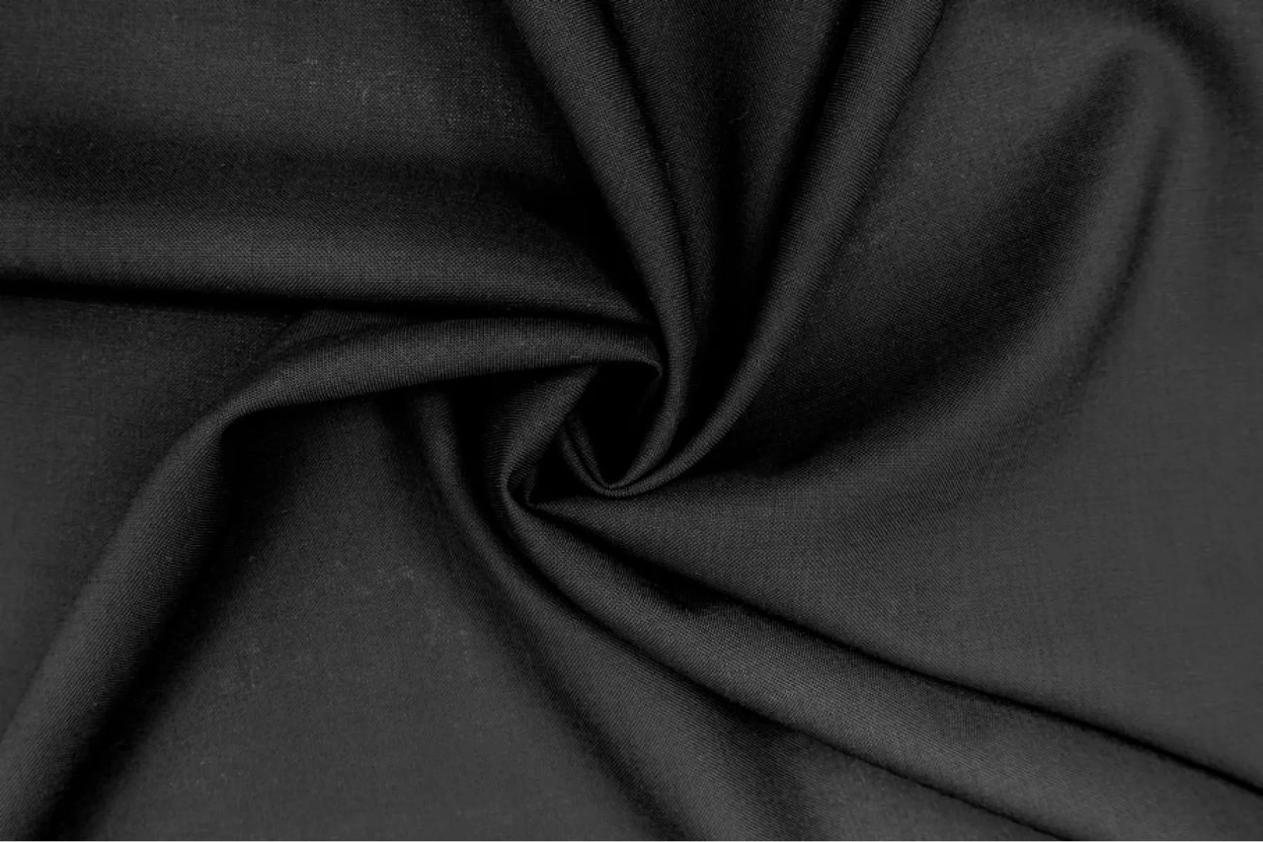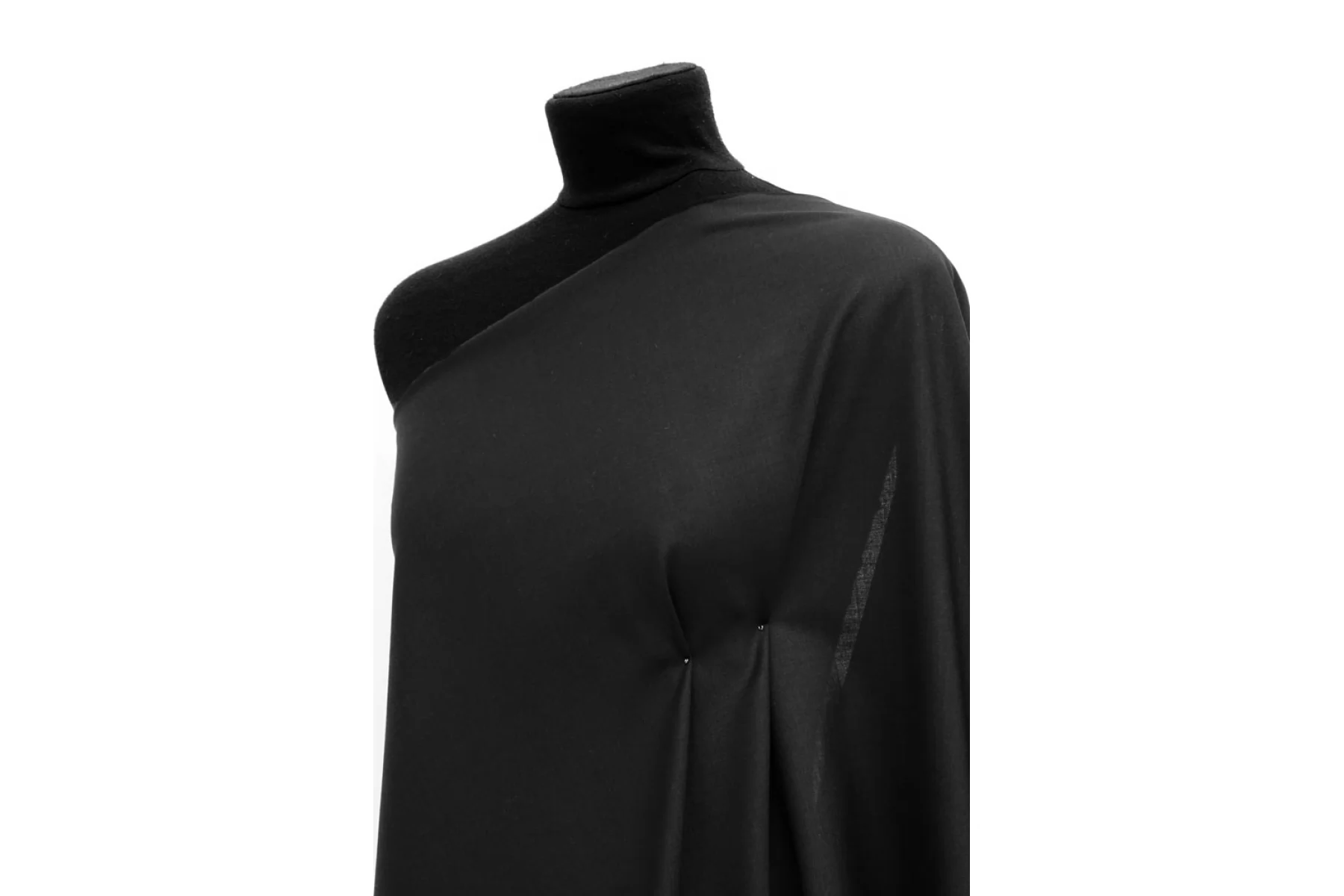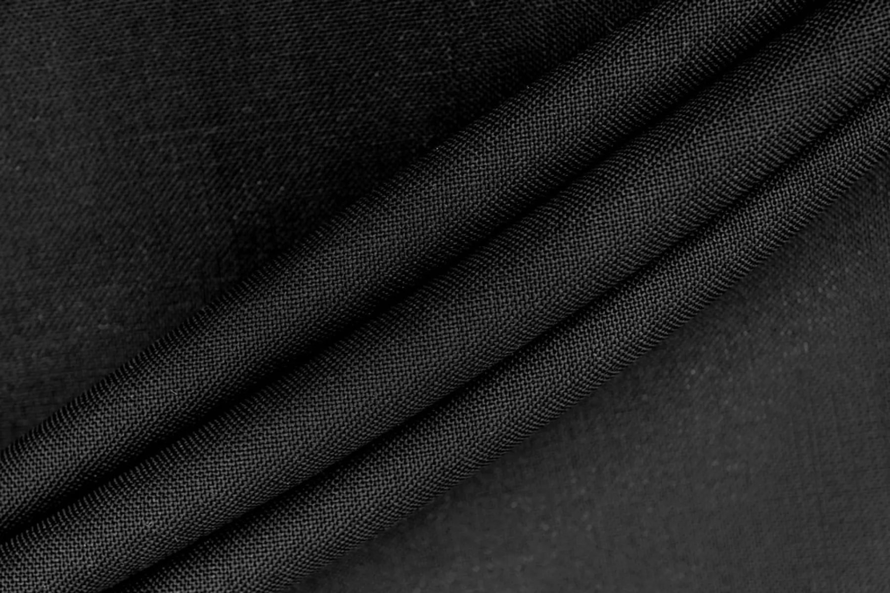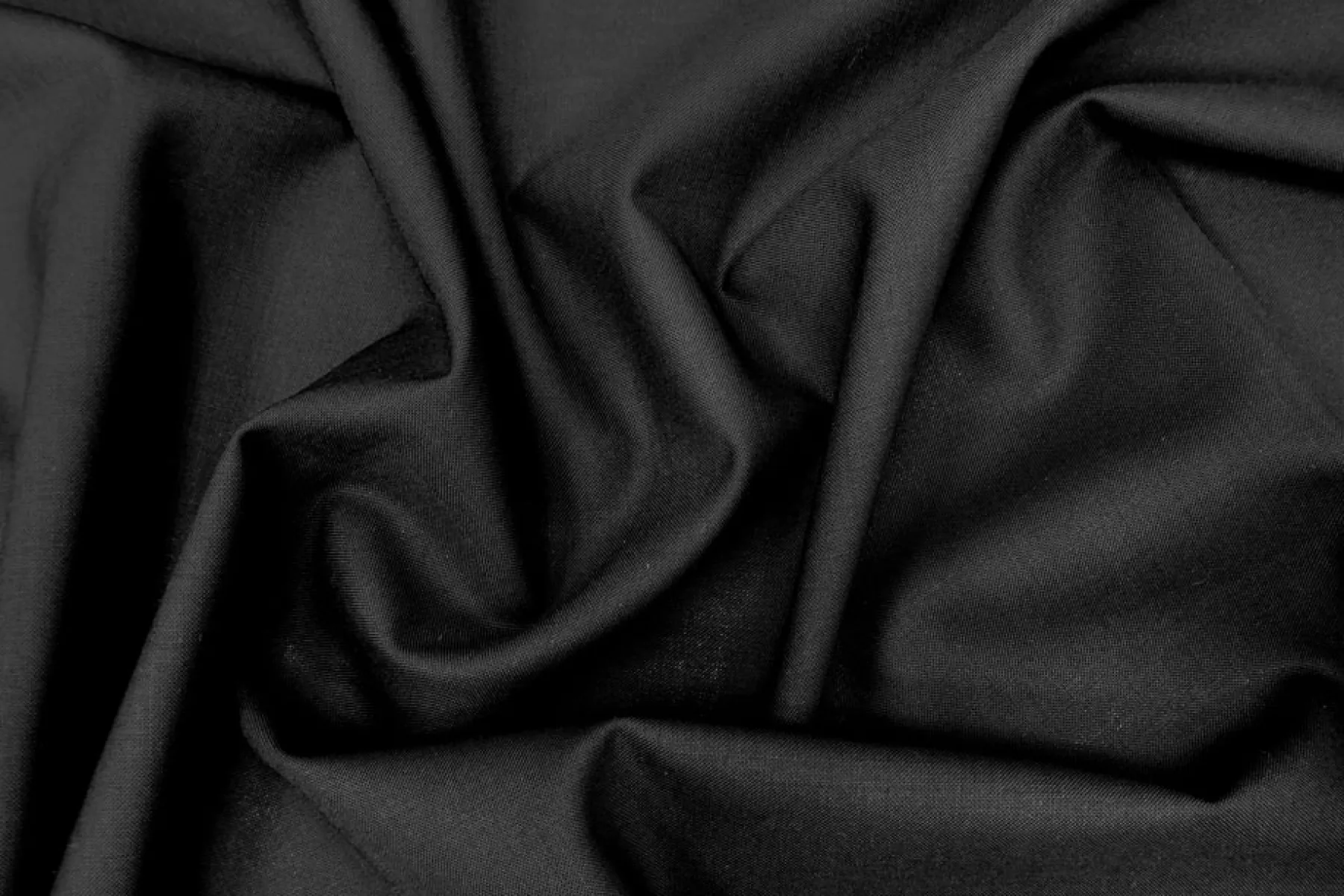 Шикарная костюмно-плательная шерсть в классическом черном цвете. Ткань тонкая, просвечивает силуэт. Пластичная, гладкая, слегка суховатая наощупь, не просвечивает, немного колется. Не тянется. Форму не держит. Красива в складках. Подойдет для пошива костюмов, юбок, платьев, брюк. Уход деликатный.