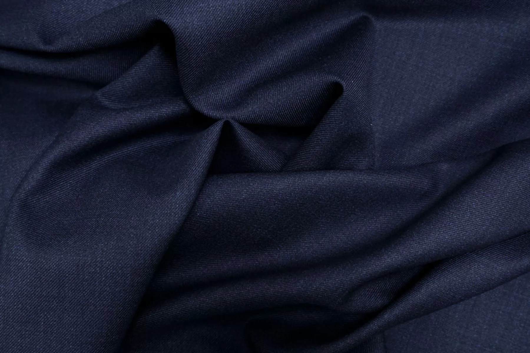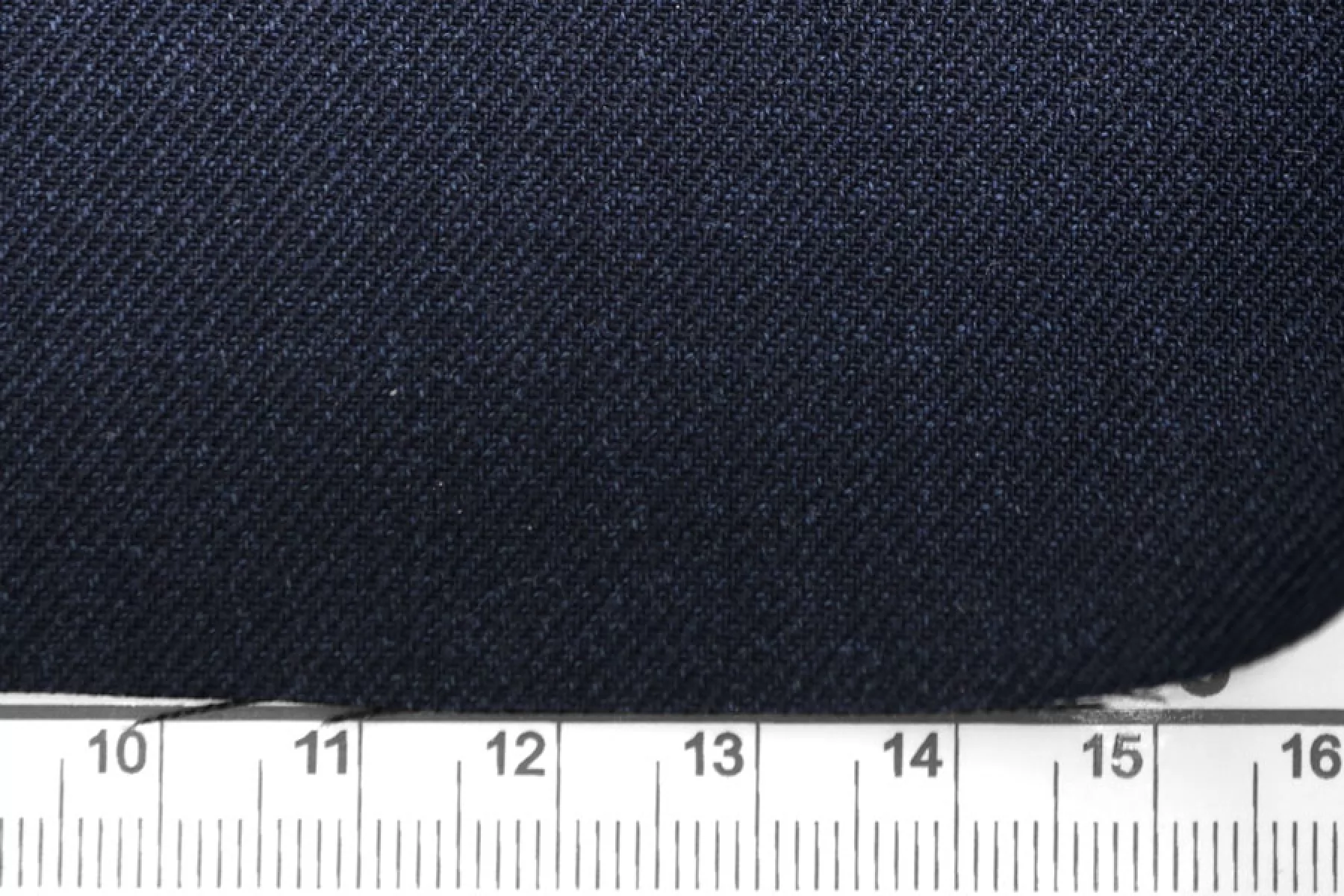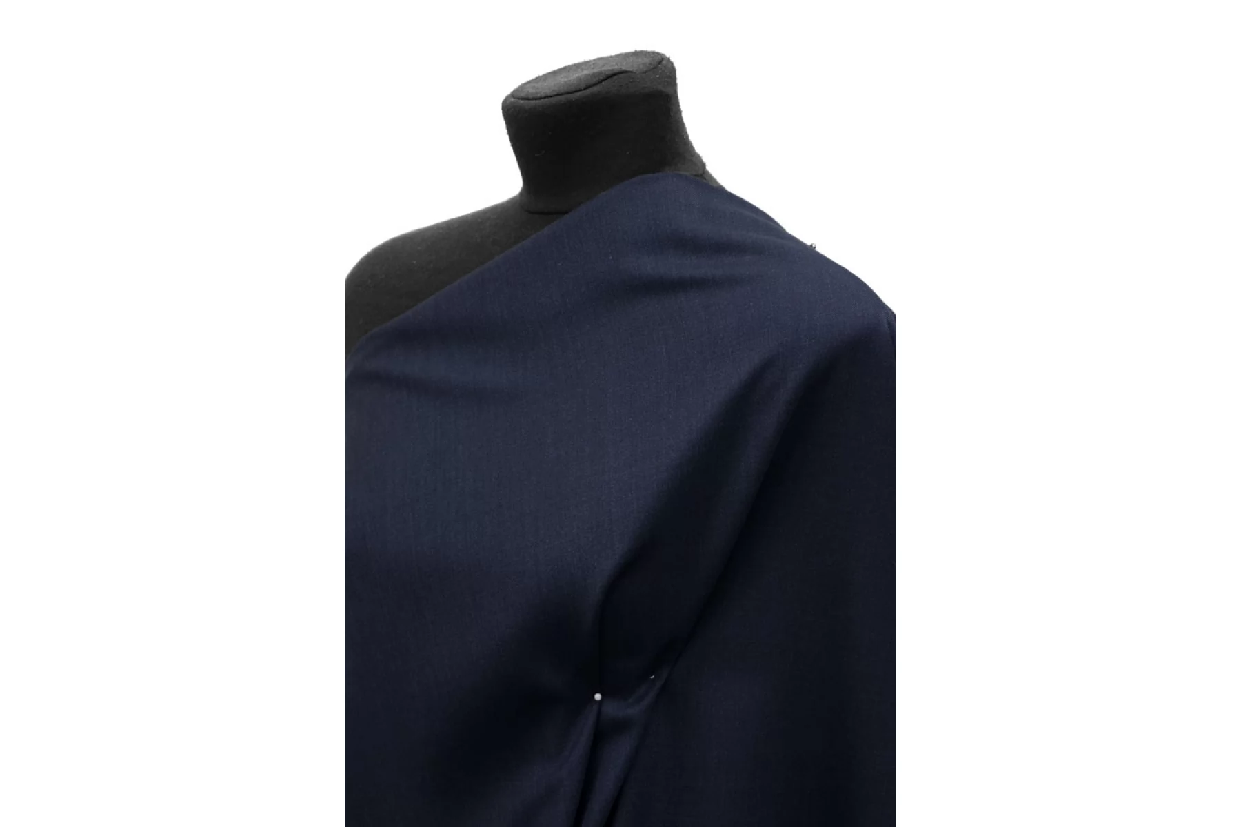Костюмно-плательная вирджинская шерсть от бренда Loro Piana, диагонального плетения, в тёмно-синем цвете. Тактильно мягкая, гладкая и пластичная. Обладает приятным лёгким лоском. Слегка суховата но без колкости. Не мнется. Не просвечивает. Хорошо драпируется, форму держит. Вариант на костюмы, платья, теплые рубашки и не только. Уход за материалом деликатный.