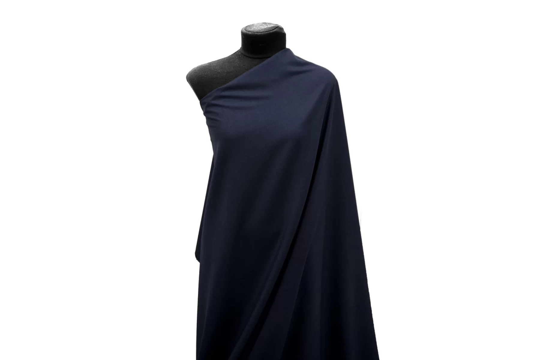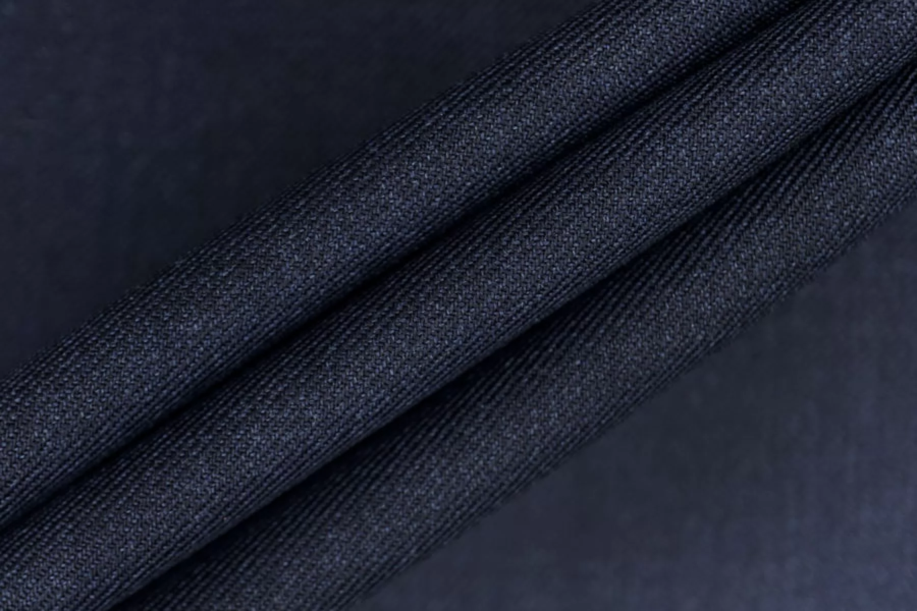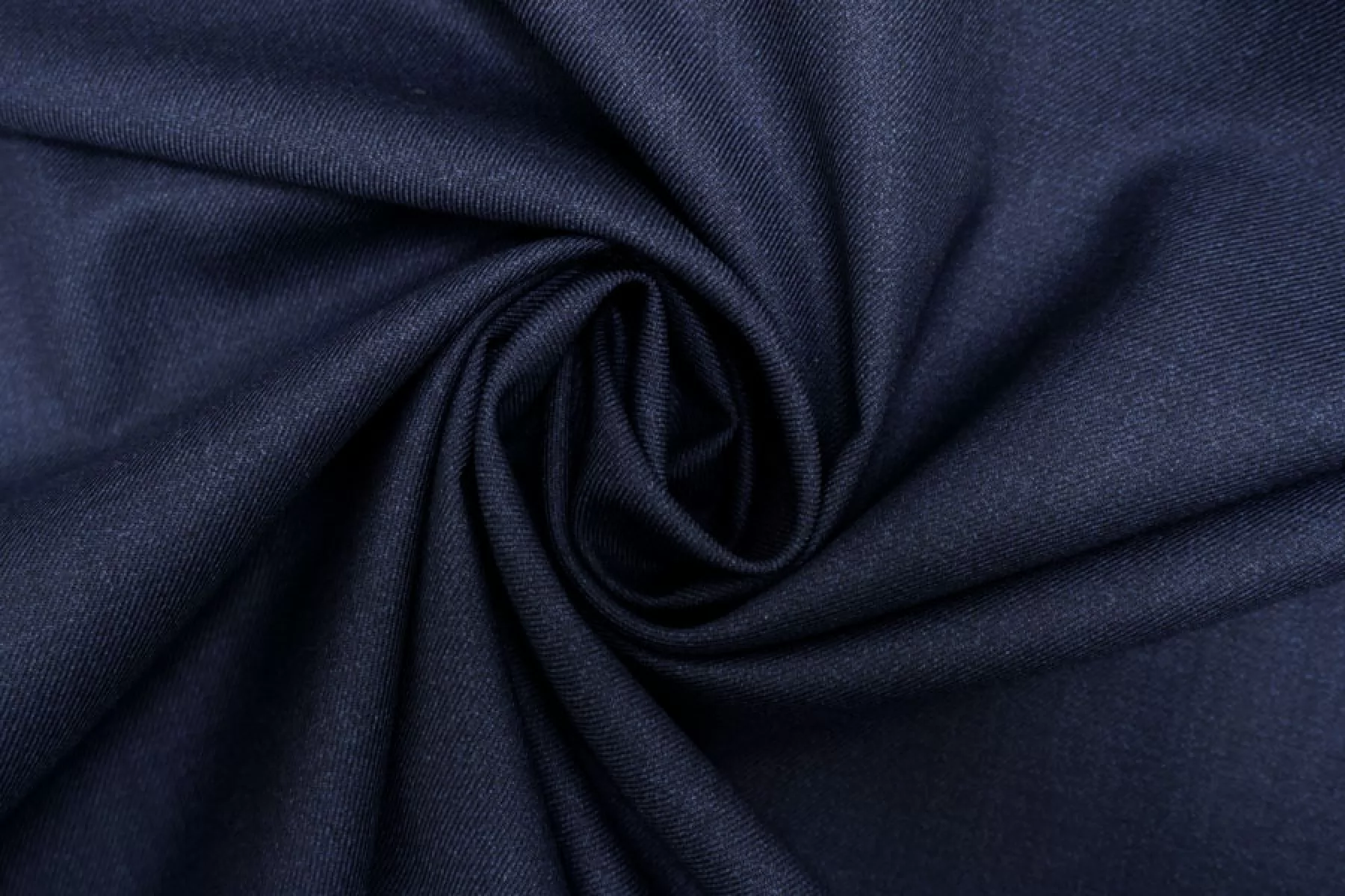Костюмно-плательная вирджинская шерсть от бренда Loro Piana, диагонального плетения, в тёмно-синем цвете. Тактильно мягкая, гладкая и пластичная. Обладает приятным лёгким лоском. Слегка суховата но без колкости. Не мнется. Не просвечивает. Хорошо драпируется, форму держит. Вариант на костюмы, платья, теплые рубашки и не только. Уход за материалом деликатный.