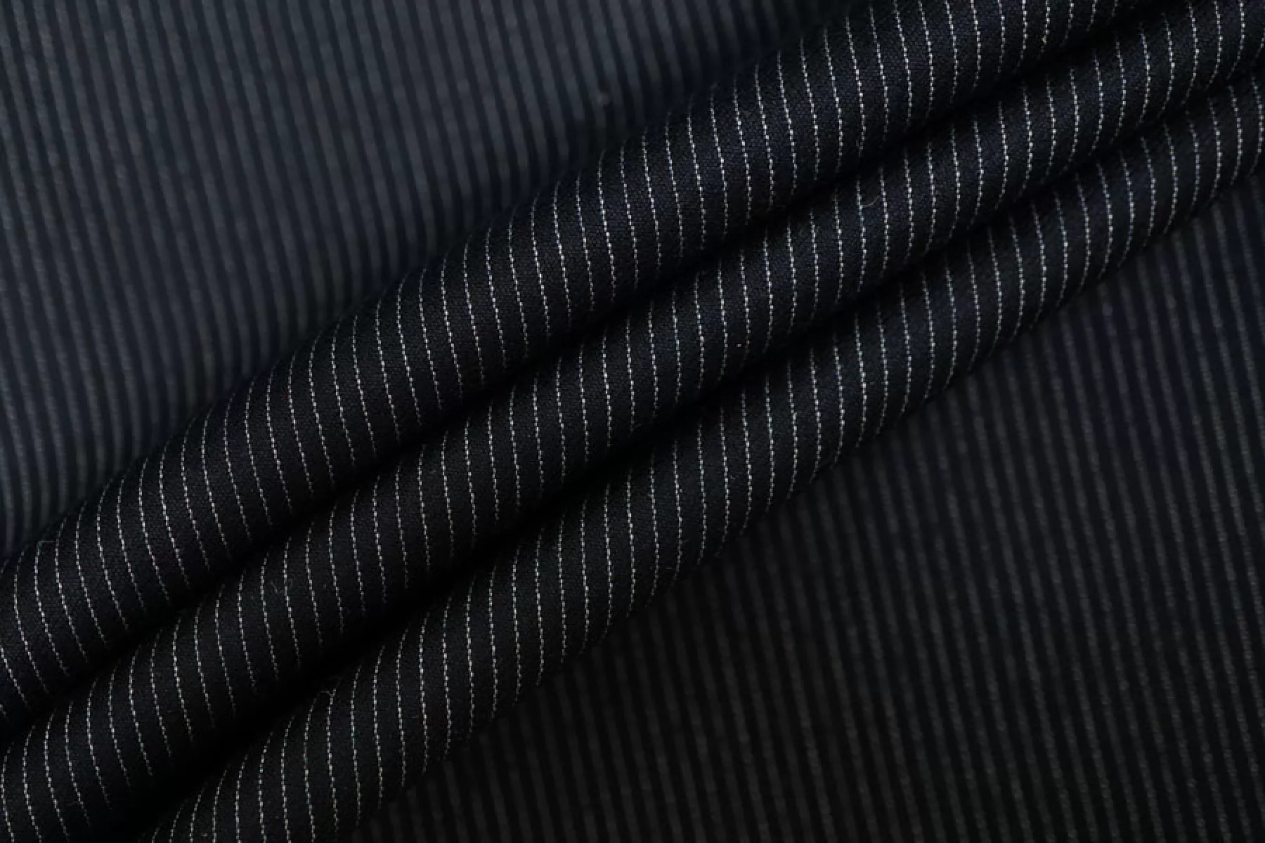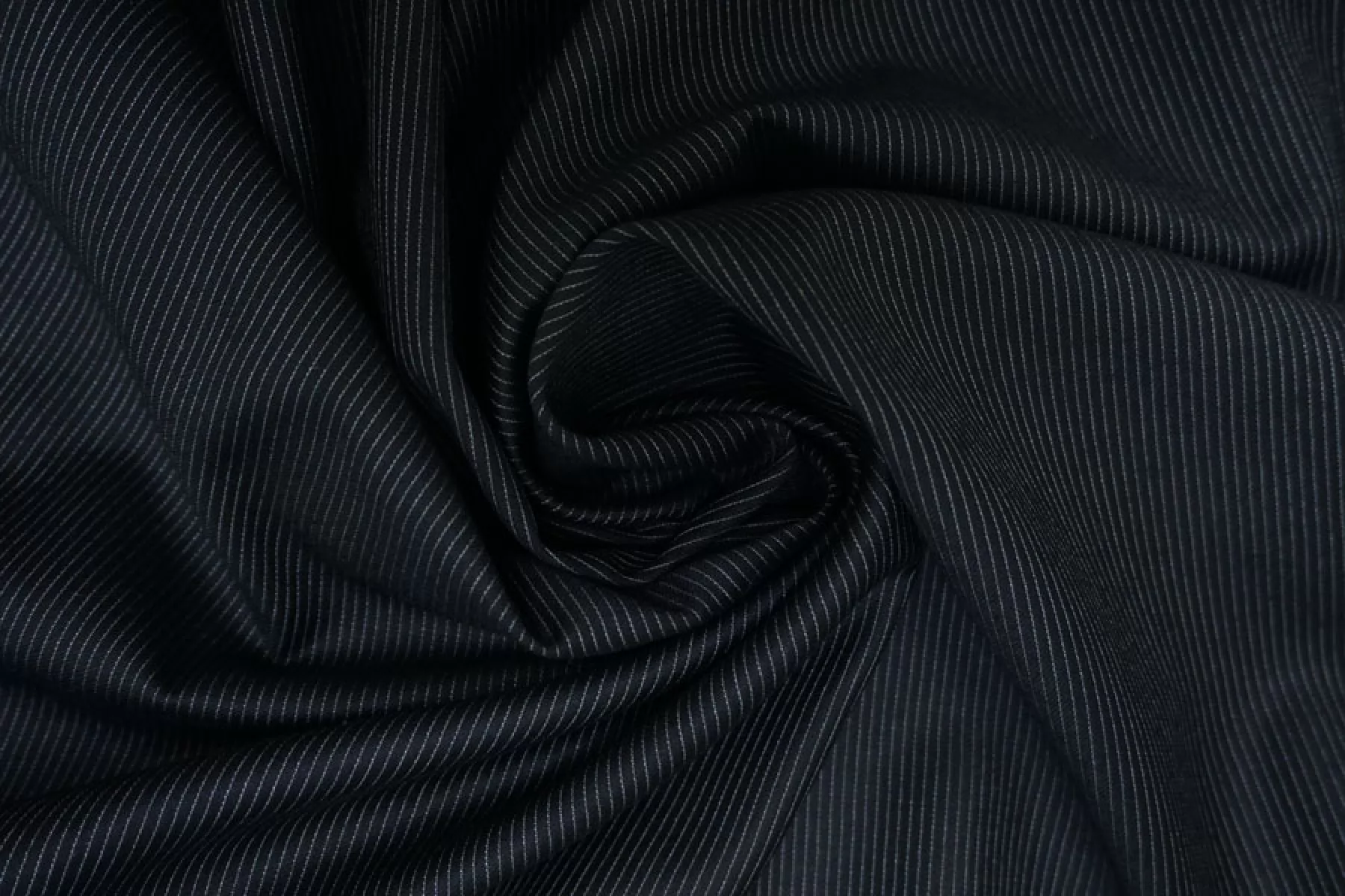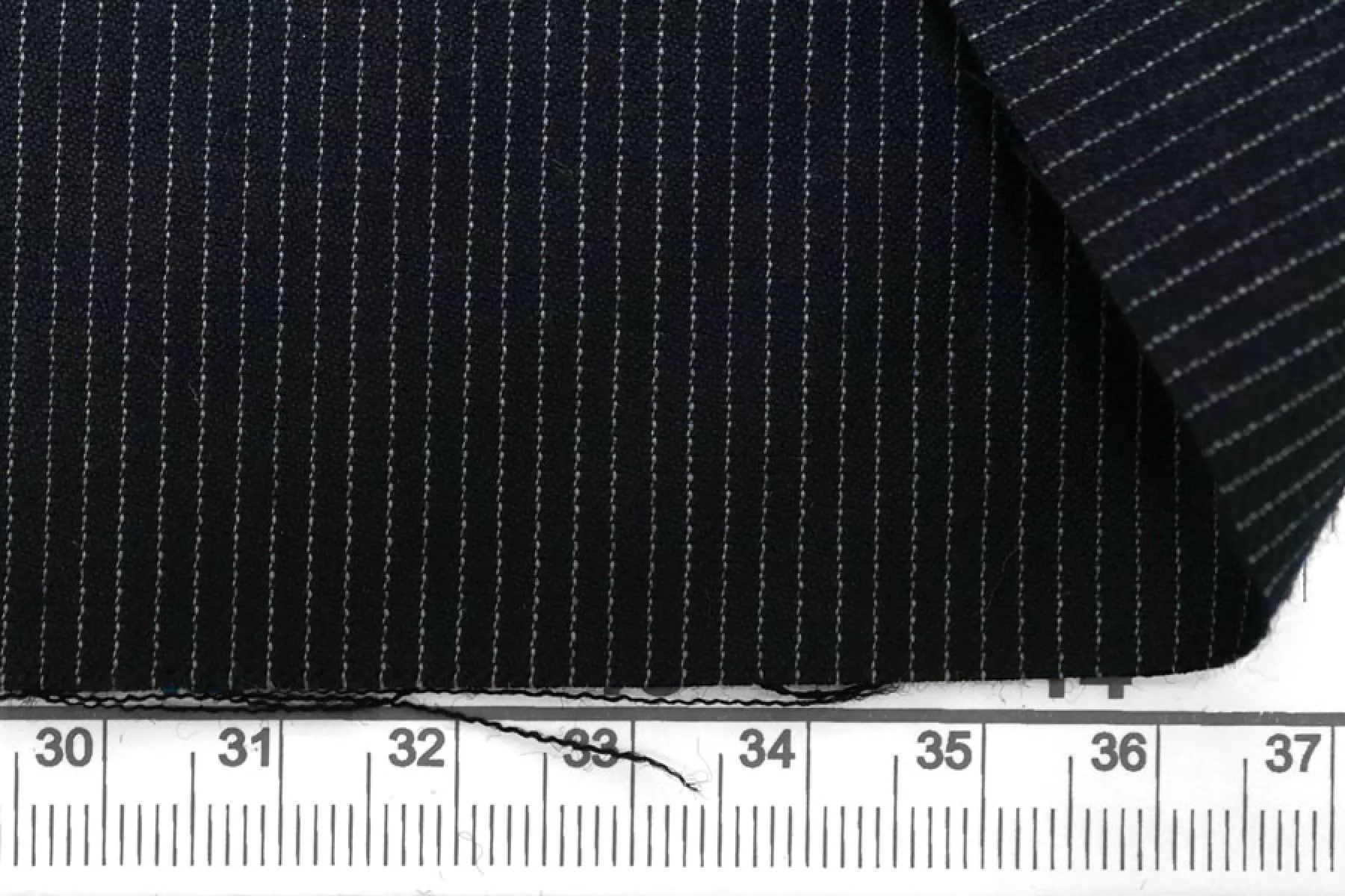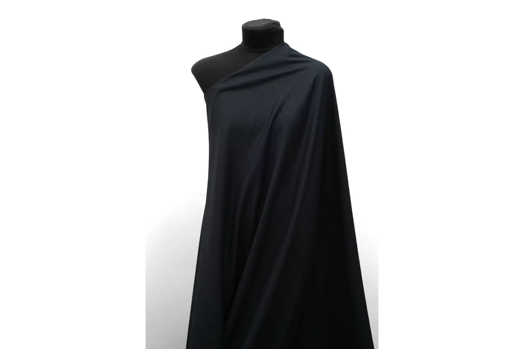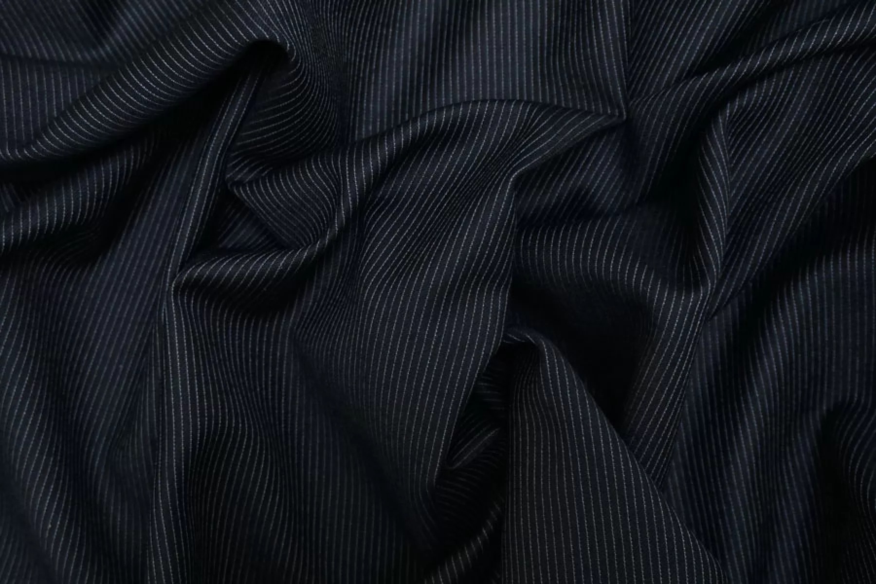 Шикарная итальянская костюмно-плательная шерсть с добавкой шёлка в очень тёмном, почти чёрном синем цвете (можно описать как чёрный с синим подтоном), в тонкую полоску светло-серого цвета (вдоль кромки). Тактильно очень приятная, мягкая, гладкая. Плетение диагональное, обладает легчайшим лоском. Не просвечивает, не тянется. Пластичная но при это держит форму. Подойдет для пошива костюмов мягкой формы, брюк, зимних сарафанов, юбок.