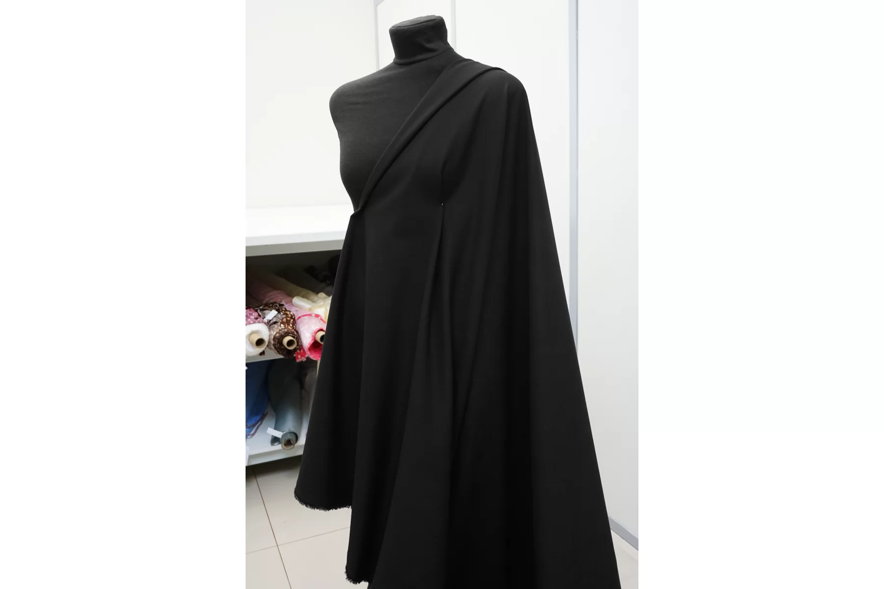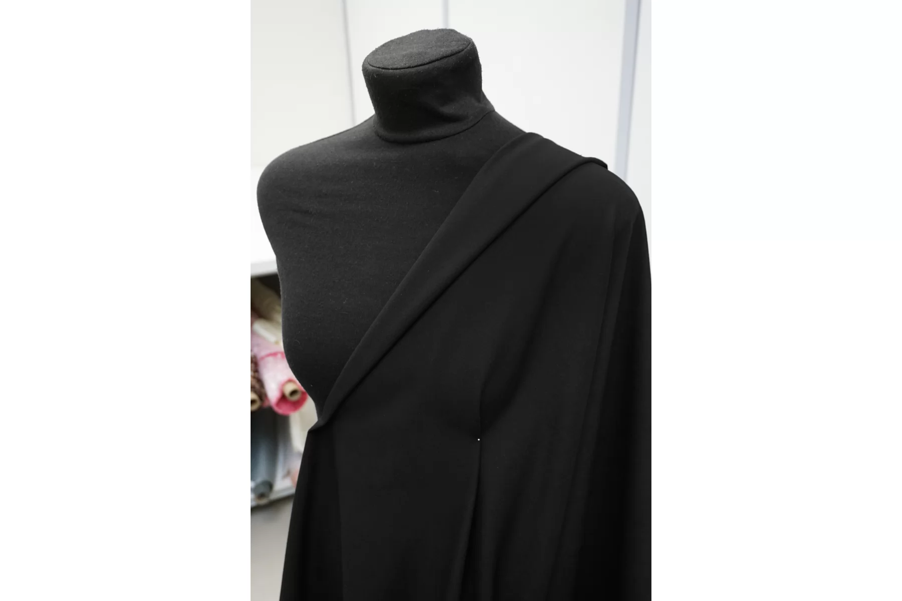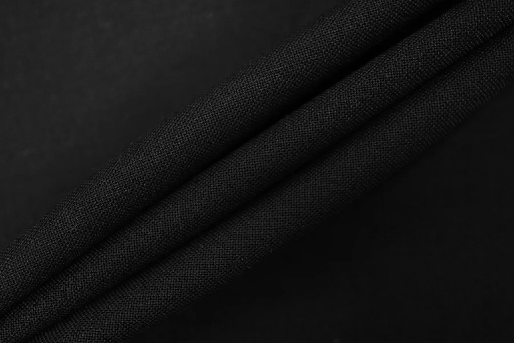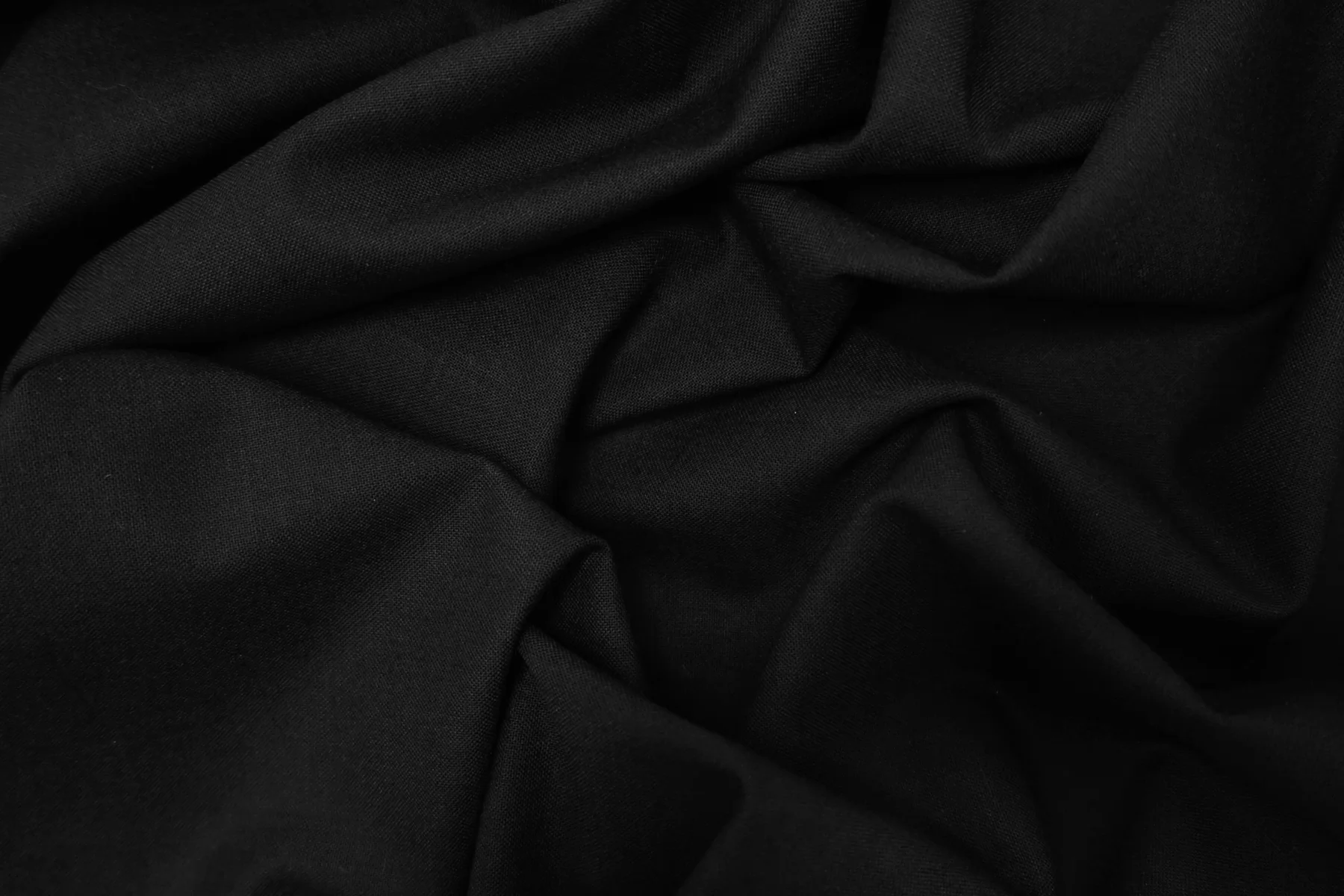 Костюмно-плательная шерсть, в чёрном цвете. Тонкая но плотная. Минимально покалывает. Слегка просвечивает силуэт в один слой, в изделии заметно не будет. Тянется, не мнется. Умеренно держит форму но при этом пластичная. Шьем зимние рубашки, платья, юбки, брюки. Уход деликатный.