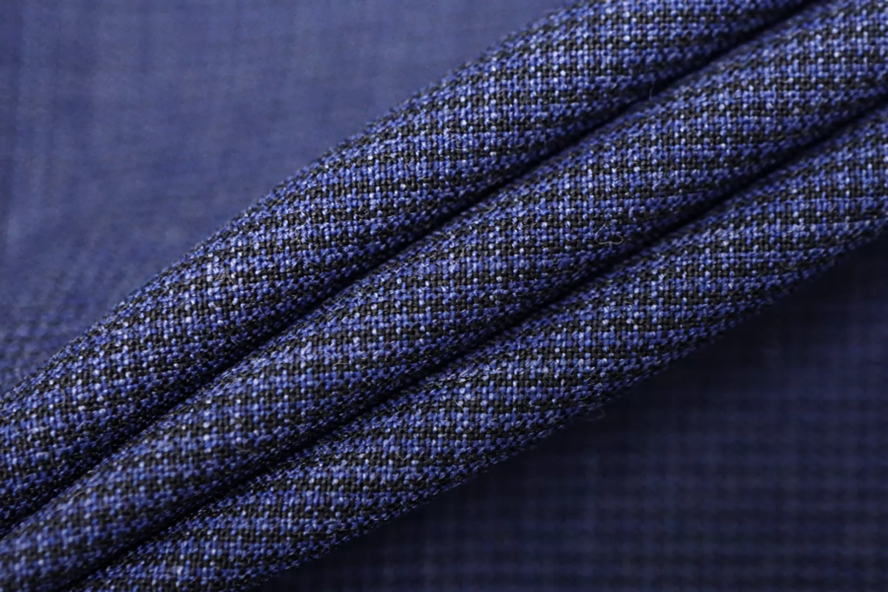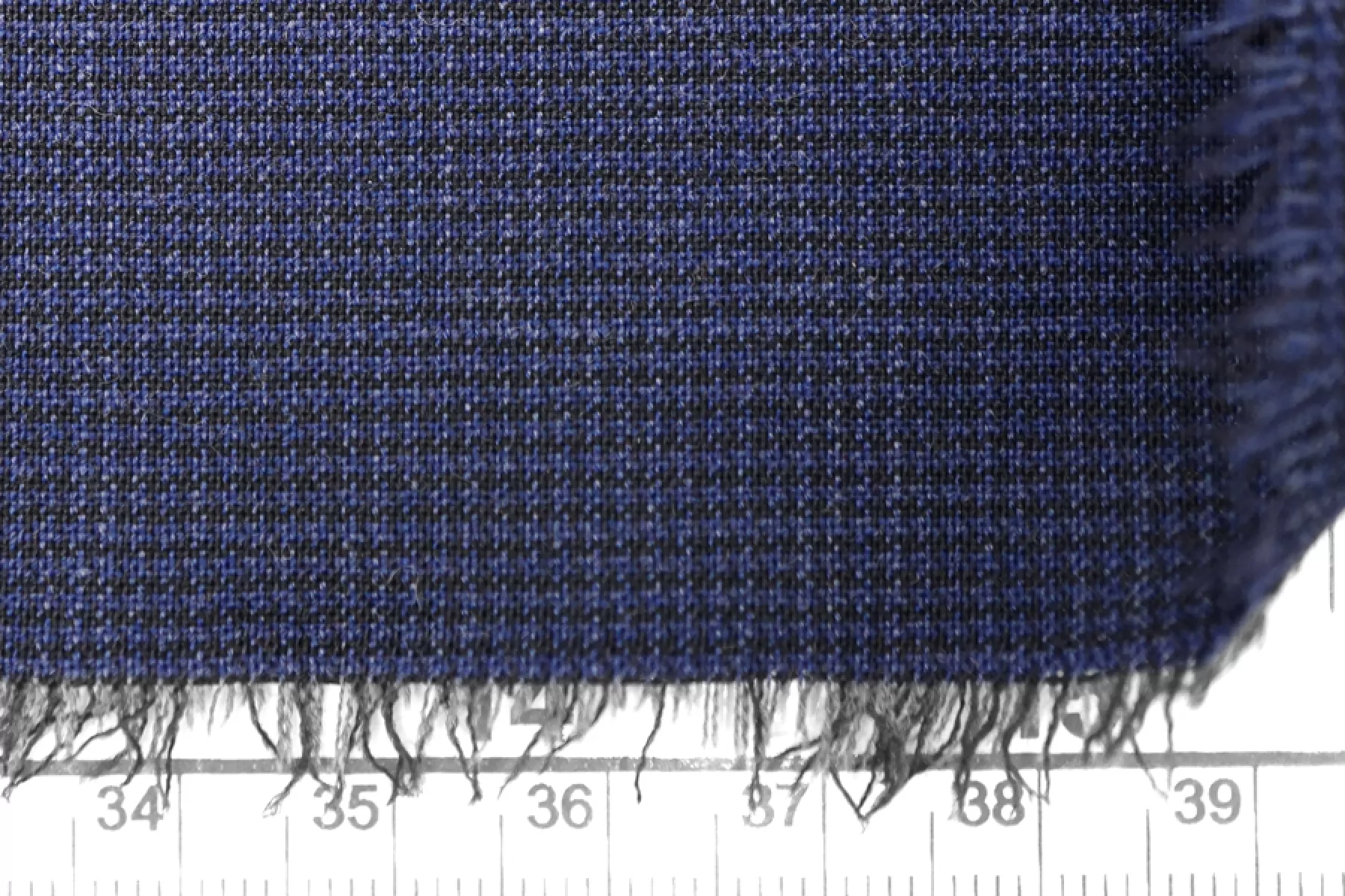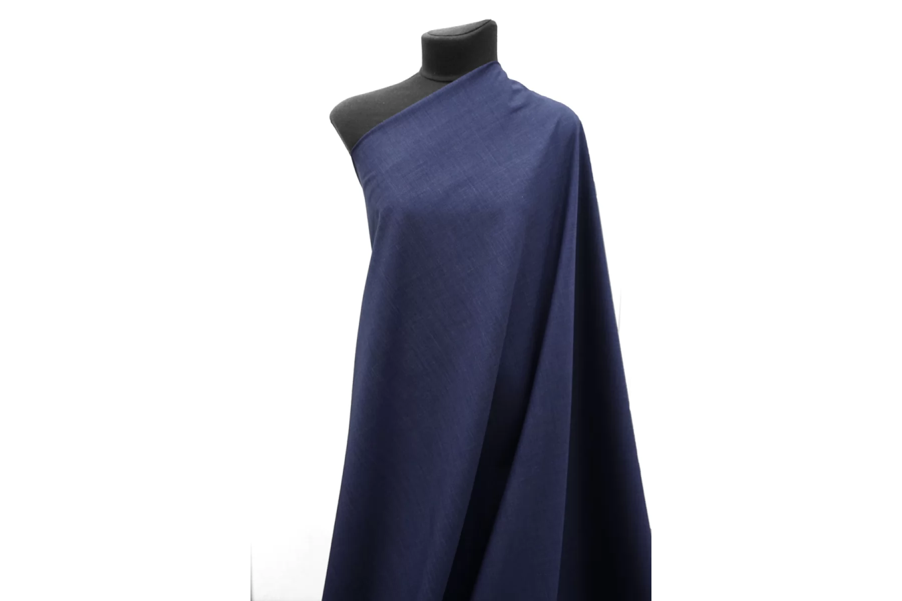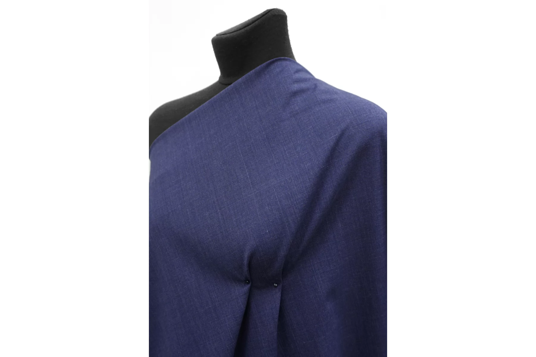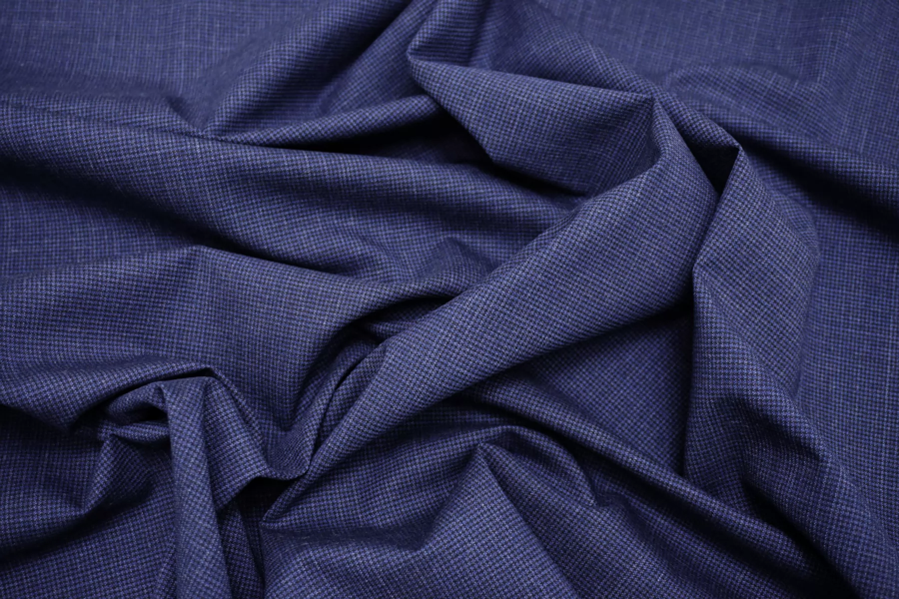Прекрасная костюмно-плательная вирджинская шерсть с мелким узором-пепитой из нитей тёмно-синего и синего цвета. Тактильно гладкая, плотная, но достаточно тонкая. Чувствуется, что шерсть, при этом не колется. Хорошо тянется, немного просвечивает. Хорошо драпируется и умеренно держит форму. Не мнется. Отличный вариант на тонкие костюмы, жакеты мягкой формы, платья, брюки и не только. Уход за материалом деликатный.