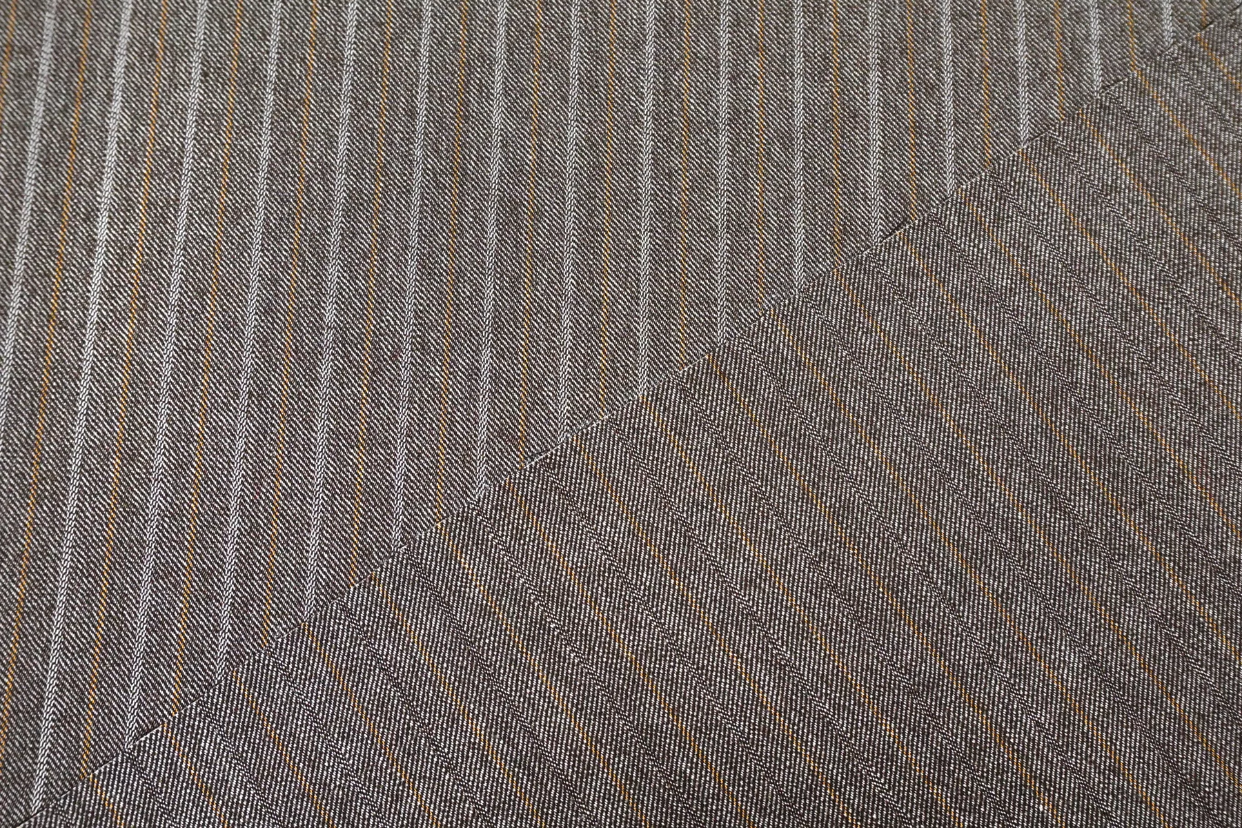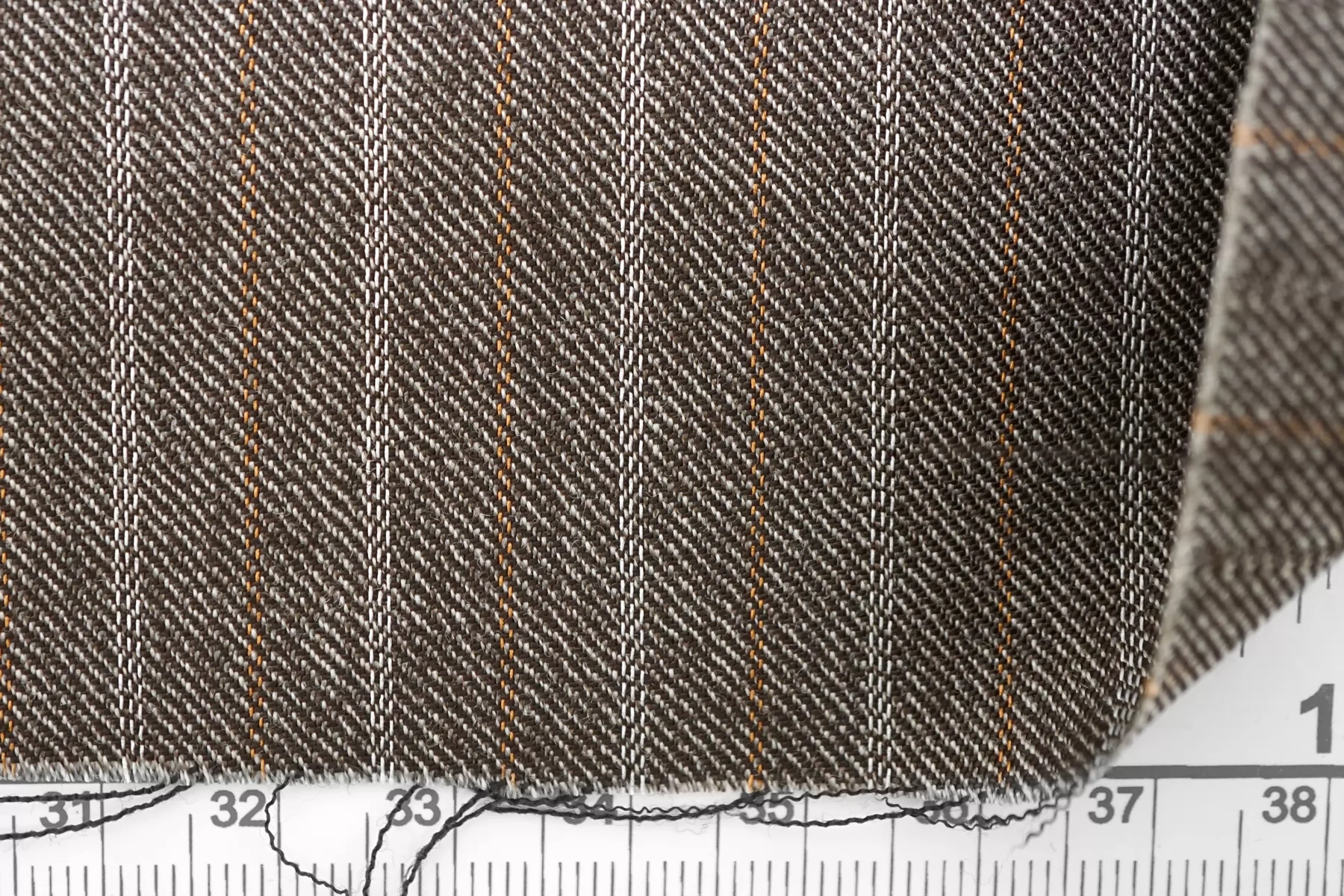Очень интересная костюмно-плательная шерсть шикарного качества virgin. Плетение диагональное, с узором в полоску из переплетения белых, коричневых и немного оранжевых нитей. Тактильно мягкая, гладкая, пластичная, тонкая, но плотная. Не колется. Обладает очень легким приятным лоском. Не просвечивает, но если смотреть прямо на просвет, совсем слегка заметен силуэт. Тянется благодаря плетению. Хорошо драпируется и немного держит форму. Прекрасный вариант на костюмные варианты, платья, юбки. Уход деликатный.