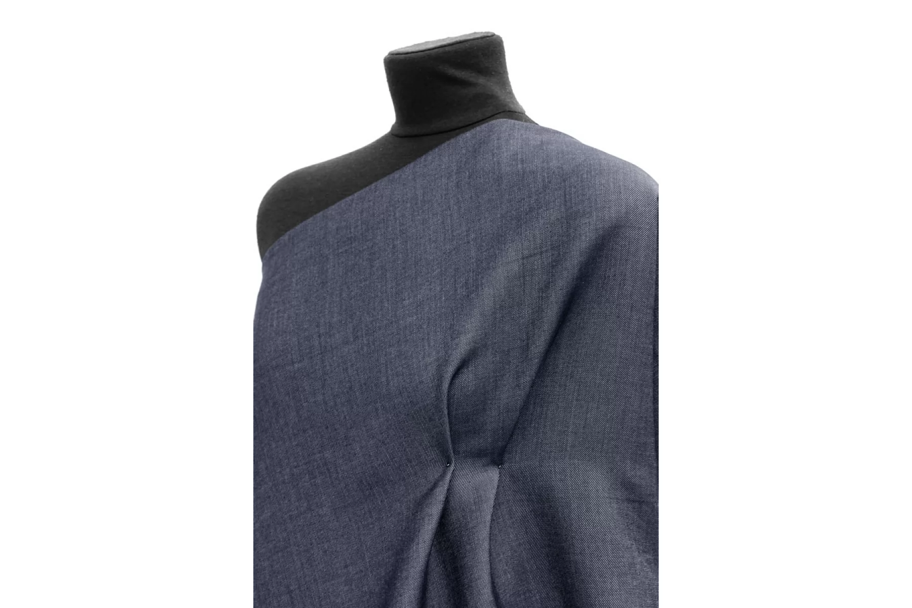 Двуслойный костюмно-плательный хлопок с вискозой под джинсу диагонального плетения. Лицевая сторона синяя, изнаночная сторона белая (тоже может использоваться как рабочая). Слои не разделяются. Ткань мягкая, плотная, скользящая. Не просвечивает, немного держит форму, с красивой мягкой пластикой. Красиво драпируется. Подойдет для пошива жакета, костюма, демисезонной юбки, брюк, платья.