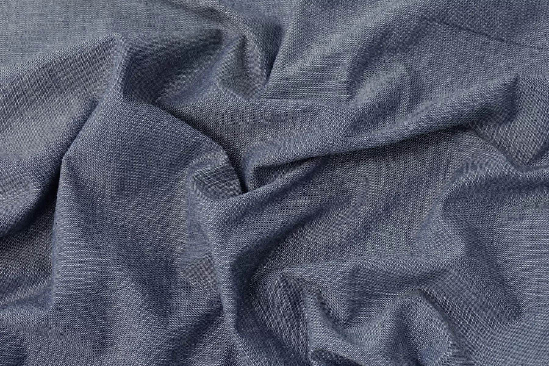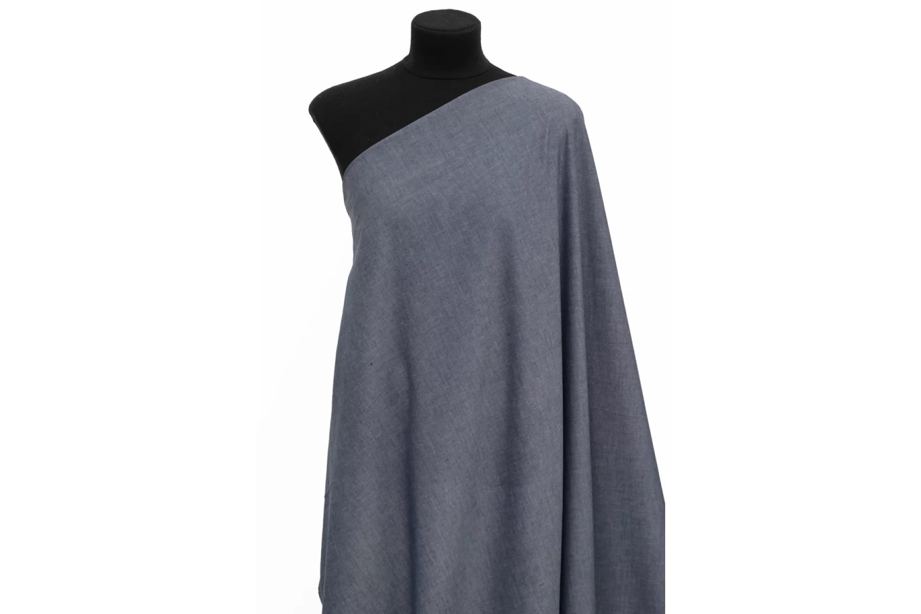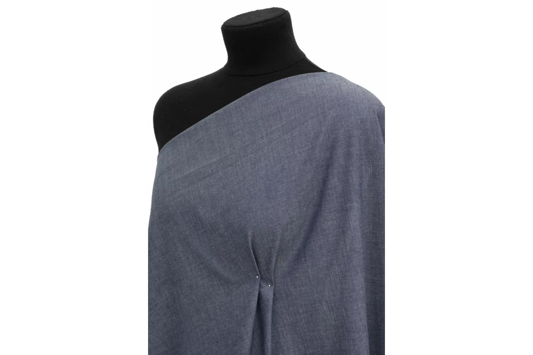 Итальянский костюмно-плательный хлопок, состоящий из переплетения синей и белой нитей, цвет под джинсу. Без эластана, не тянется. Слегка просвечивает силуэт. Держит форму но при этом пластичный. Мягкий, тактильно очень приятный. Подойдет для пошива костюма мягкой формы, платья, брюк, юбок, рубашек, комбинезонов