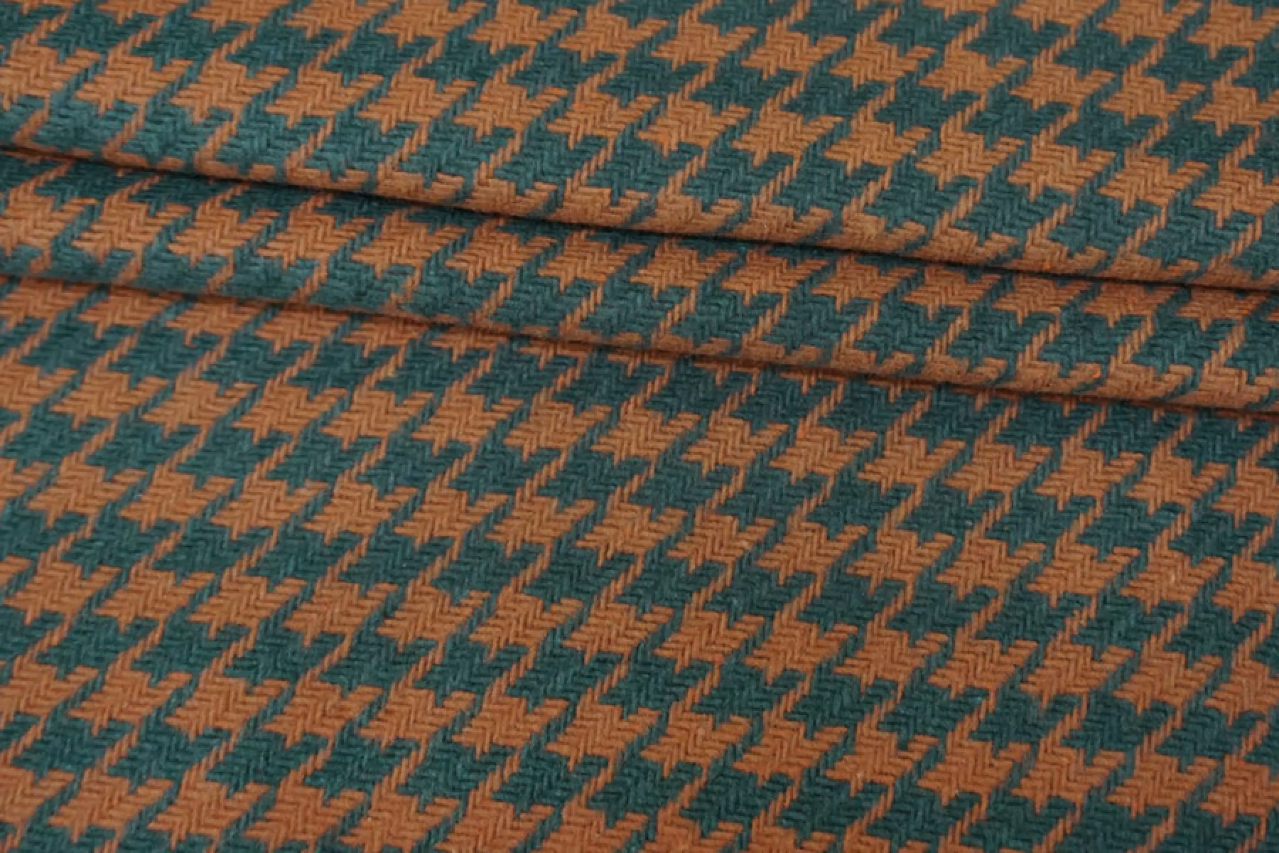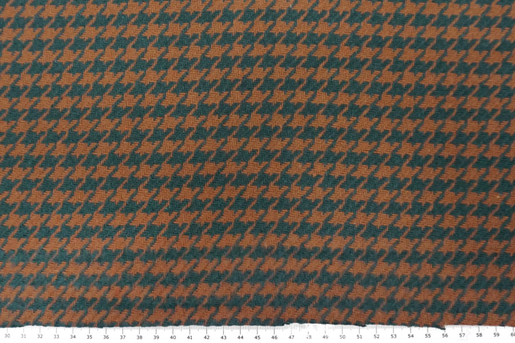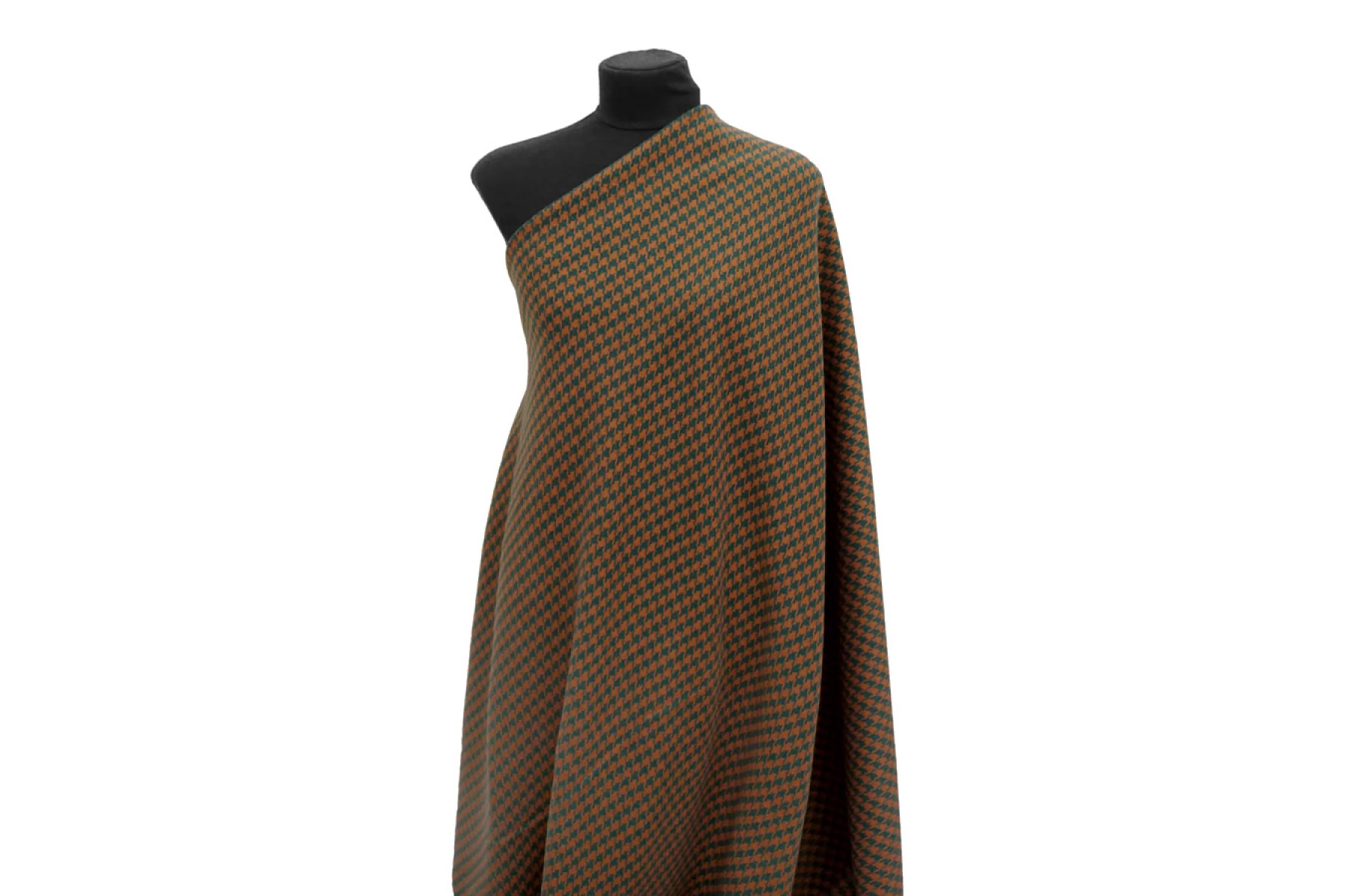 Классный хлопковый твид костюмной плотности в гусиную лапку зеленого и коричневого цвета. Мягкий наощупь. С легким ворсом. Слегка чувствуется фактурность плетения наощупь. Не тянется. Пластичный. Не мнется. Не просвечивает. Форму немного держит. Подойдет на костюмы, юбки, мягкие жакеты. Уход деликатный.