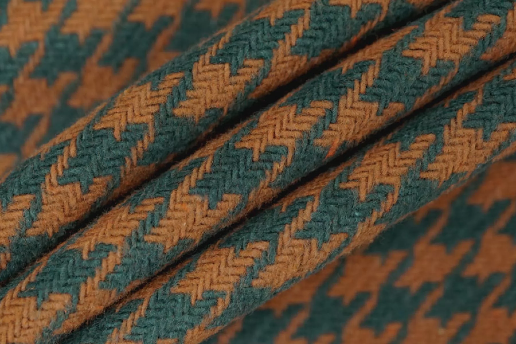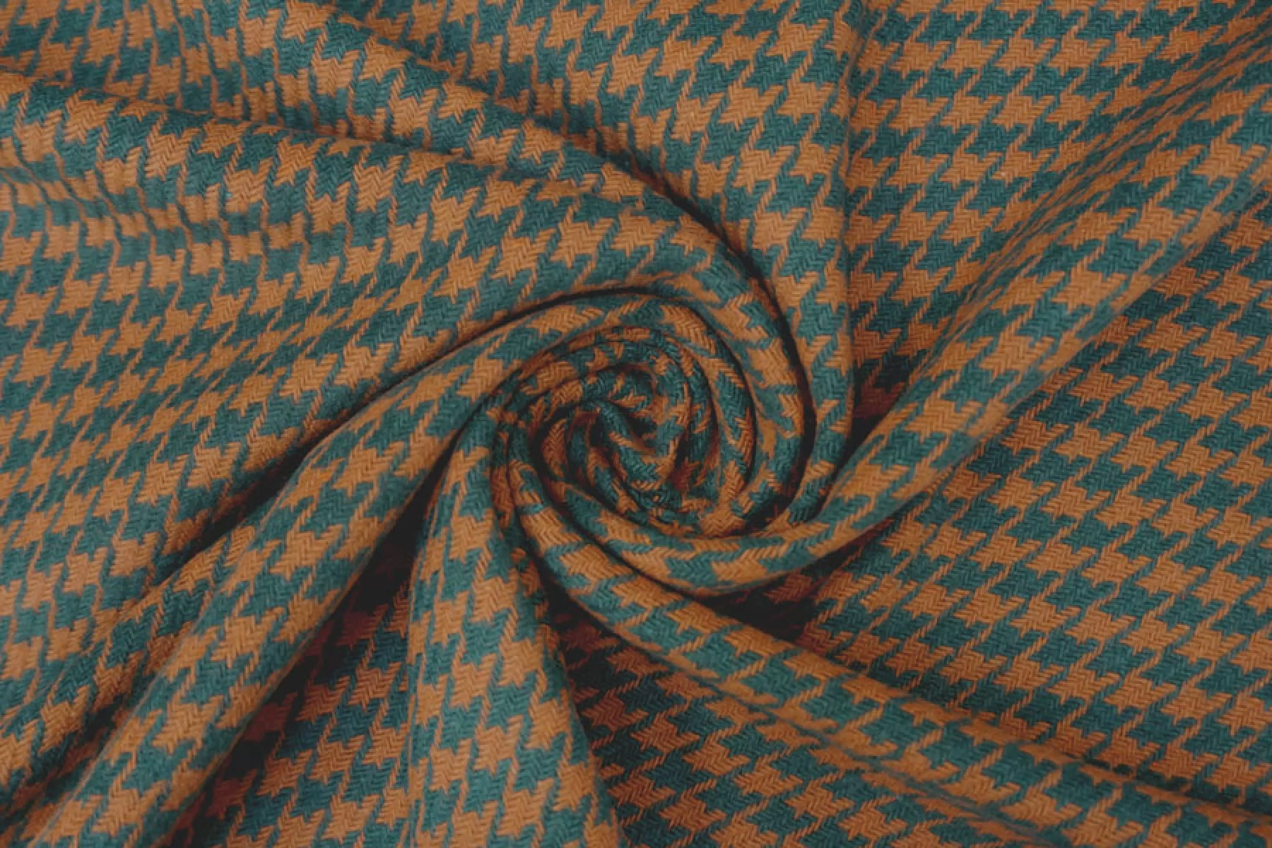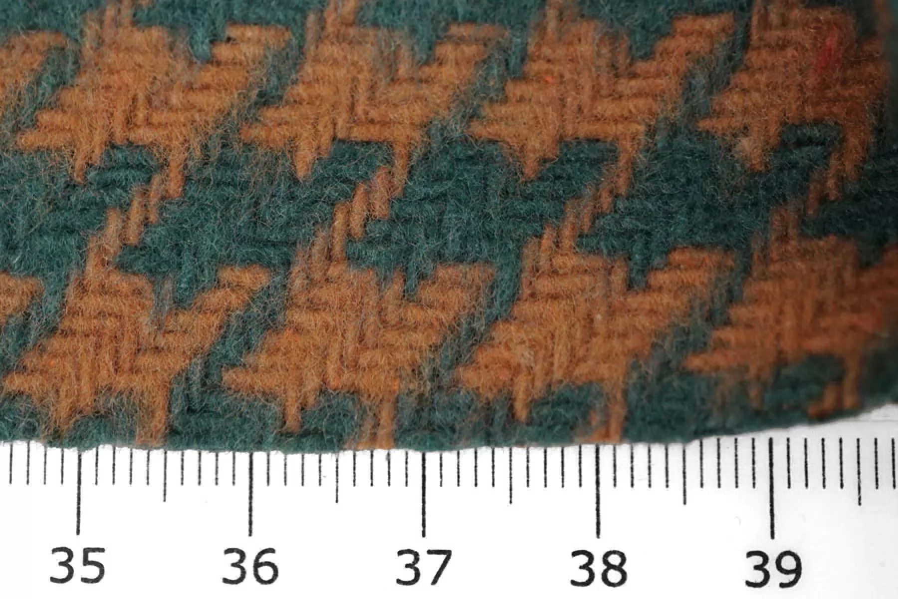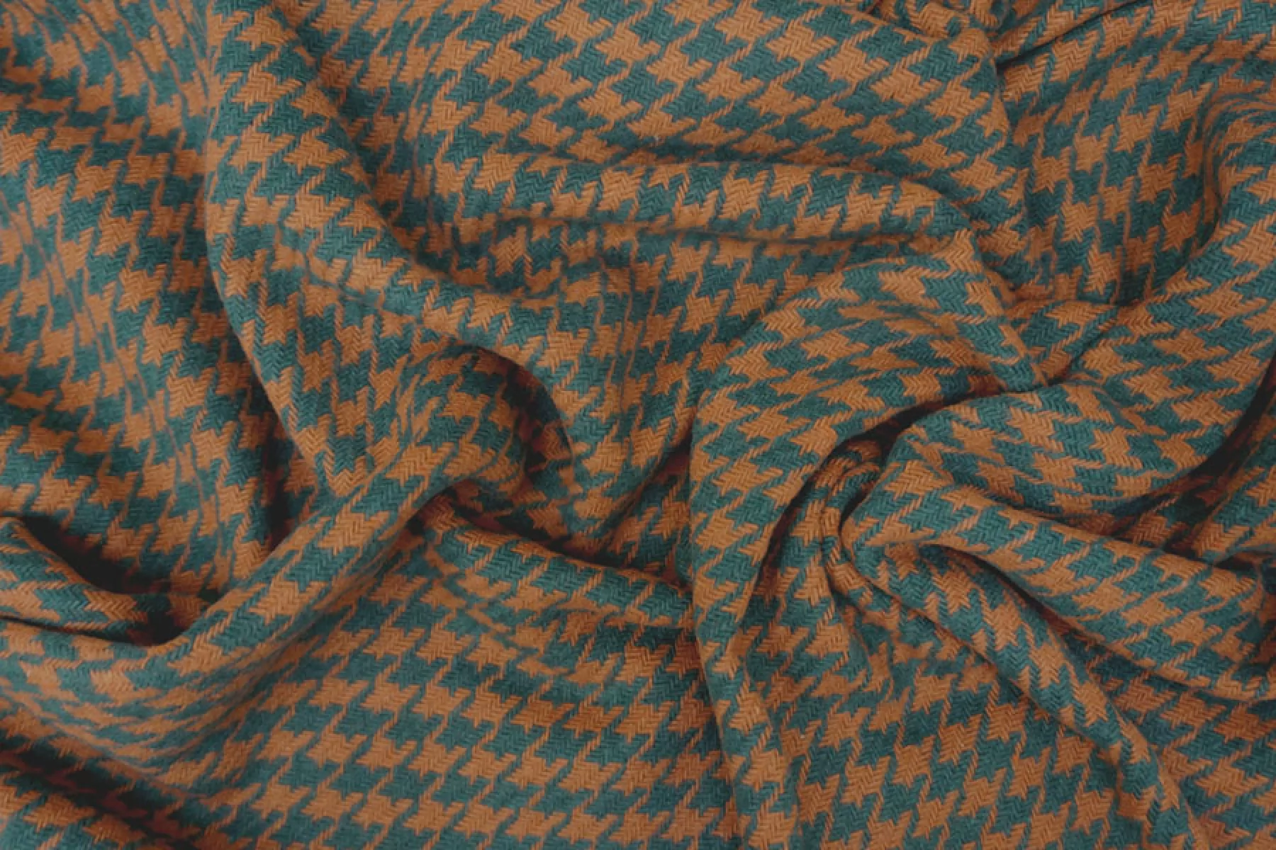 Классный хлопковый твид костюмной плотности в гусиную лапку зеленого и коричневого цвета. Мягкий наощупь. С легким ворсом. Слегка чувствуется фактурность плетения наощупь. Не тянется. Пластичный. Не мнется. Не просвечивает. Форму немного держит. Подойдет на костюмы, юбки, мягкие жакеты. Уход деликатный.