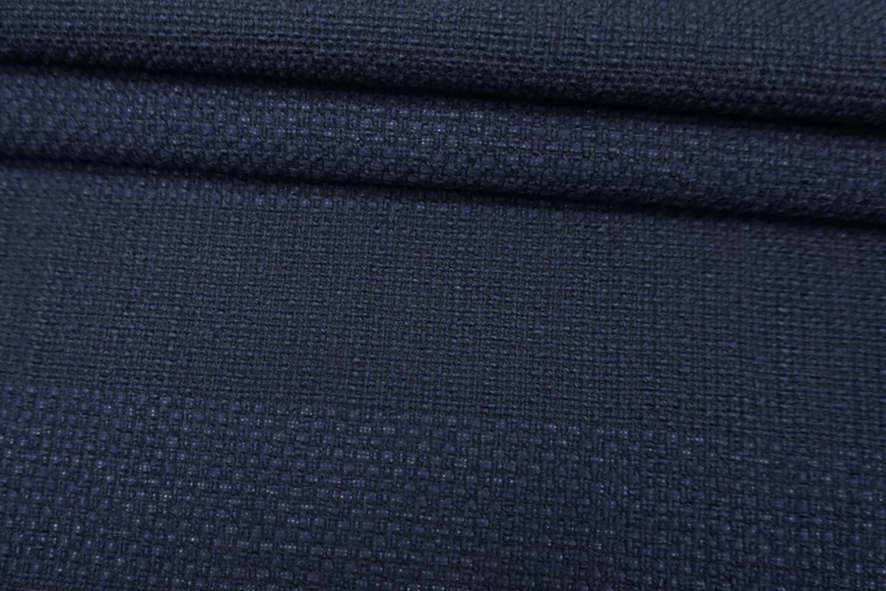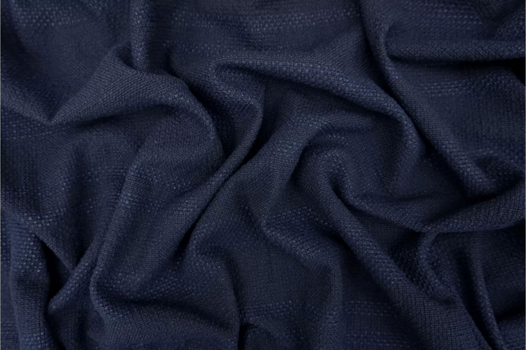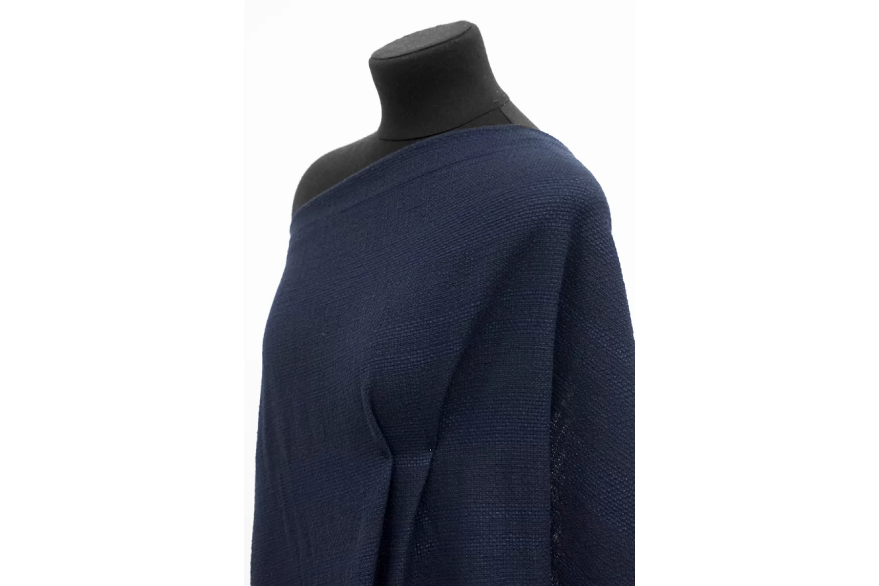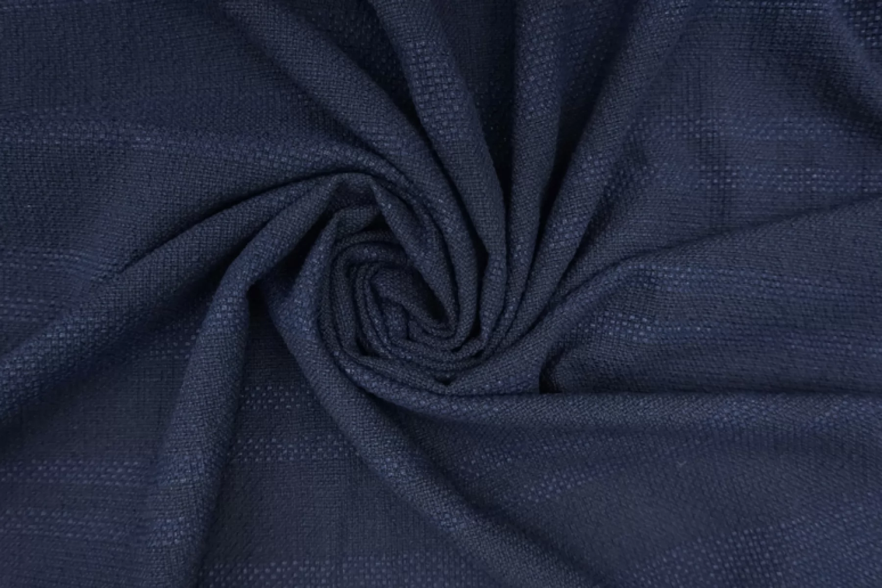 Костюмный хлопок-рогожка в синего цвета. Тактильно ощущается фактура плетения. Материал слегка тянется за счет плетения, пластичный. Отлично драпируется и неплохо держит форму. По всему полотну есть выработка нитью с легким лоском, которая образует линии по ширине материала разной толщины. Слегка просвечивает силуэт на просвет. Не мнется. Подойдет для пошива брюк, шорт, платья, юбки, жакета, кардигана и костюма.