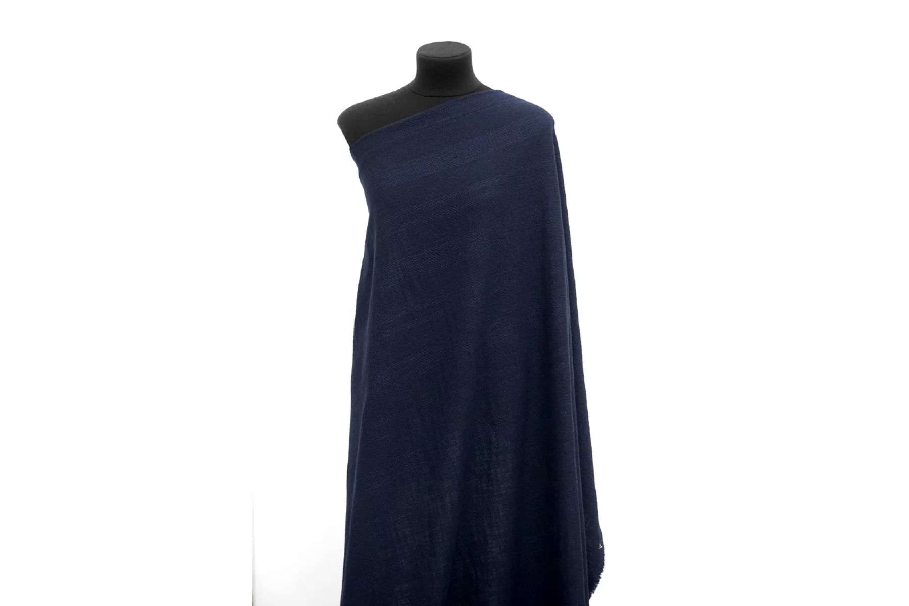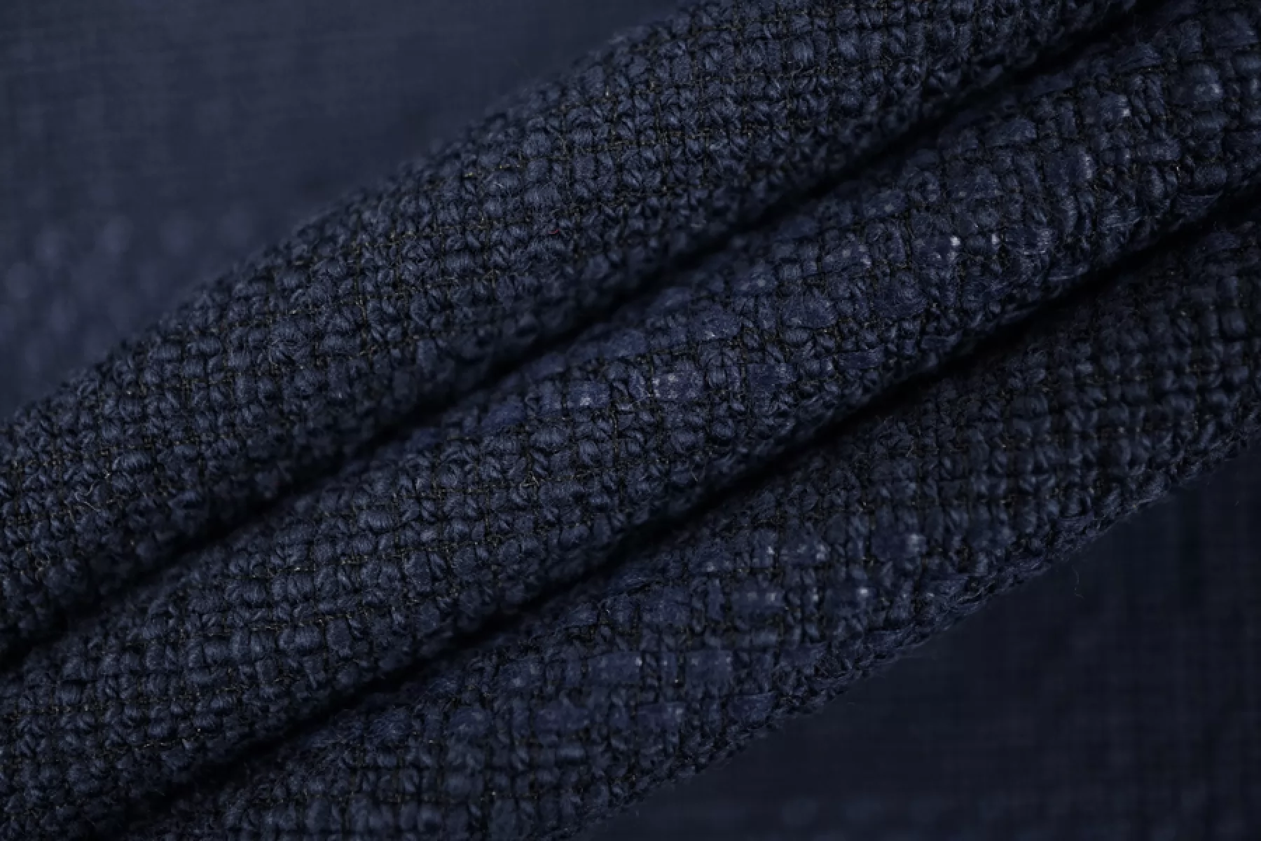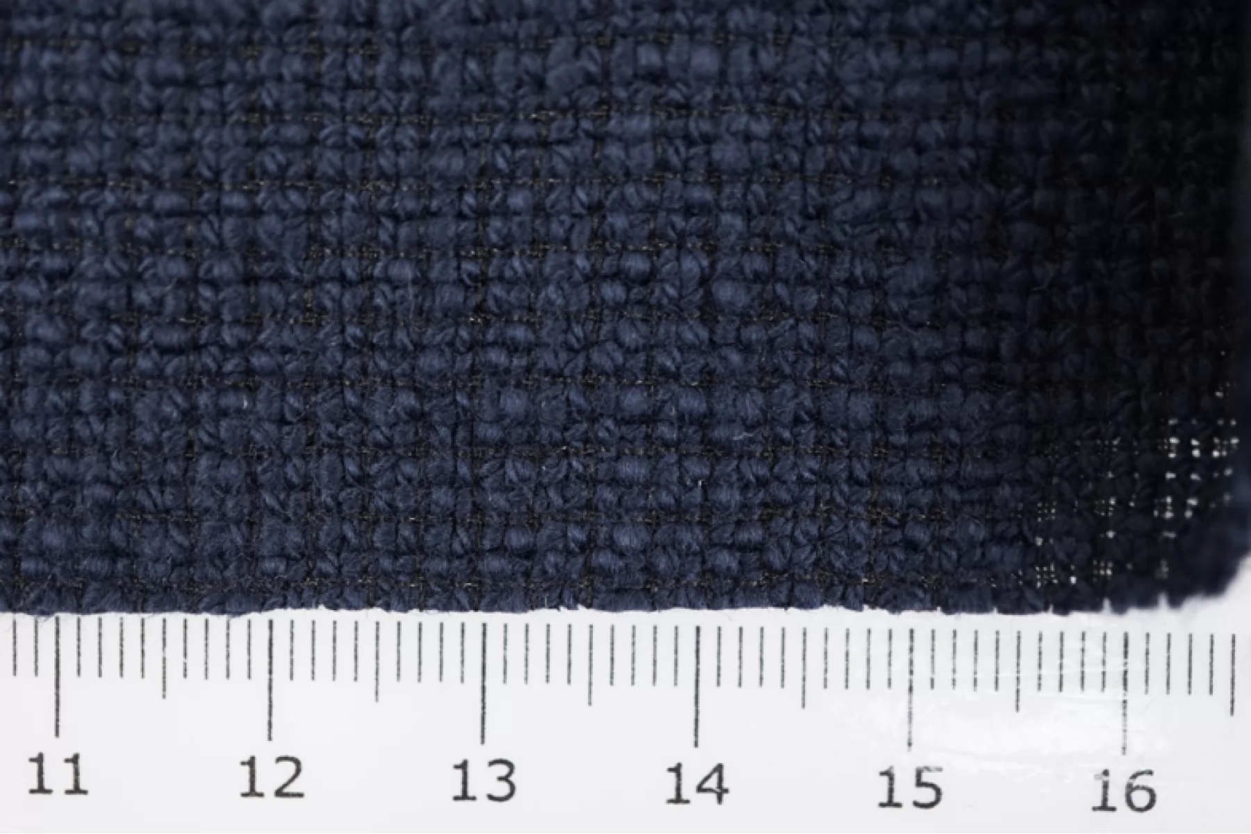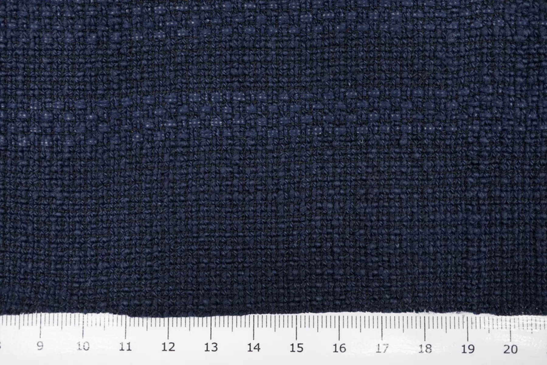 Костюмный хлопок-рогожка в синего цвета. Тактильно ощущается фактура плетения. Материал слегка тянется за счет плетения, пластичный. Отлично драпируется и неплохо держит форму. По всему полотну есть выработка нитью с легким лоском, которая образует линии по ширине материала разной толщины. Слегка просвечивает силуэт на просвет. Не мнется. Подойдет для пошива брюк, шорт, платья, юбки, жакета, кардигана и костюма.