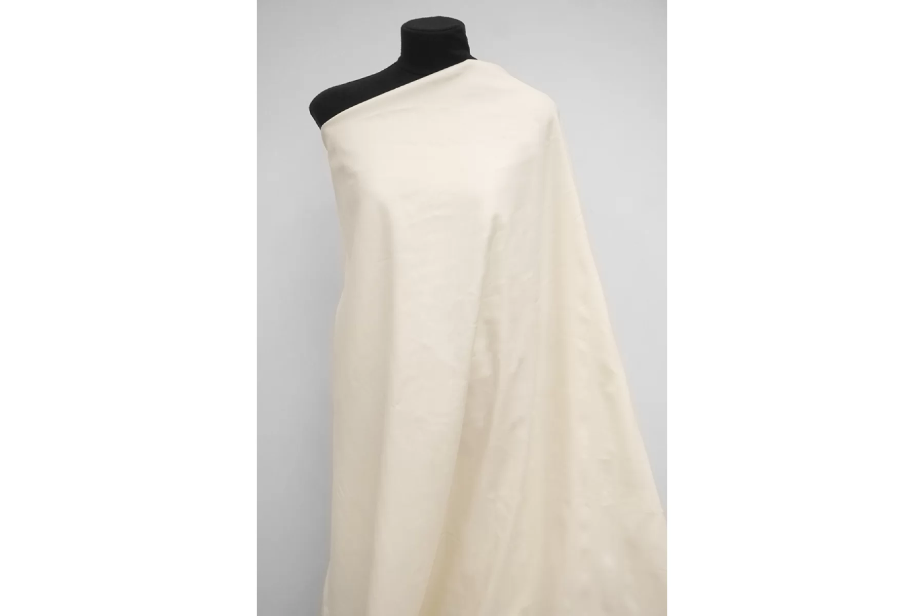 Костюмный хлопок со льном и вискозой диагонального плетения молочного оттенка. Тактильно плотный, мягкий и слегка шероховатый за счет плетения. Обладает легким и приятным лоском. Немного тянется. Слегка мнется. Не просвечивает и неплохо держит форму. Шьем костюмные варианты, жакеты, платья, юбки и свободные брюки.
