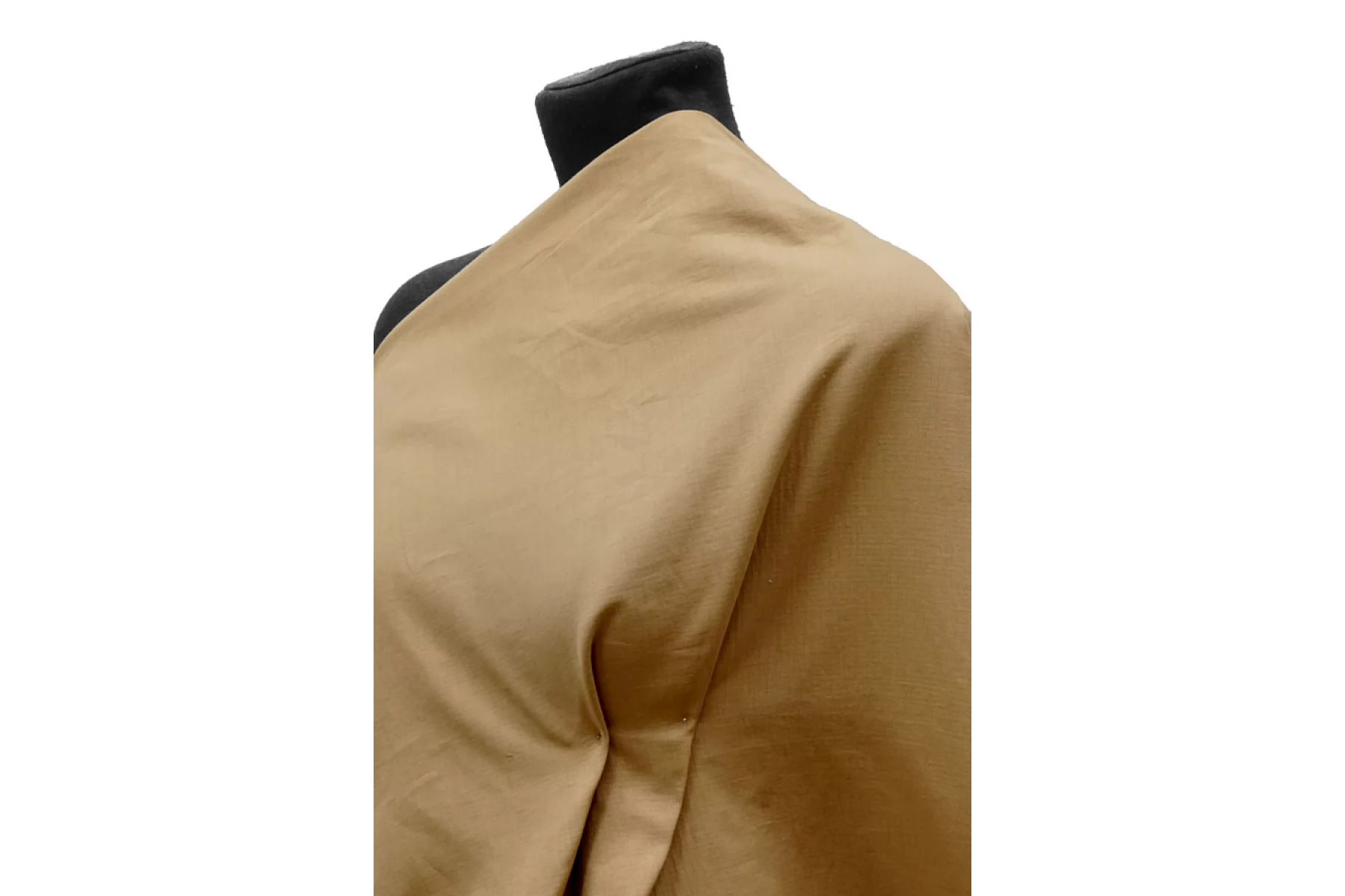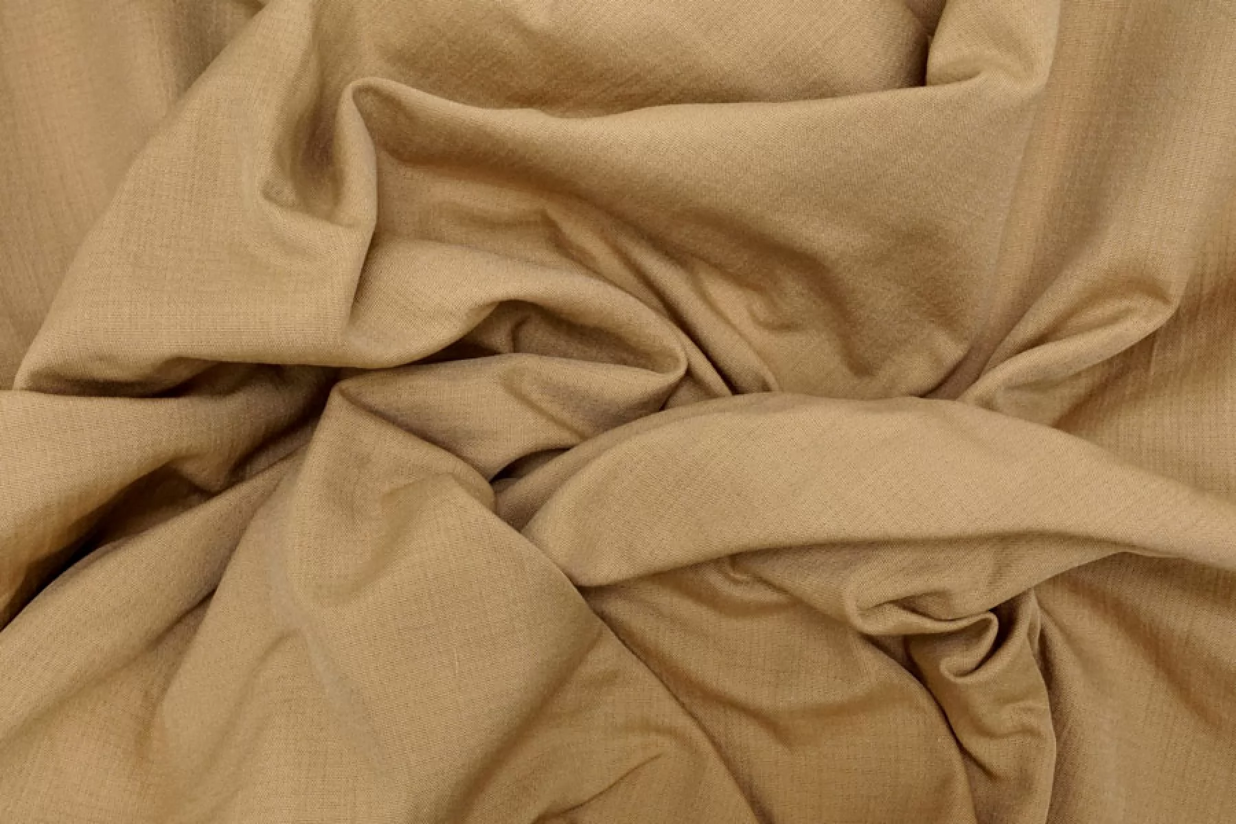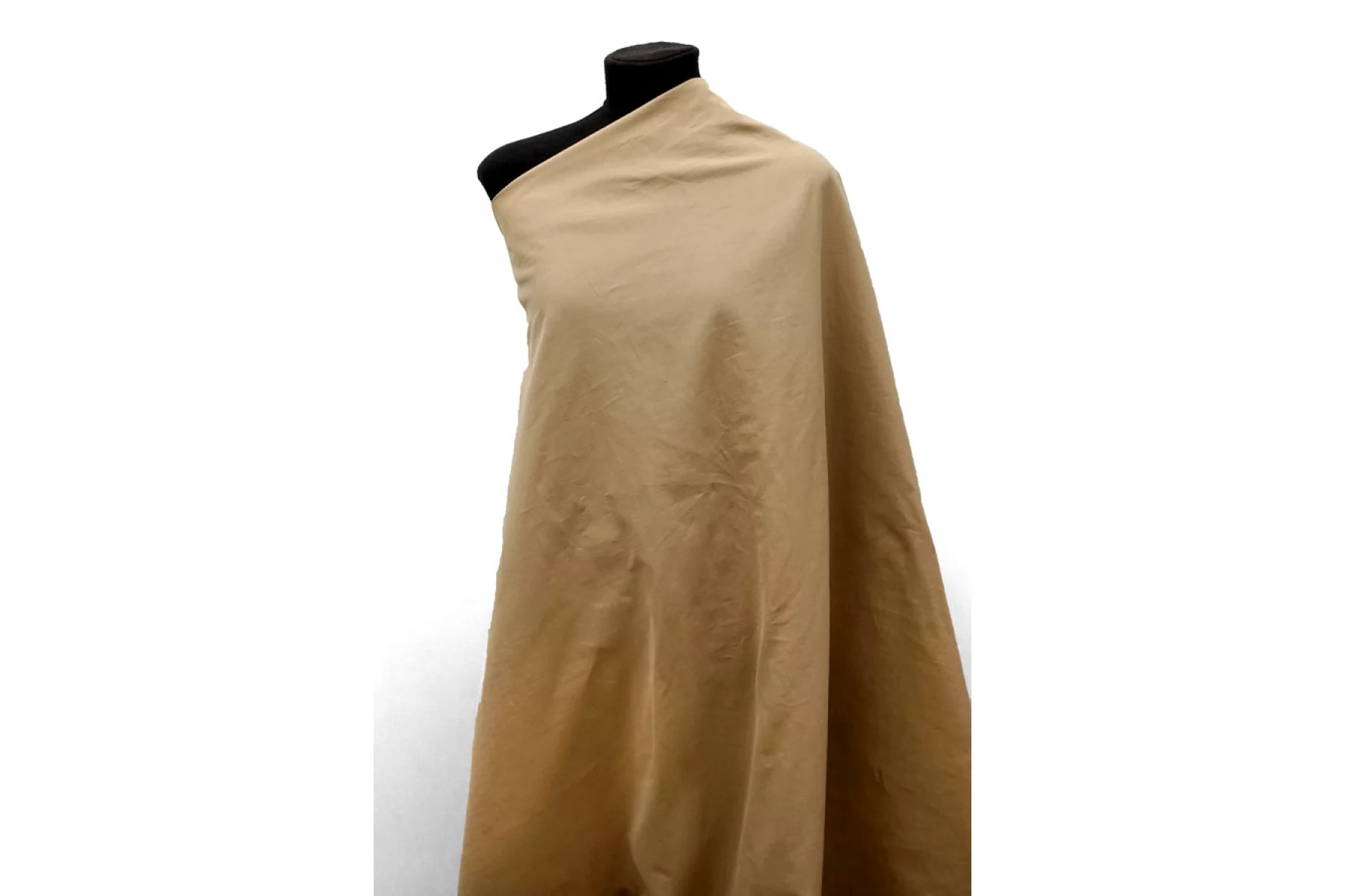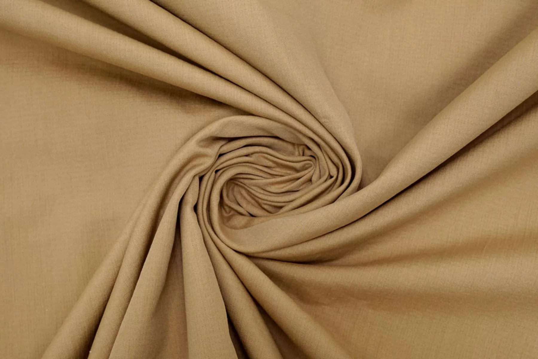 ВНИМАНИЕ! ЕЛЕ ЗАМЕТНОЕ ПЯТНО 5 СМ (В 30 СМ ОТ КРОМКИ) ПОВТОРЯЕТСЯ КАЖДЫЕ 1,5 М! Костюмно-плательный хлопок с добавкой льна от бренда Alberto Biani, в красивом, теплом песочном оттенке бежевого. Пластичный, но при этом формодержащий материал. Не тянется, не просвечивает. Мнется. Тактильно немного суховат, но без колкости. Прекрасно подойдет на платья, свободные рубашки верхнего слоя, юбки и формодержащие кимоно, летние костюмы.
