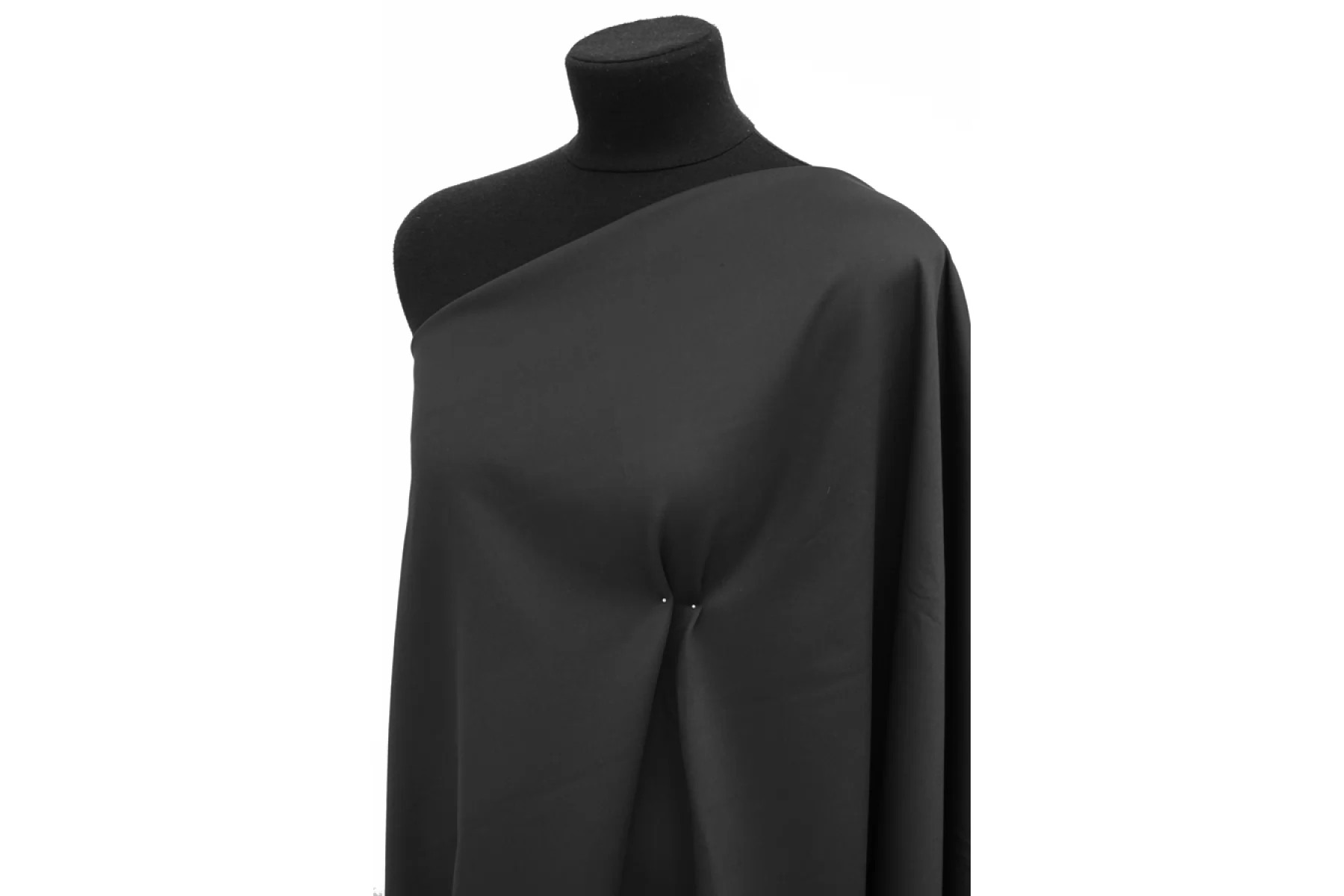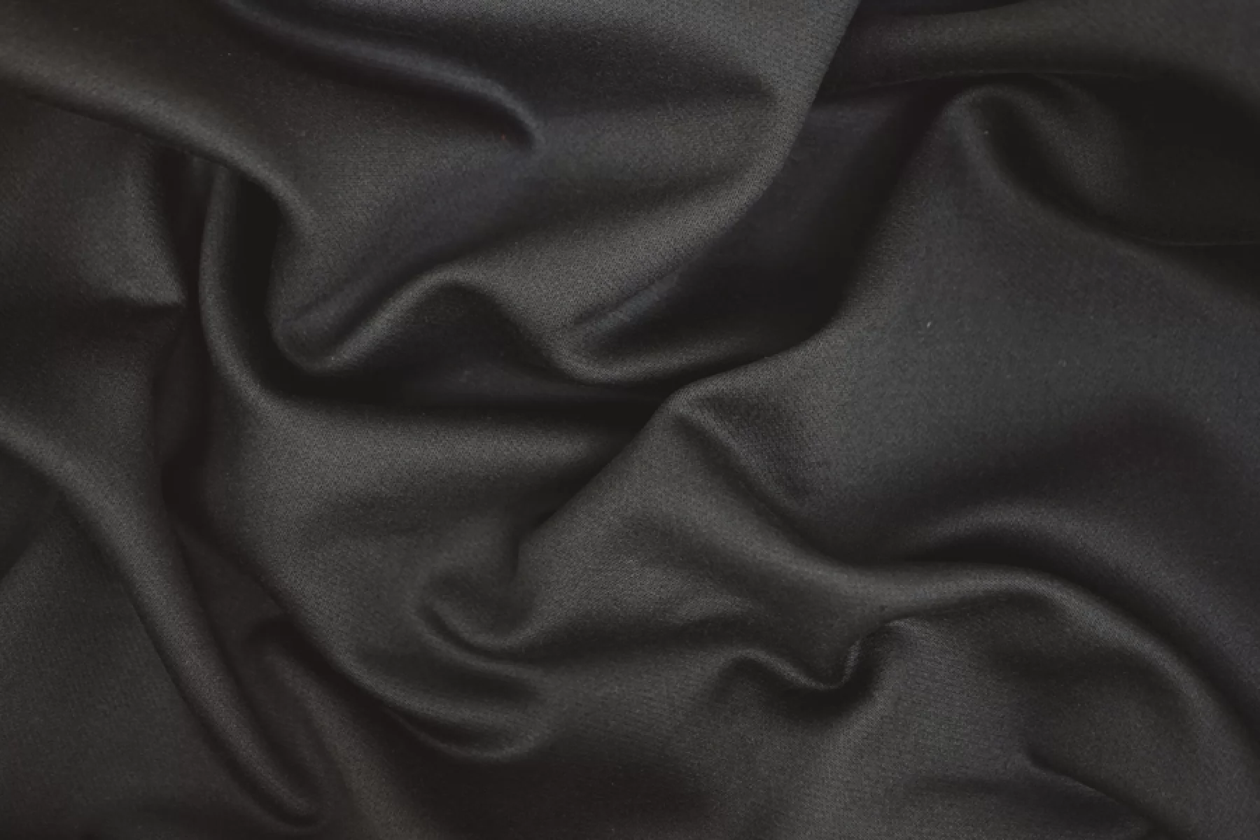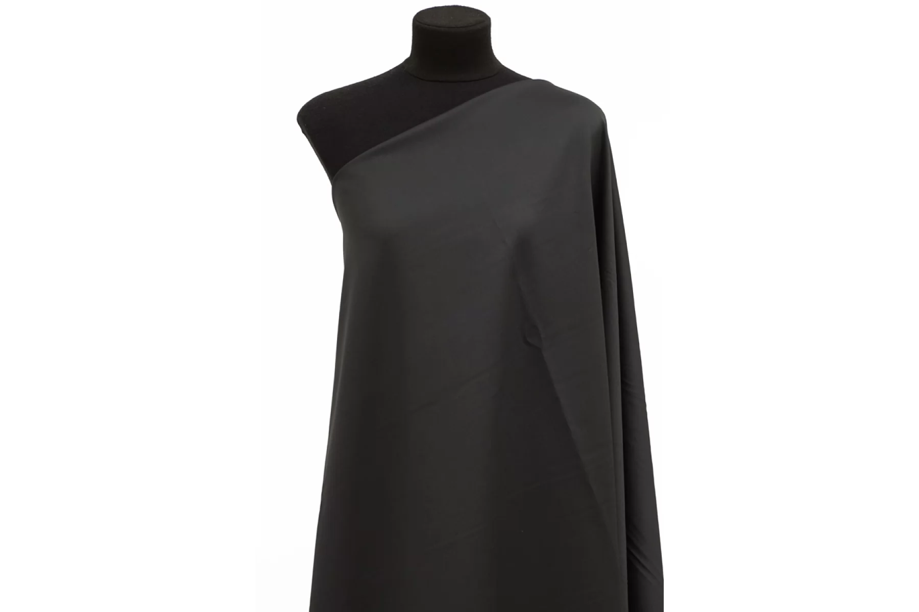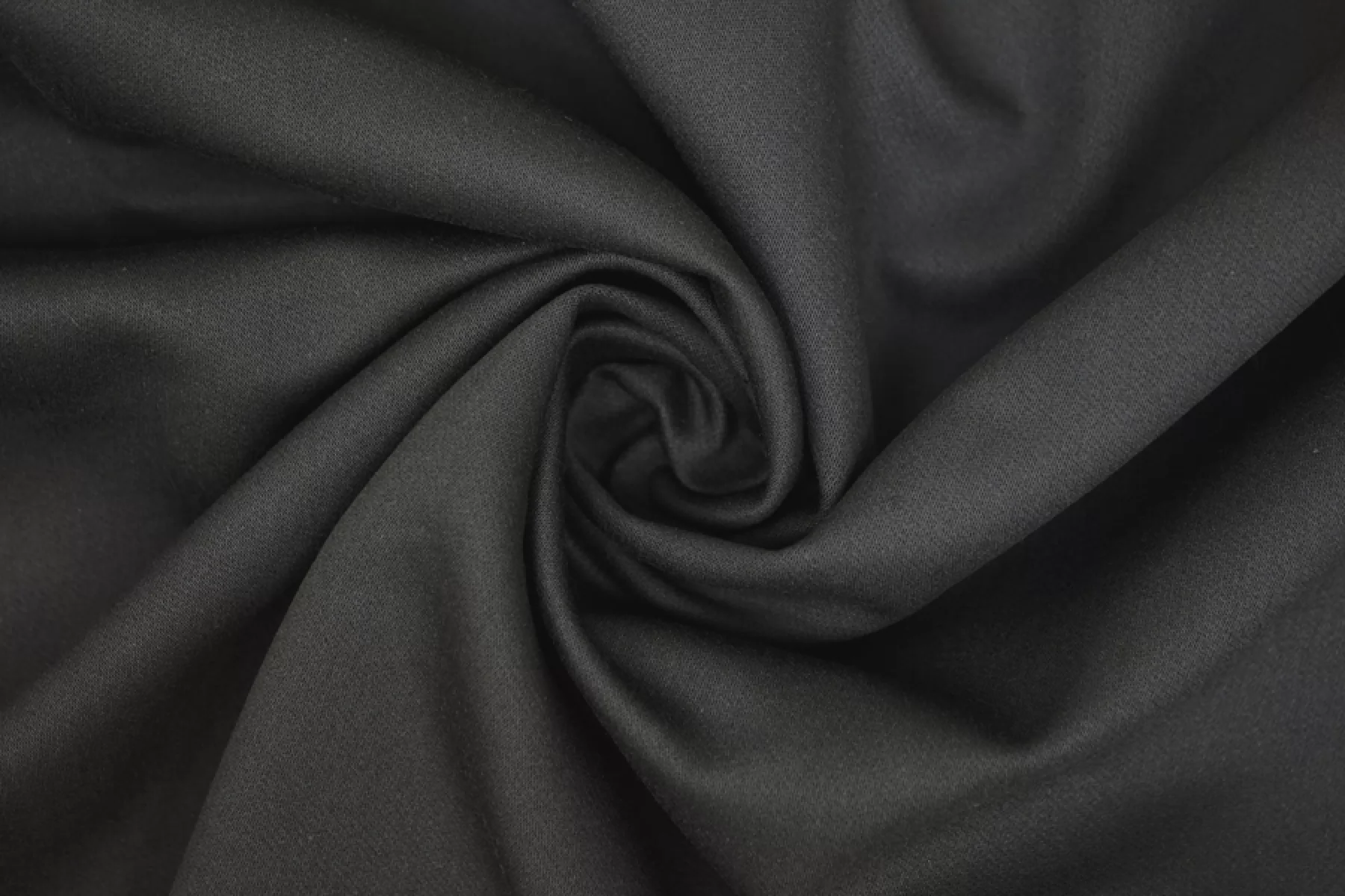 Костюмный хлопок в красивом черно-графитовом цвете. Плетение диагональное. Держит форму но при этом пластичный, тянется, не просвечивает. Хлопок плотный, лицевая поверхность мягкая, матовая. Подойдет для пошива костюма, платья держащего форму, тренча, юбки, брюк.